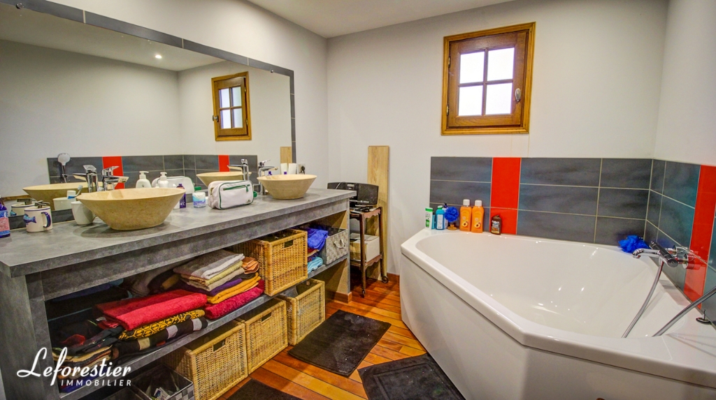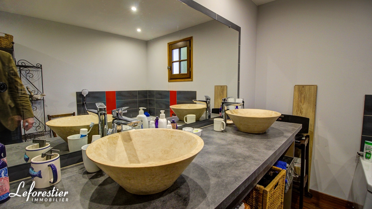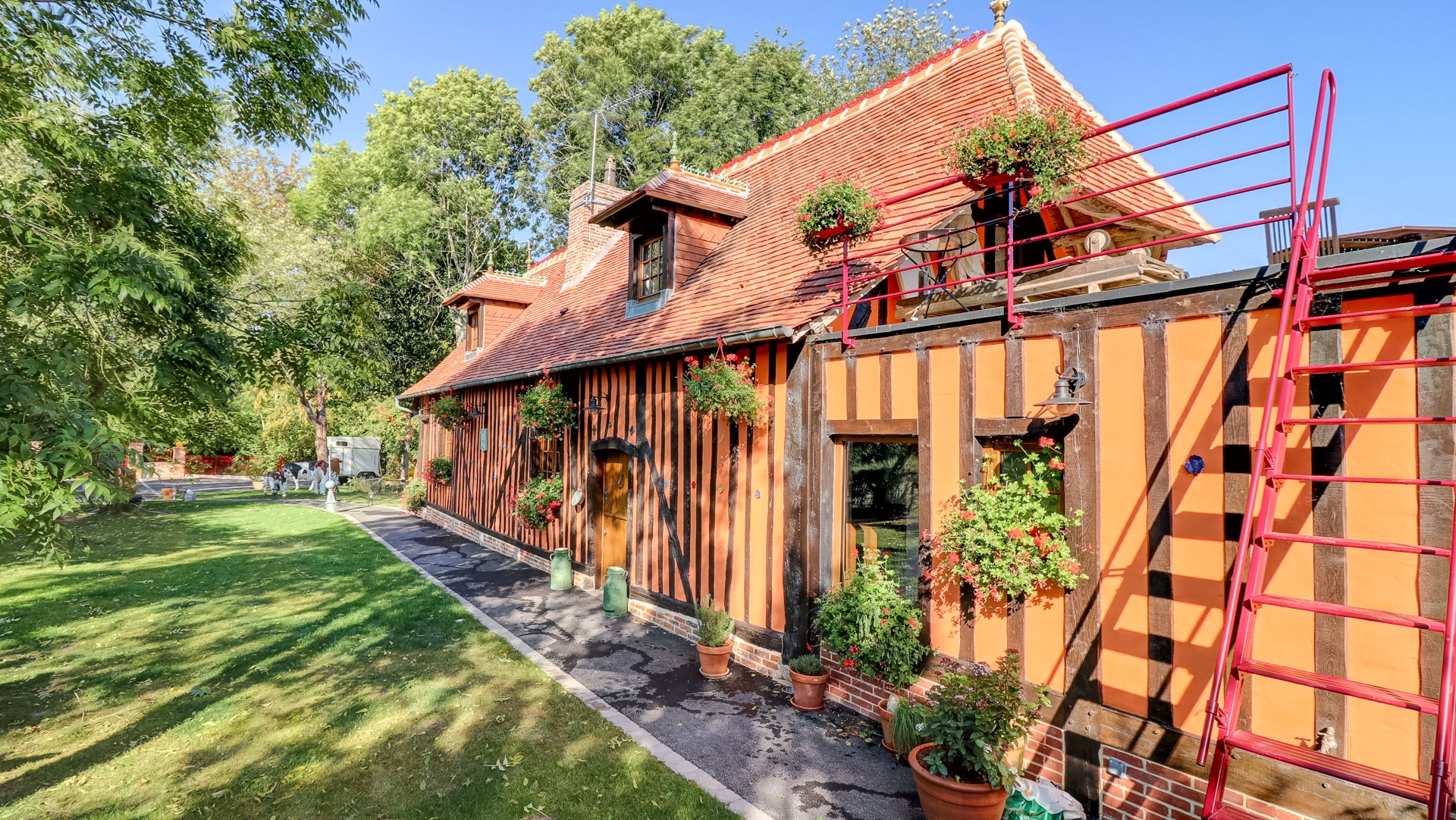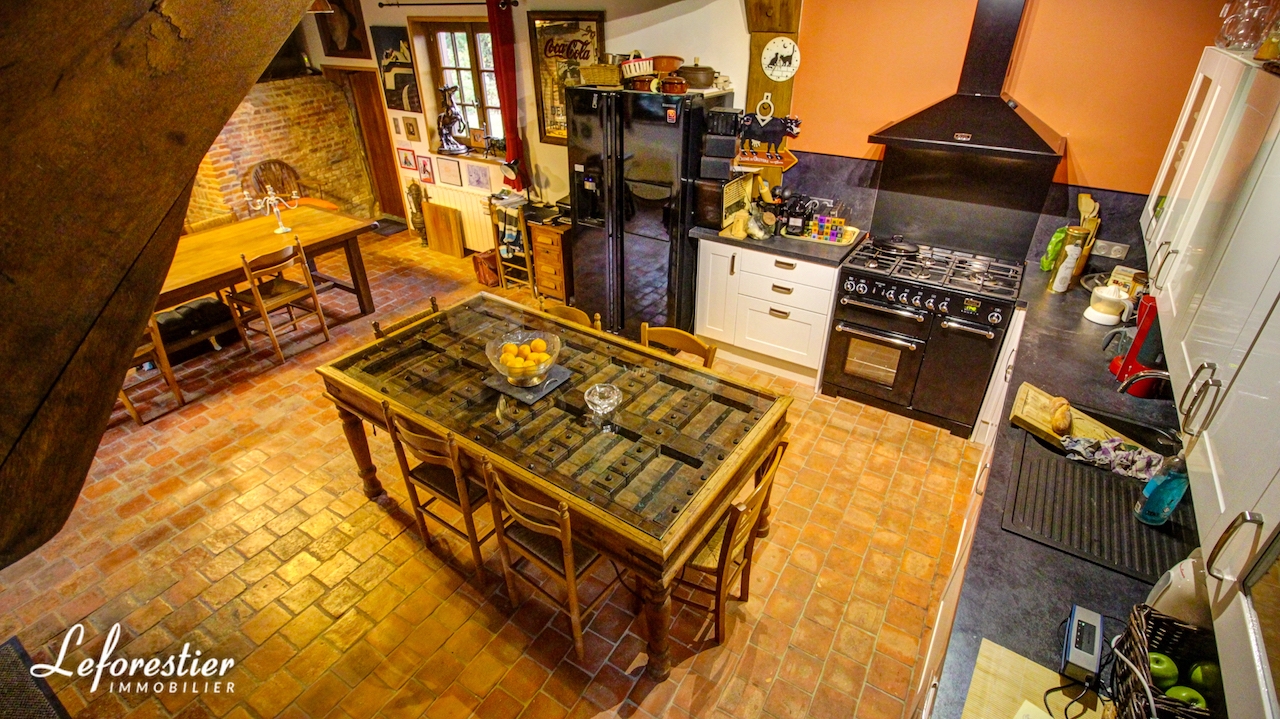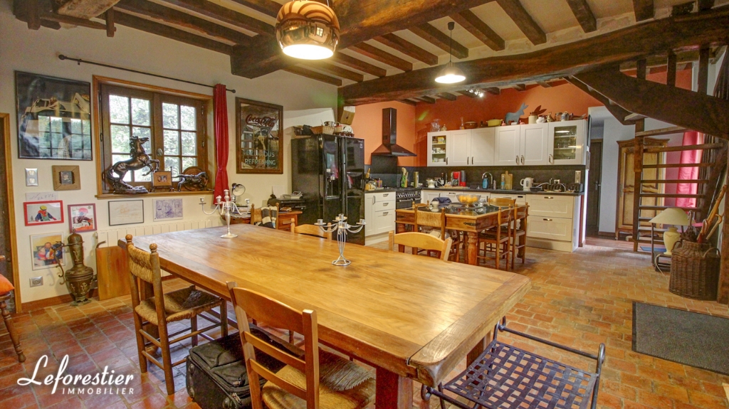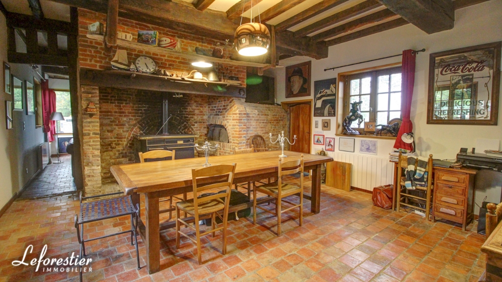 At the edge of the forest, this charming country house for sale has been renovated with the utmost respect, with noble materials. The real brick portal of Saint Jean immediately testifies to the character and care taken by the owner in the complete renovation of his property. While passing in front of the facade, the visitor finds that the beams and half-timberings were treated or changed. The between beams, red color "blood of beef", are there to take again the traditional colors chosen by our ancestors. The new tile roof of Bully is top quality, as are the ceramics on its ridge. In its lush greenery, surrounded by meadows planted with cider apple trees or graze peaceful Norman cows, the first impression is really very good.