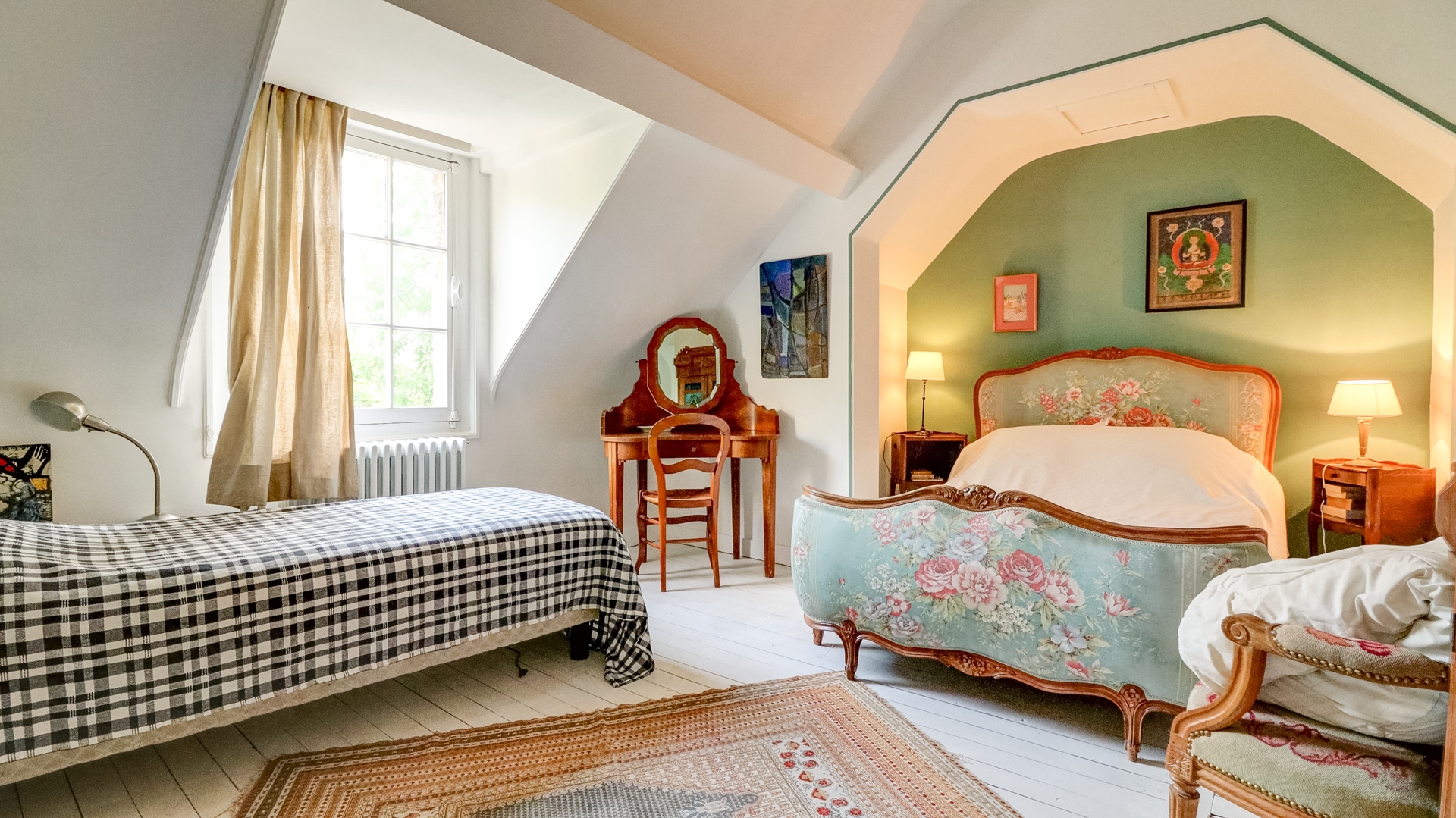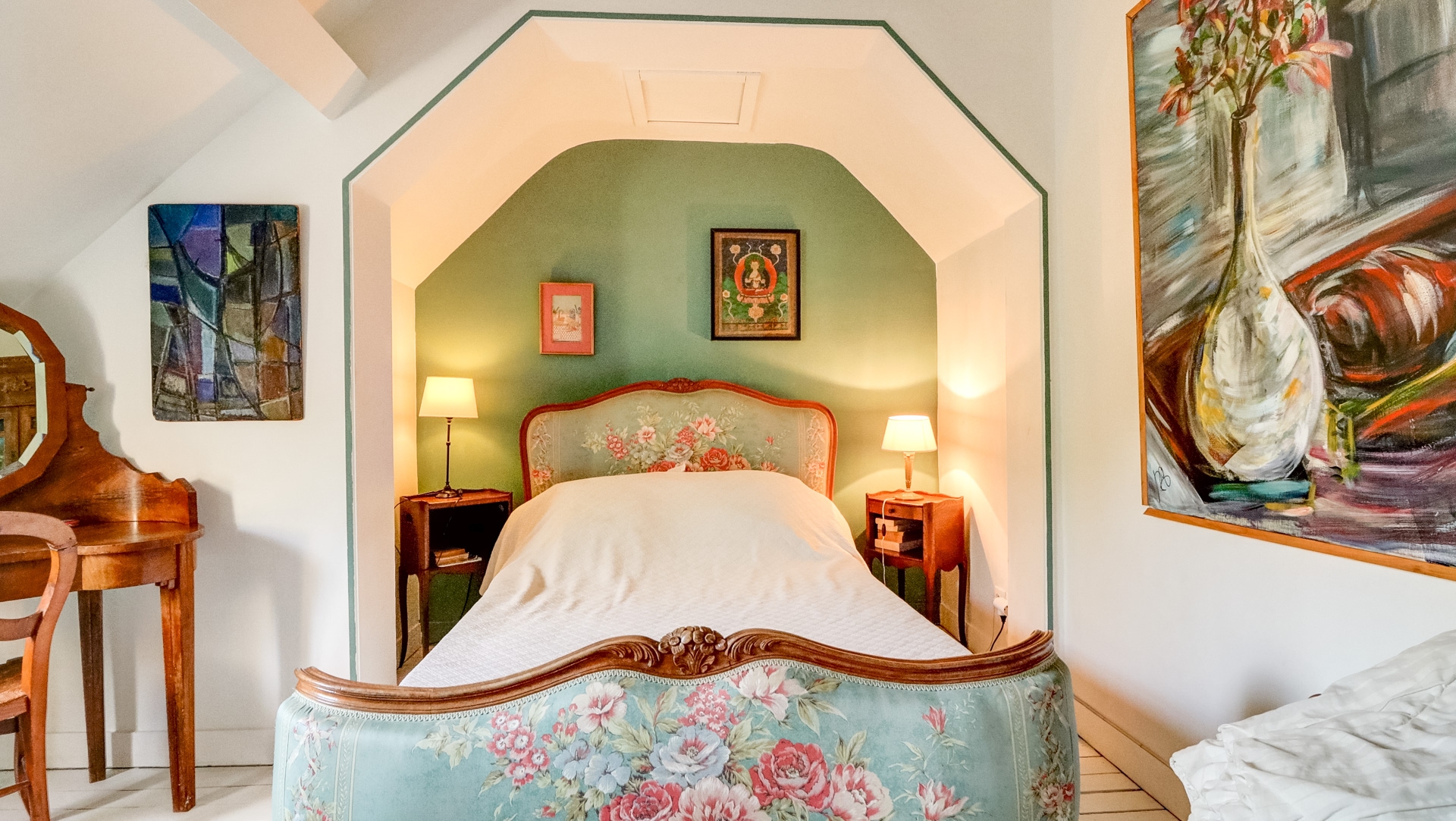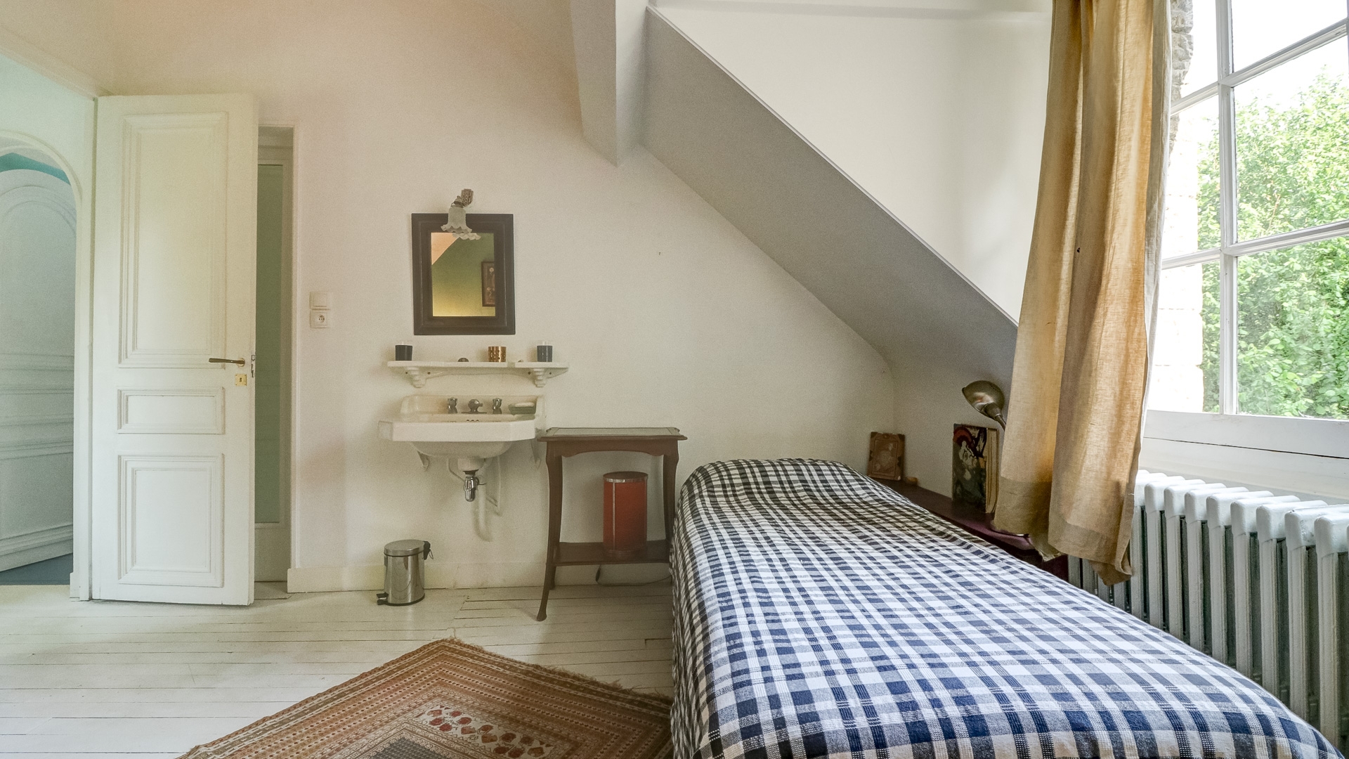 On the ground floor, the three living rooms have retained the original woodwork and floors. The large open kitchen is a place of conviviality. Family and friends meet there for long breakfasts. The village baker provides the breads and pastries that go well for Sunday morning brunch. From the living room, one reaches the gallery by which the monks went to the church. Today, it has become a covered terrace for dining under cover during wet evenings. The bedroom and the bathroom on the ground floor are reserved for parents who can come alone without children, without having to heat the floor. But the other four rooms will comfortably accommodate the family. An activity of guest rooms is possible, especially in the master bedroom which has a terrace lit by the rising sun.
