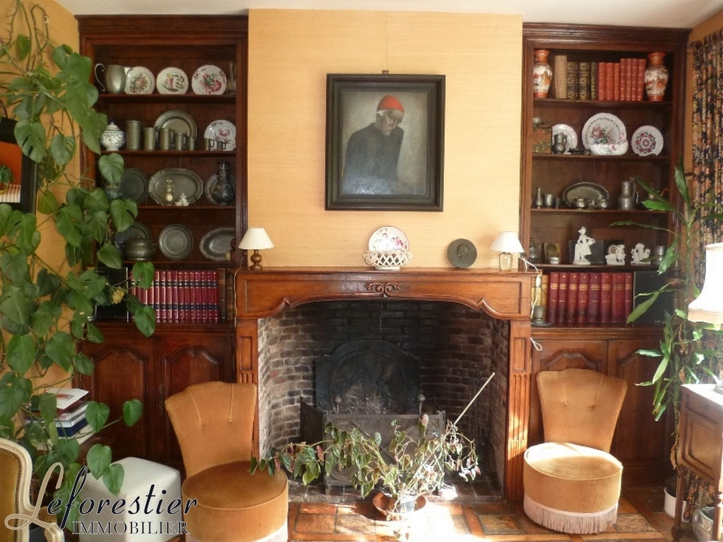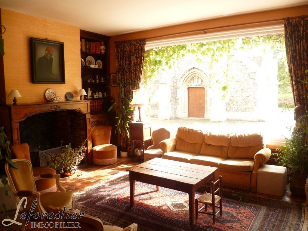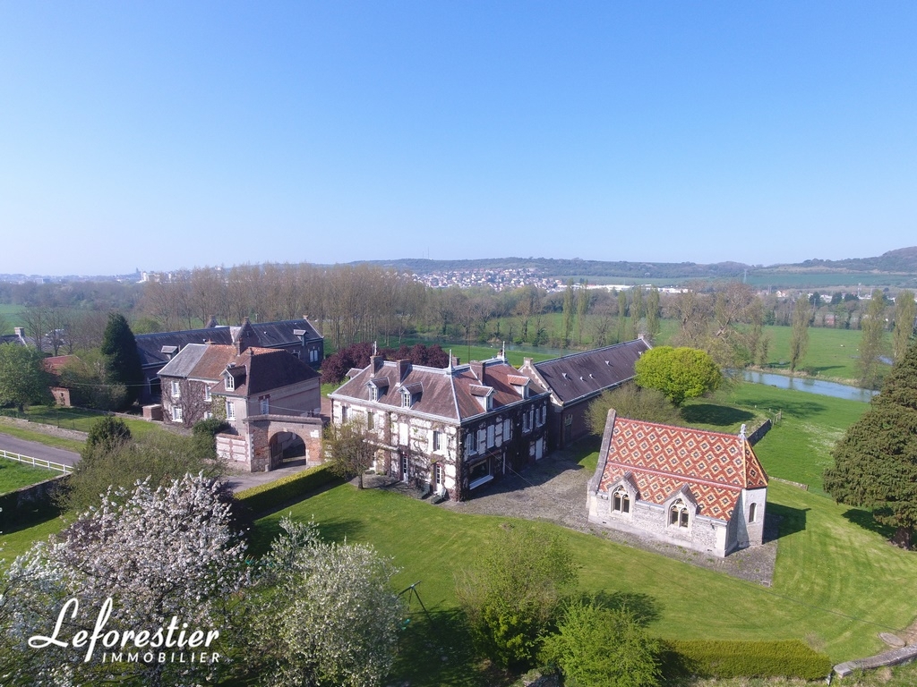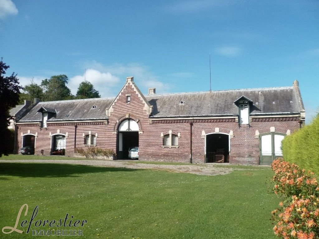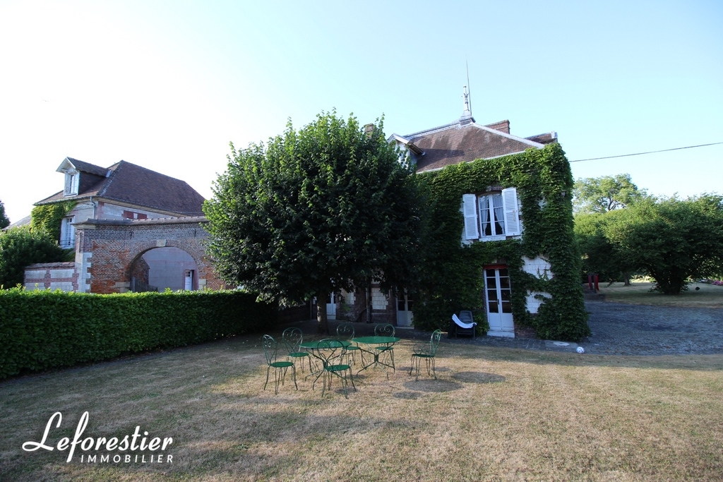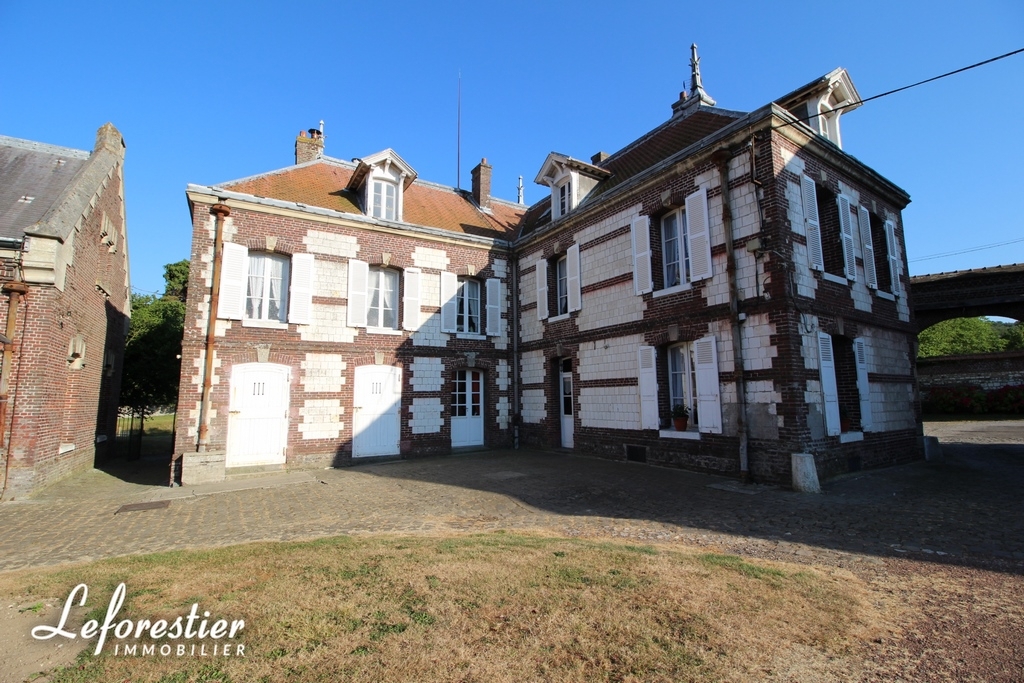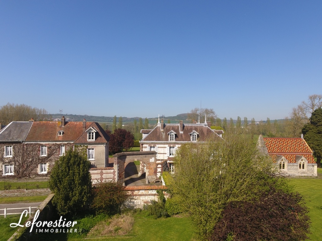 Overlooking the Bresle valley, the property is bordered by a small river which feeds the pond of the estate, 8 hectares of inconstructible meadows, an orchard, a wood, In the axis of the driveway that leads at the square court by a porch, we can see in the distance the belfry of of port city Le Tréport, with fishing, commerce and pleasure activities.