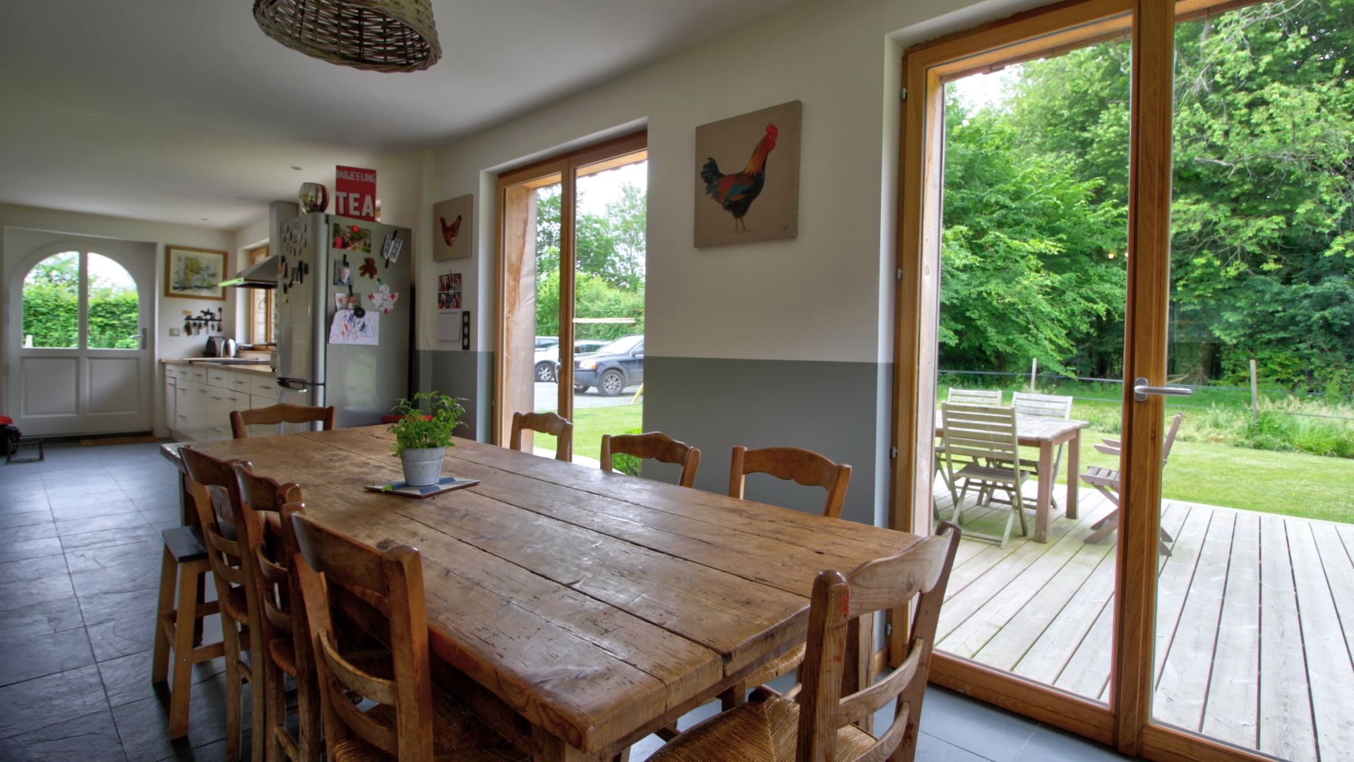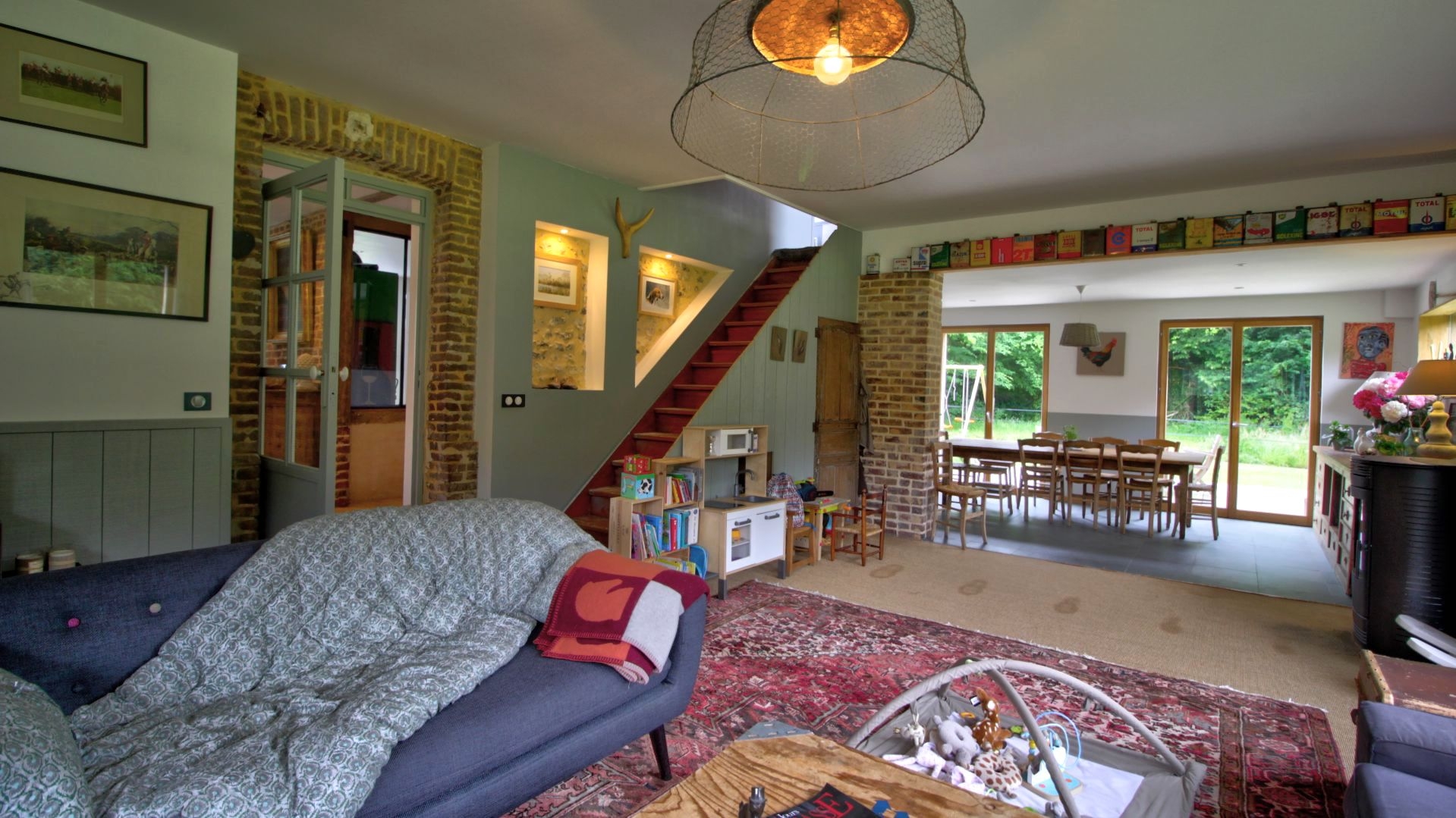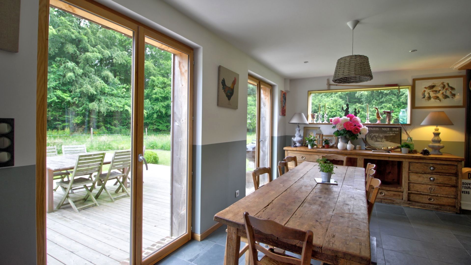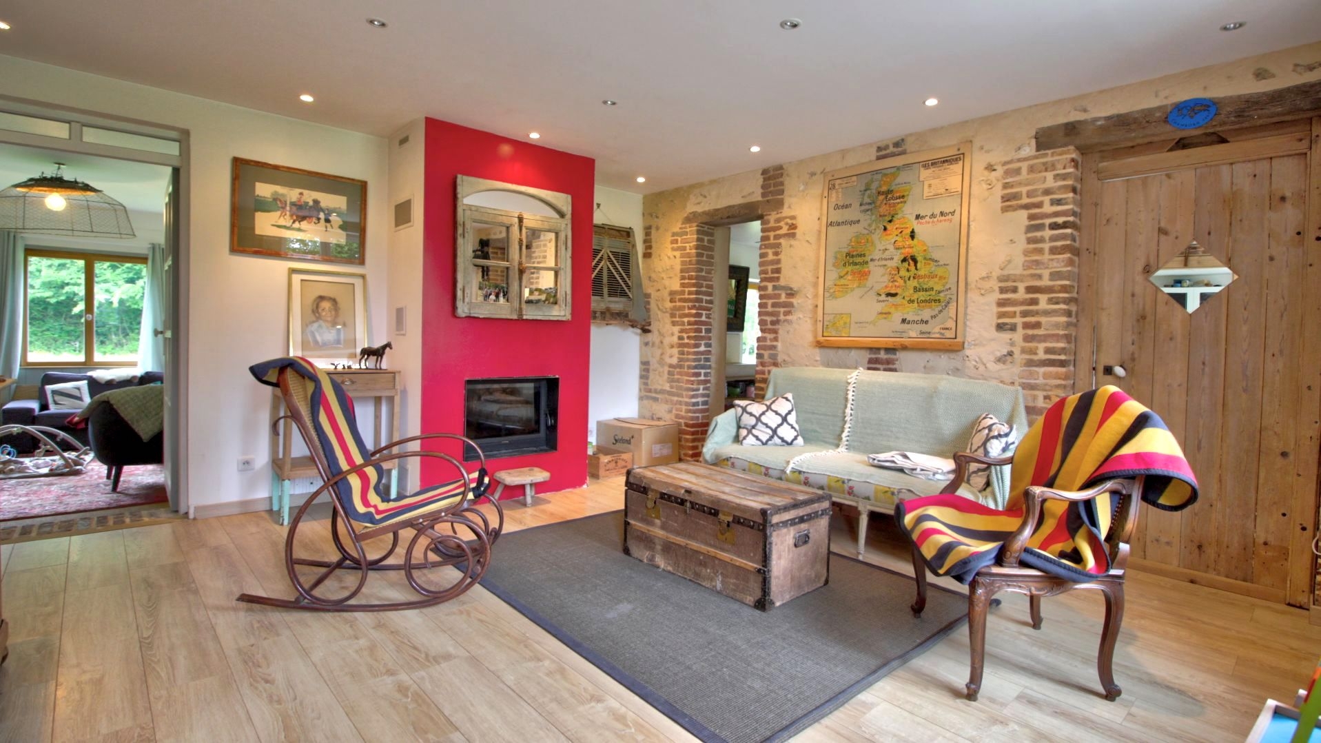 At the edge of the forest, offering immediate access to the hiking trails, our authentic hunting house has been tastefully renovated and enlarged by a timber frame extension of the best effect, in a subtle mix of old and contemporary. The old house of character is built partly of a brick of Saint-Jean which holds its red-orange color of the nature of the Normandy clay and the technique of cooking with fire of wood. Flints were extracted from pebble veins in the immediate vicinity. To access this haven of peace, we must leave the charming road of the Varenne Valley dug many ponds full of fish, and climb a winding road to the edge of the forest of Eawy. The location is exceptional. Bordered on one side of a meadow or graze pretty Norman cows, the place is made for nature lovers. Obviously, in the early morning, lovely does come frequently to graze the grass of the neighboring meadow planted with apple trees of Normandy. An upstairs terrace has even been built to observe the animals without disturbing them. From mid-September to mid-October, during the mating season, the deer slams to intimidate its competitors and impose its territory of seduction.