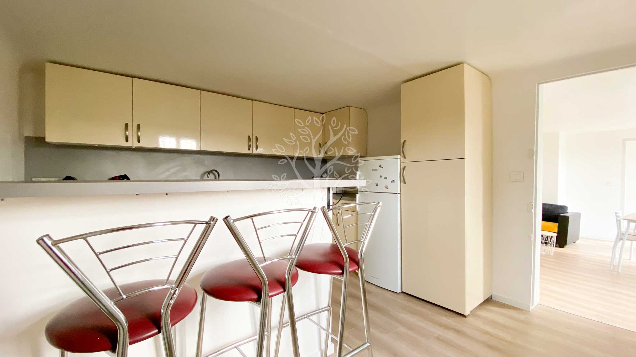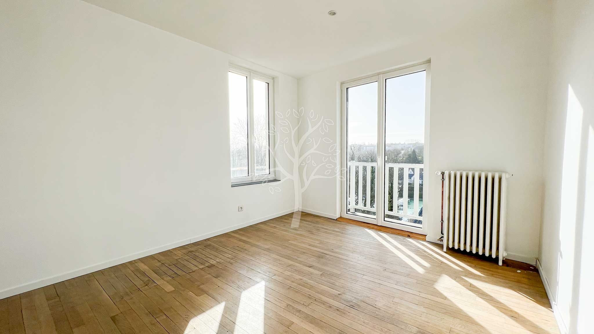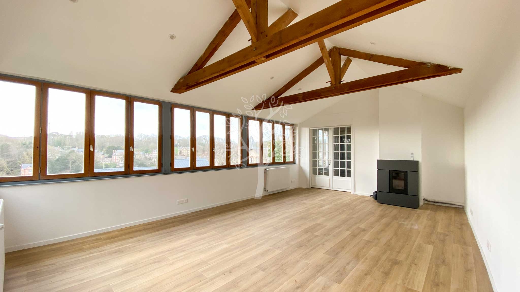 Le grand appartement (duplex) de 85 m2 est baigné de lumière notamment dans la pièce de vie grâce aux nombreuses fenêtres. Les poutres apparentes apportent une très belle hauteur sous plafond et le poêle à granulés diffuse une agréable chaleur.