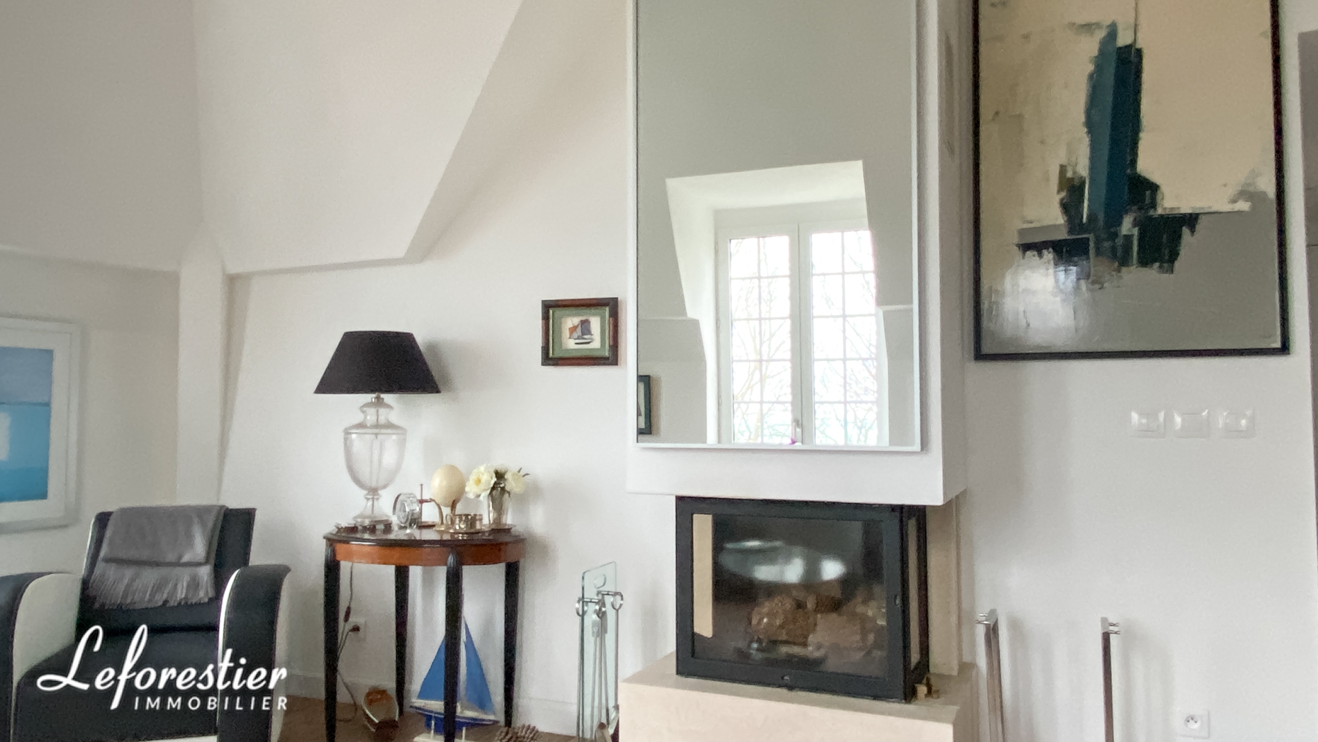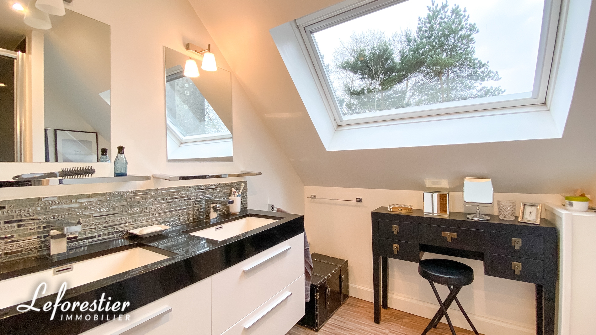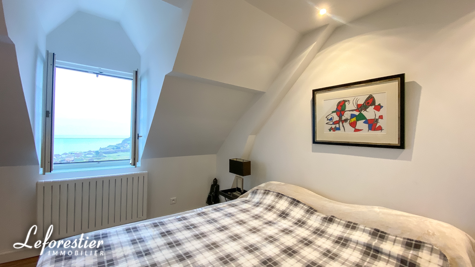 La chambre principale offre un point de vue tout aussi magnifique. Salle d’eau fonctionnelle avec double vasque, douche et toilettes. Sous les toits, la seconde chambre permet d’installer 2 lits simples. Depuis ce dernier étage, toutes les vues sont intéressantes sur la vallée, les arbres, les jardins des autres demeures anciennes, le village typique de bord de mer de Pourville. Deux caves privatives en rez-de-jardin offrent également un espace supplémentaire de rangement. Les stationnements sont derrière la maison.