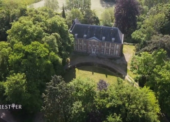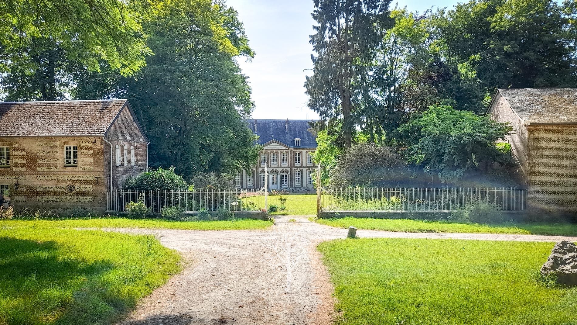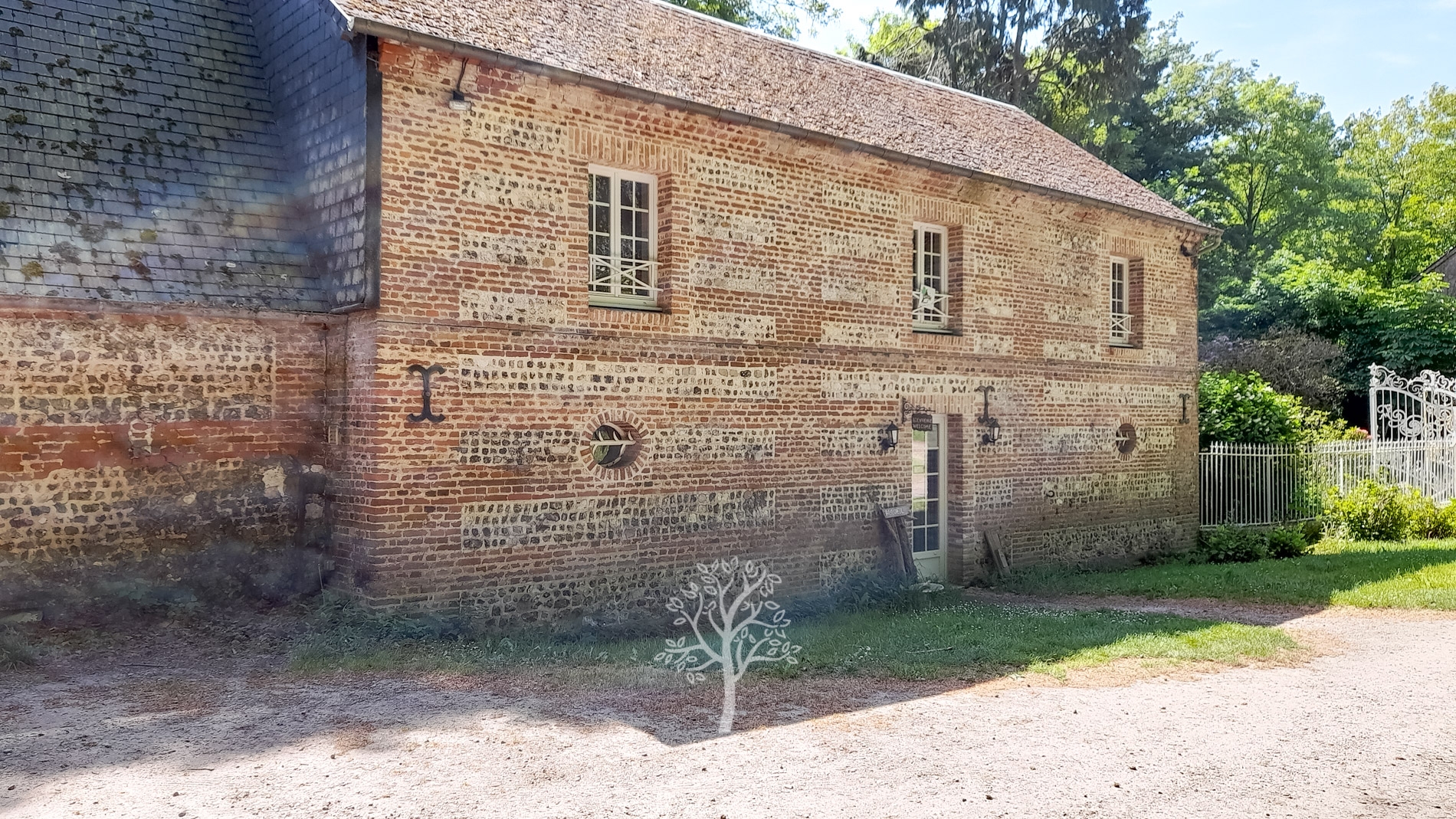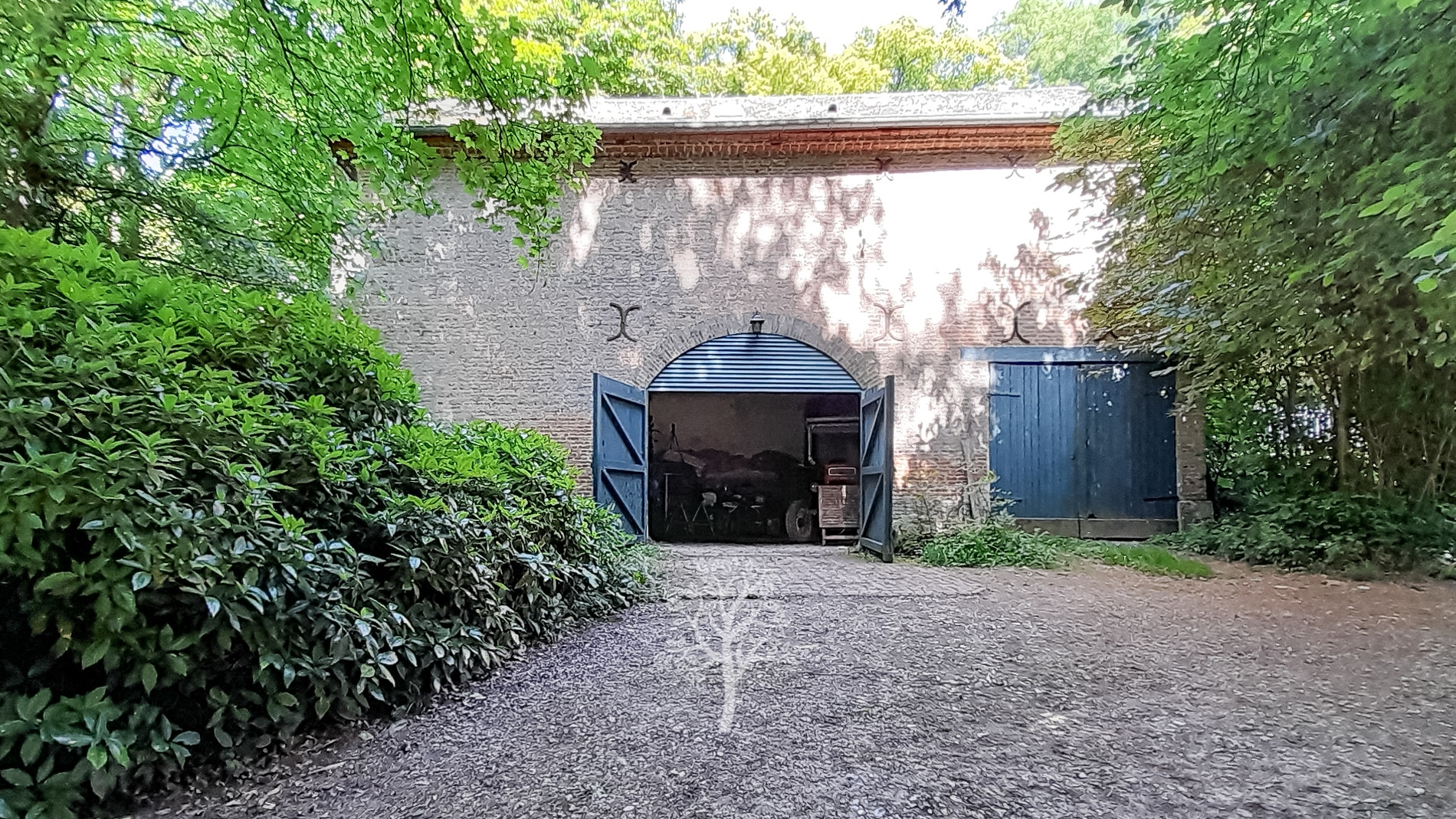 La découverte de cette propriété au caractère unique se fait par une route de campagne qui se prolonge dans le bois privé du domaine à vendre. Au bout de la route, les visiteurs peuvent se garer sur un parking aménagé devant l’ancienne grange. Ce beau bâtiment construit en briques et silex a été réhabilité très récemment, conformément aux normes en vigueur, pour accueillir du public. Pour accéder au parc du château, séparé des bois par une enceinte, il faut franchir un monumental portail en fer forgé.