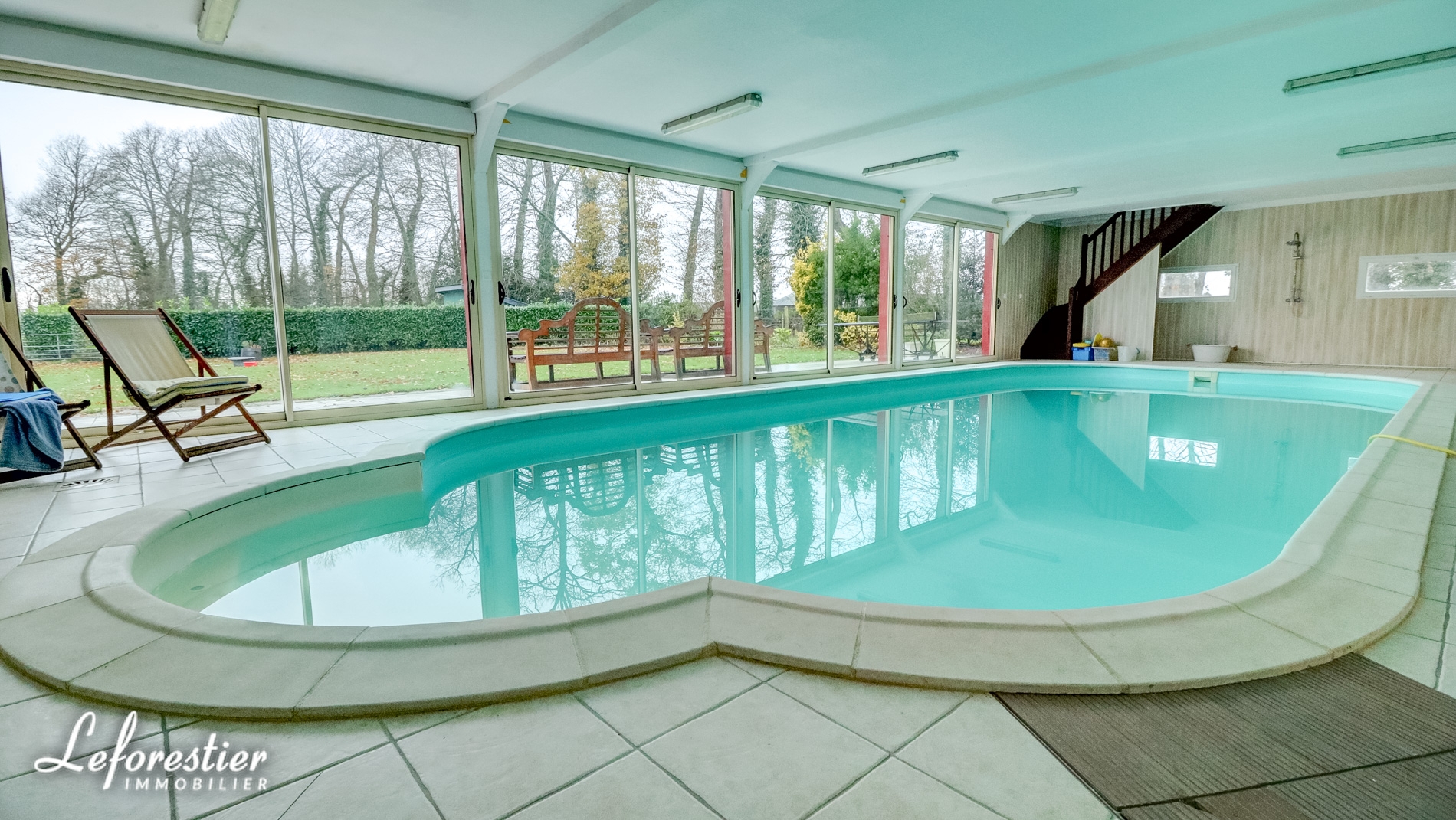 A l’étage, les 8 chambres sont confortables et au calme. La piscine couverte et chauffée profitera à la famille et aux amis. La vue de l’étage vers la campagne environnante invite à la détente et donne envie de parcourir les chemins de randonnée. La couverture récente en ardoise naturelle respecte l’authenticité de cette belle propriété de caractère.