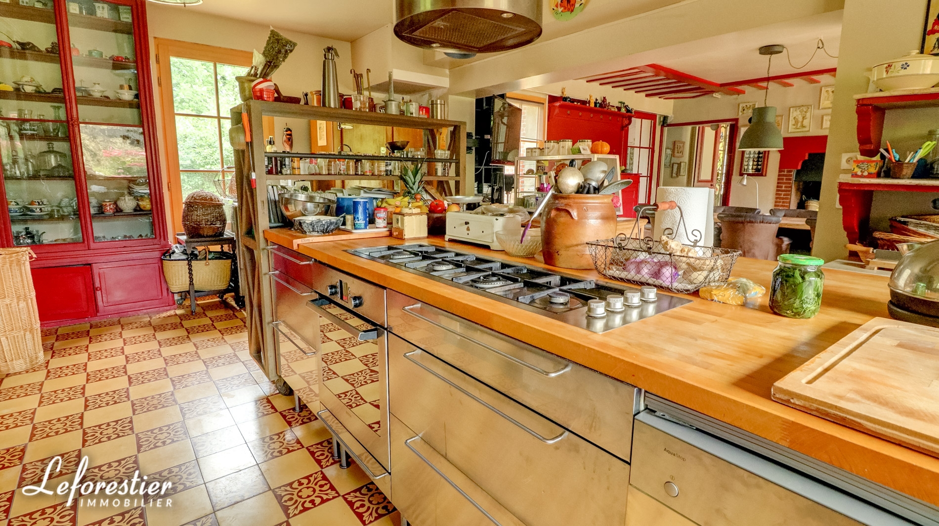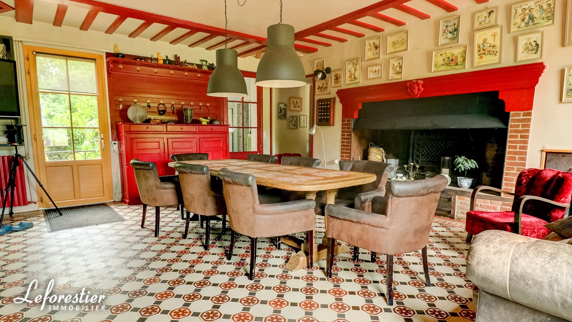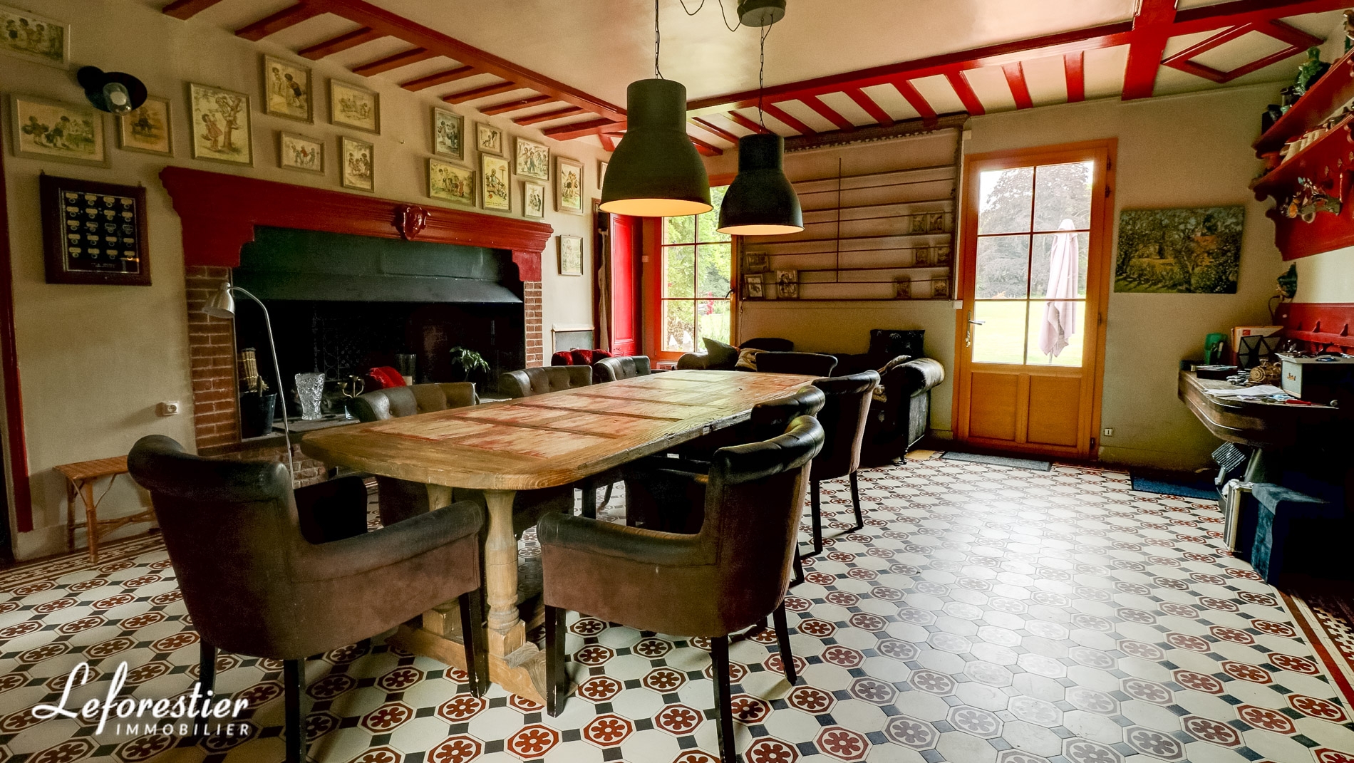 La grande cuisine est conviviale avec une cheminée monumentale et des carreaux de ciment au sol.