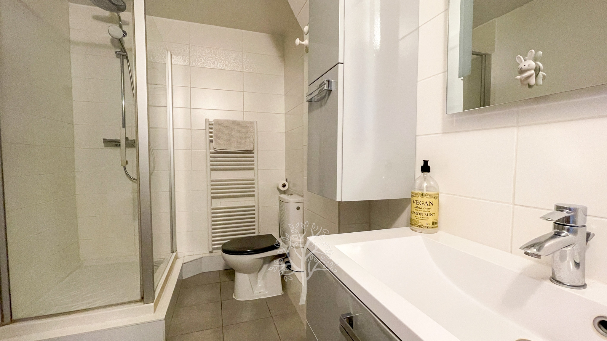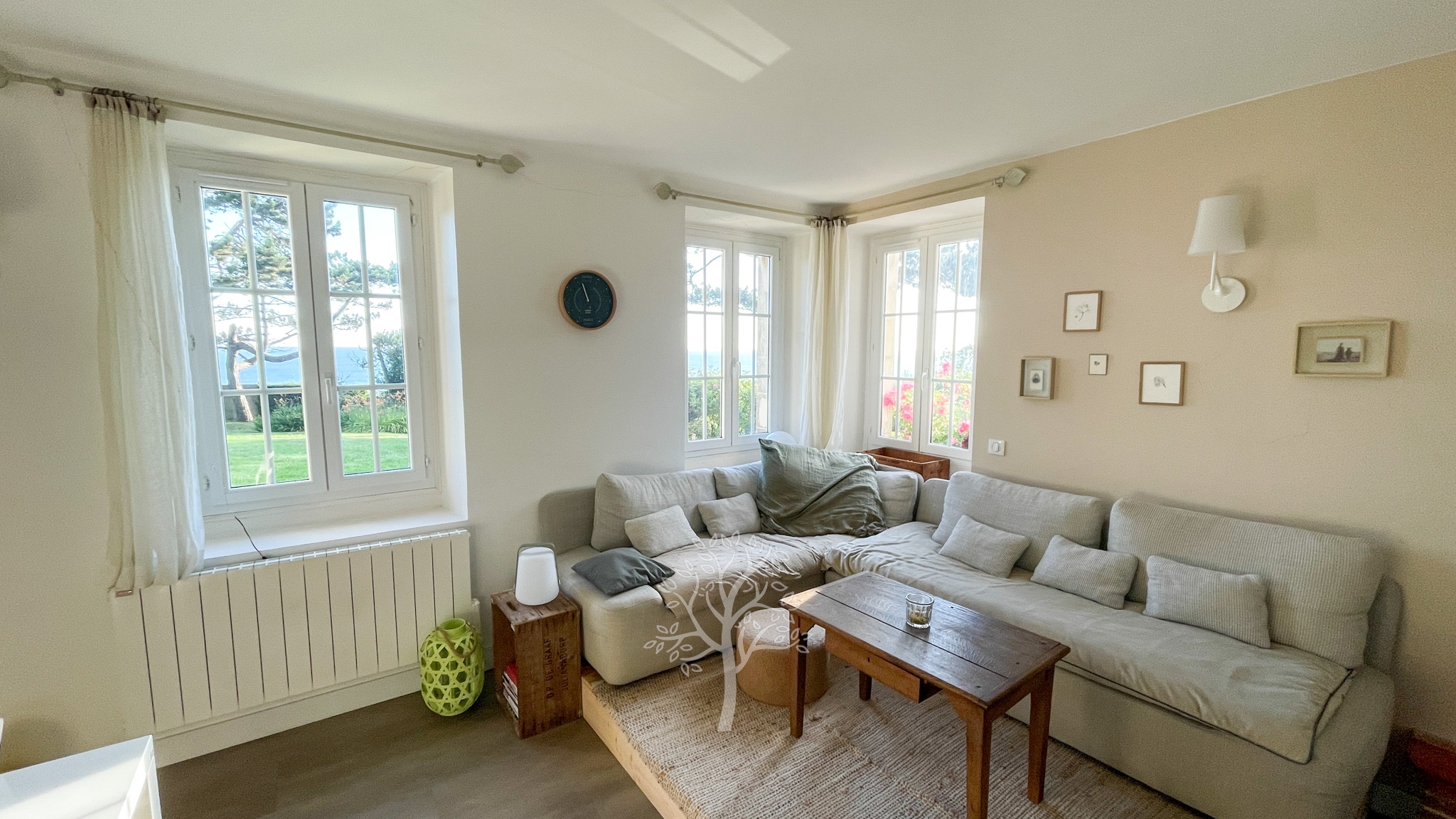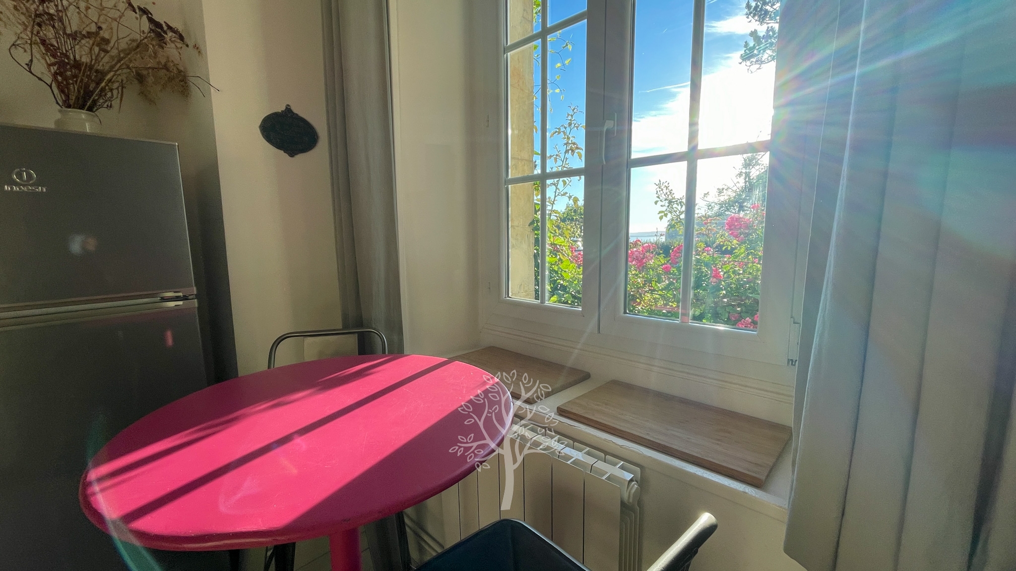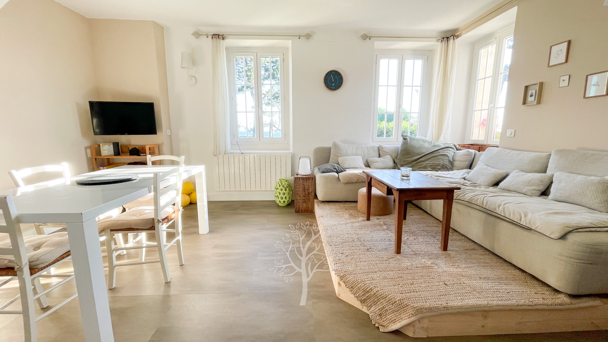 Cet appartement se situe au rez-de-chaussée de la copropriété. Récemment restauré il se divise en plusieurs pièce de vie : La salle à manger / salon est une grande pièce très agréable bénéficiant d’une vue dégagée sur ses trois fenêtres. La petite estrade côté salon permet de profiter de la vue et le poêle à bois assure une chaleur intense pendant l’hiver. Les deux chambres sont aménagées avec soin. La cuisine elle aussi dispose d’une vue mer et le mange debout est là pour en profiter au cours de repas.