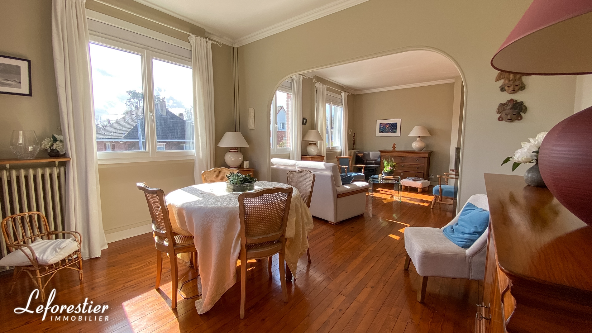 Cette maison est à 10 minutes à pieds du centre ville, dans un quartier résidentiel recherché sur l'esplanade de Dieppe, agréable maison ensoleillée sur un terrain de 500m². Environnement calme et tranquille. La maison est lumineuse et exposée sud ouest, séjour salon avec cheminée et parquet, cuisine salle à manger ouverte sur le jardin et terrasse. Chambre ou bureau au rez de chaussée. A l'étage, avec belle vue dégagée , 2 chambres avec parquet, placard, salle de bains . Au second avec escalier privatif, chambre avec lavabo. Un sous sol complet en rez de jardin offre un coin chaufferie et buanderie, une partie atelier. De chaque côté, 2 garages pour 1 véhicule. A ce niveau, 1 chambre et salle d'eau peuvent aisément être créer grâce à une fenêtre ouvrant au niveau jardin. Sur la parcelle, un bâtiment indépendant de 25 m² à usage de garage avec ouverture sur la rue. Le prix indiqué comprend les honoraires à la charge de l'acquéreur de 8 500.00 euros. N'hésitez pas à nous contacter par email ou la personne en charge du dossier par téléphone : Laurence Romefort au 06 87 76 05 86. |