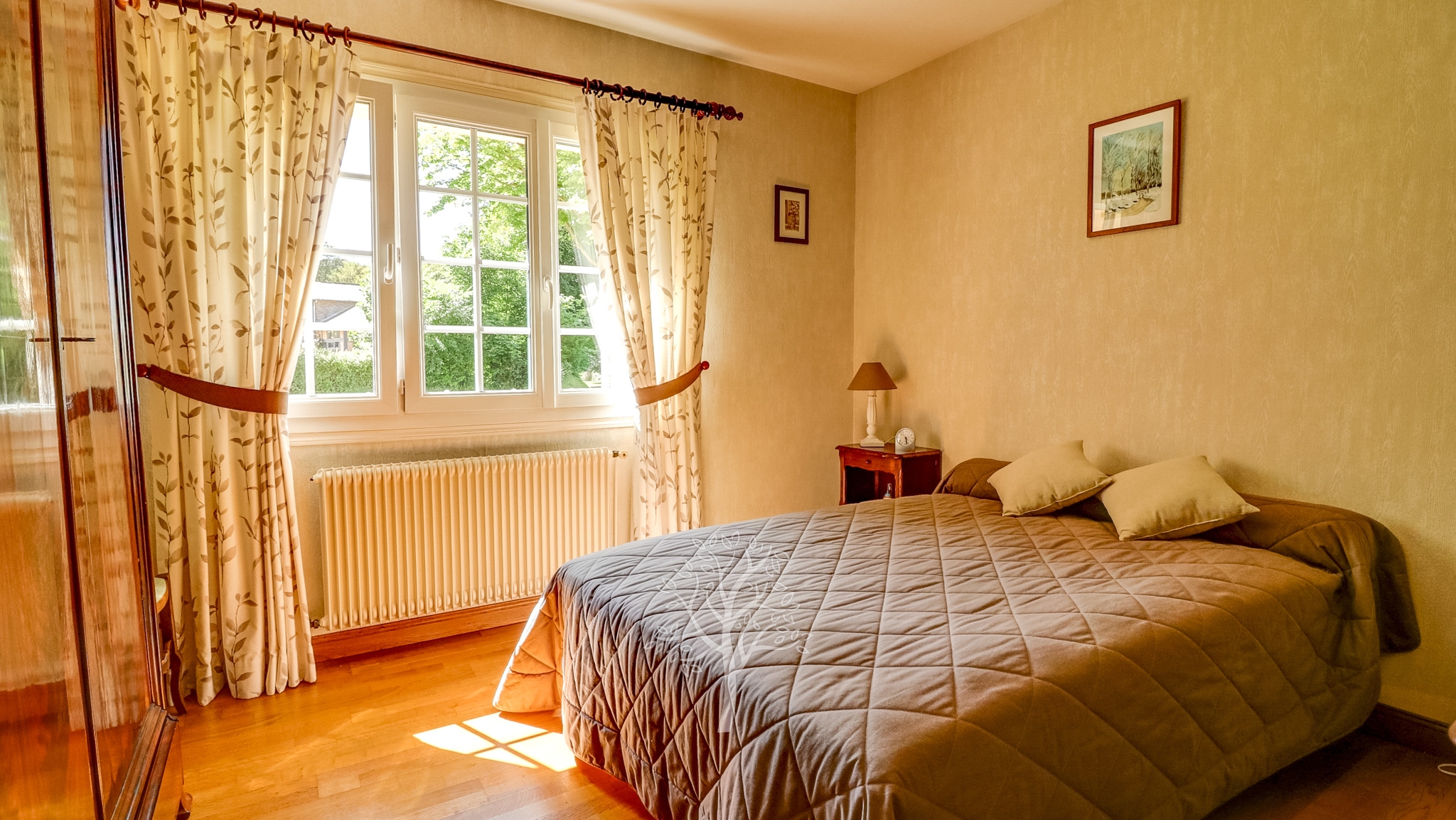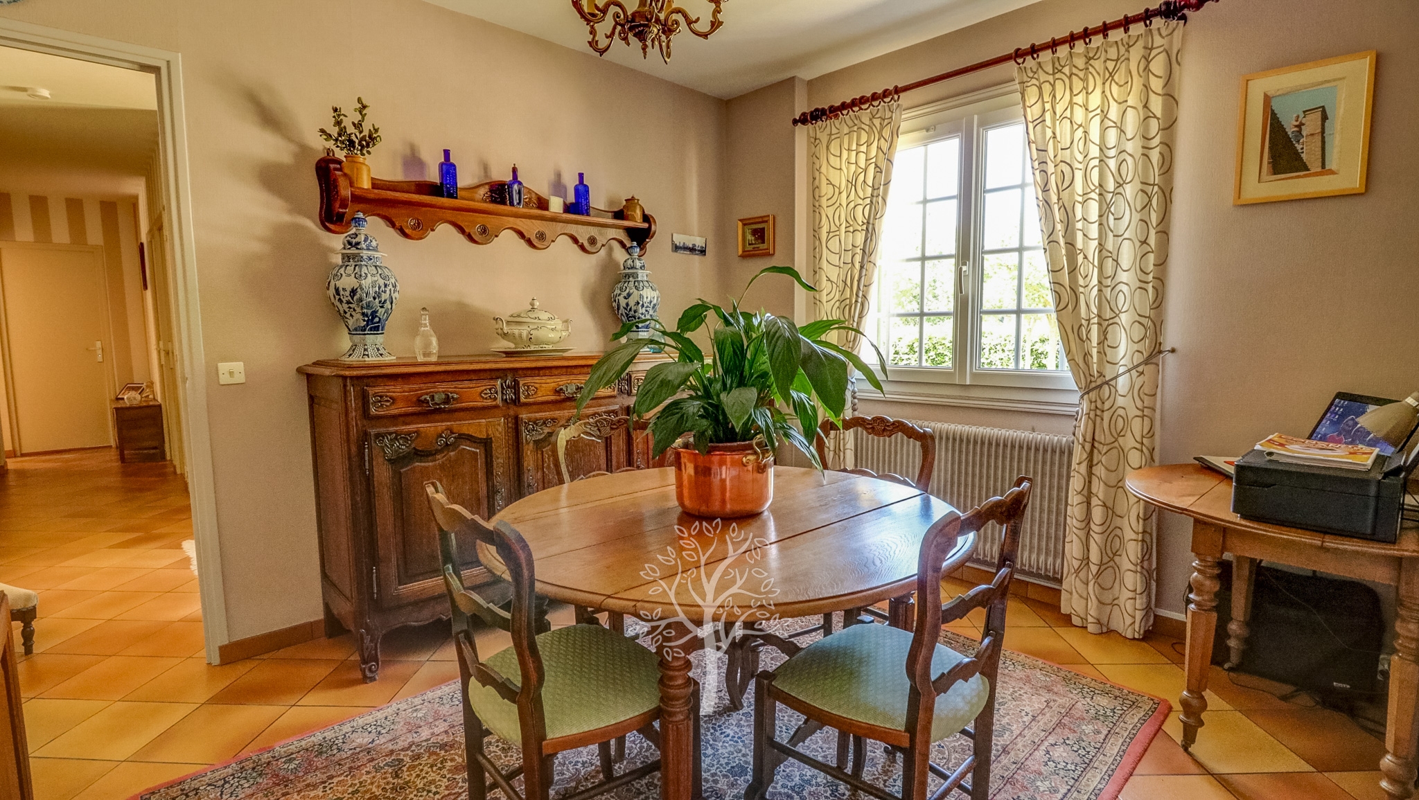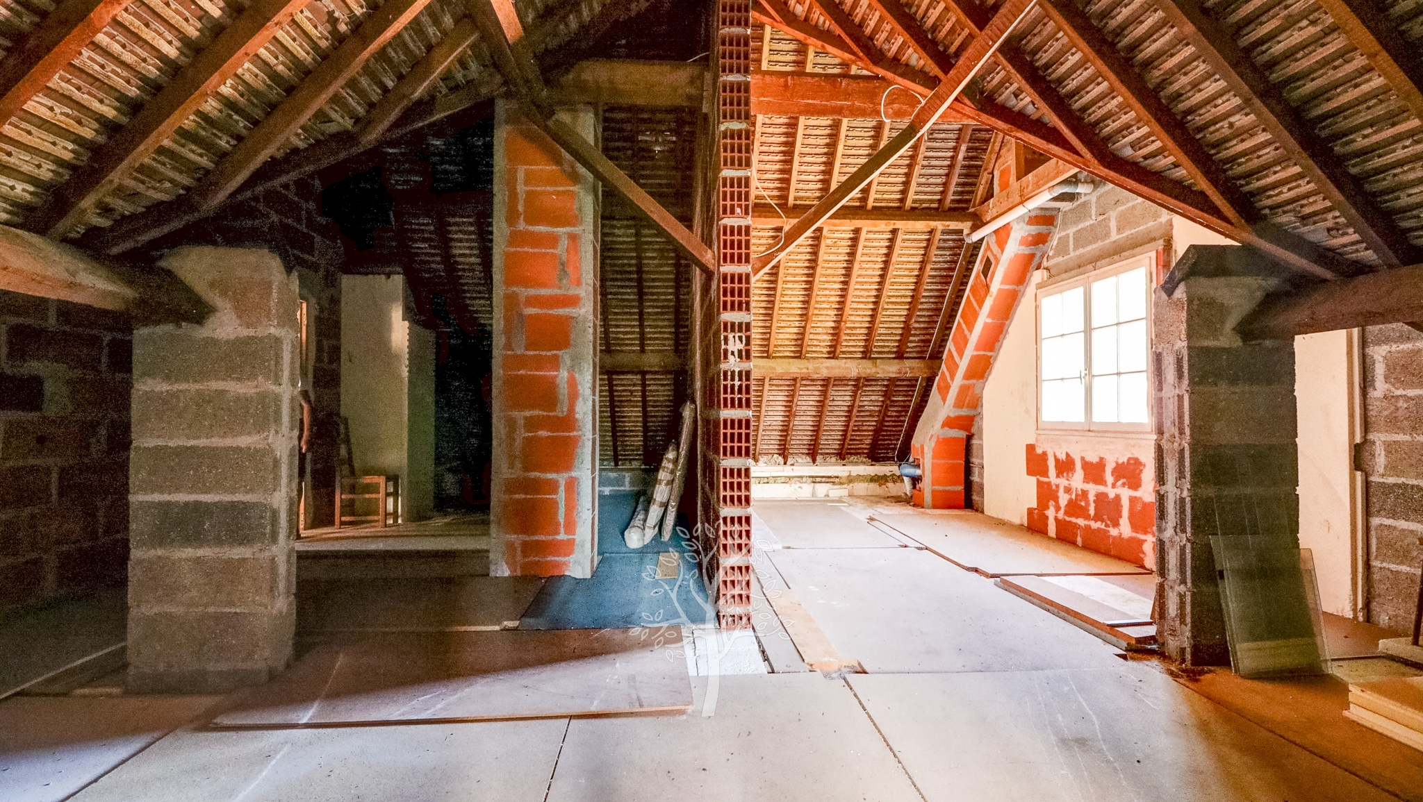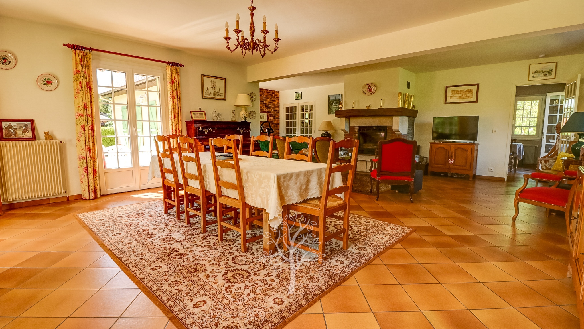 De l’entrée, le visiteur découvre un immense séjour doté de nombreuses ouvertures où la lumière pénètre abondamment. Durant l’hiver, la grande cheminée complète harmonieusement le caractère apaisant de cette vaste pièce où des grandes réceptions familiales ou amicales sont organisées. Auprès de la cuisine, une salle à manger s’offre pour les petits déjeuners ou les dîners plus intimes. Les trois chambres et la salle de bain du rez-de-chaussée ont suffi à la famille des propriétaires. Toutefois, l’escalier et les ouvertures de l’étage attendent un aménagement de trois chambres supplémentaires, d’une ou de deux pièces d’eau, d’un appartement indépendant ou encore d’une vaste bibliothèque-vidéothèque-salle de jeux. Le potentiel est là.