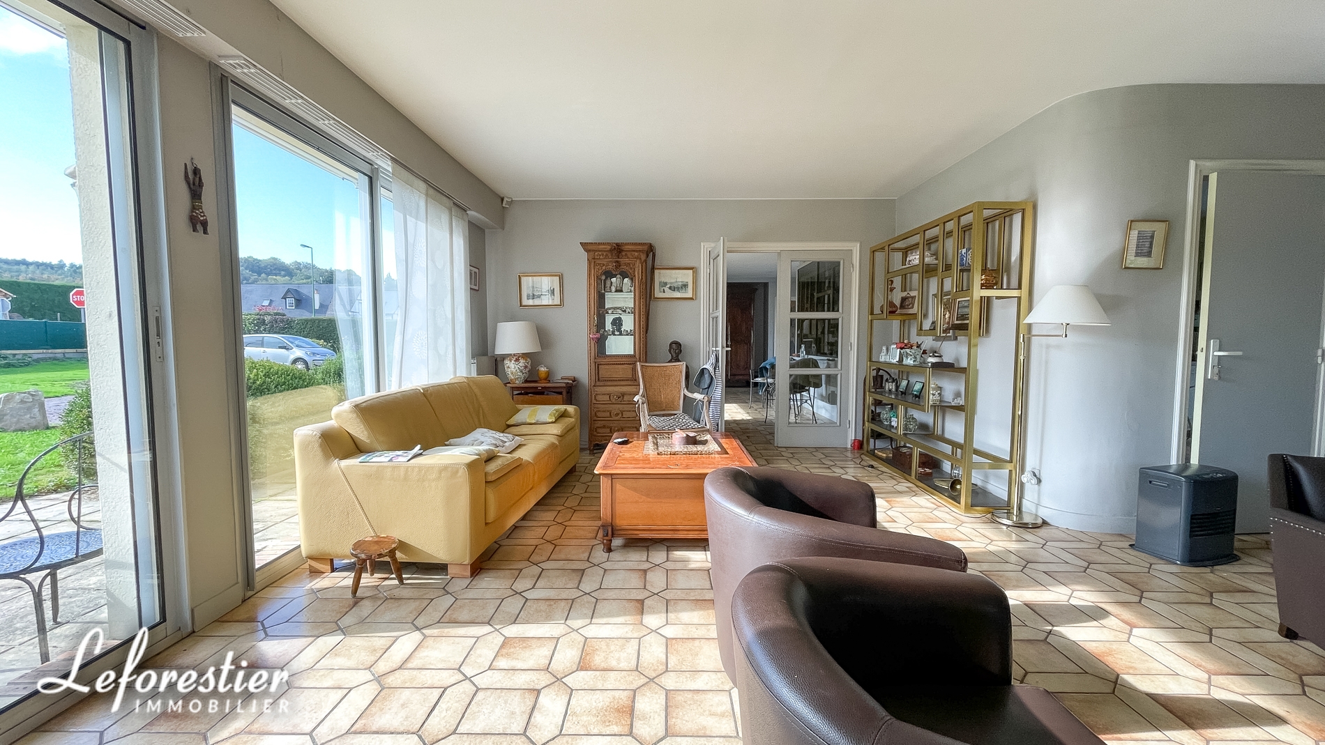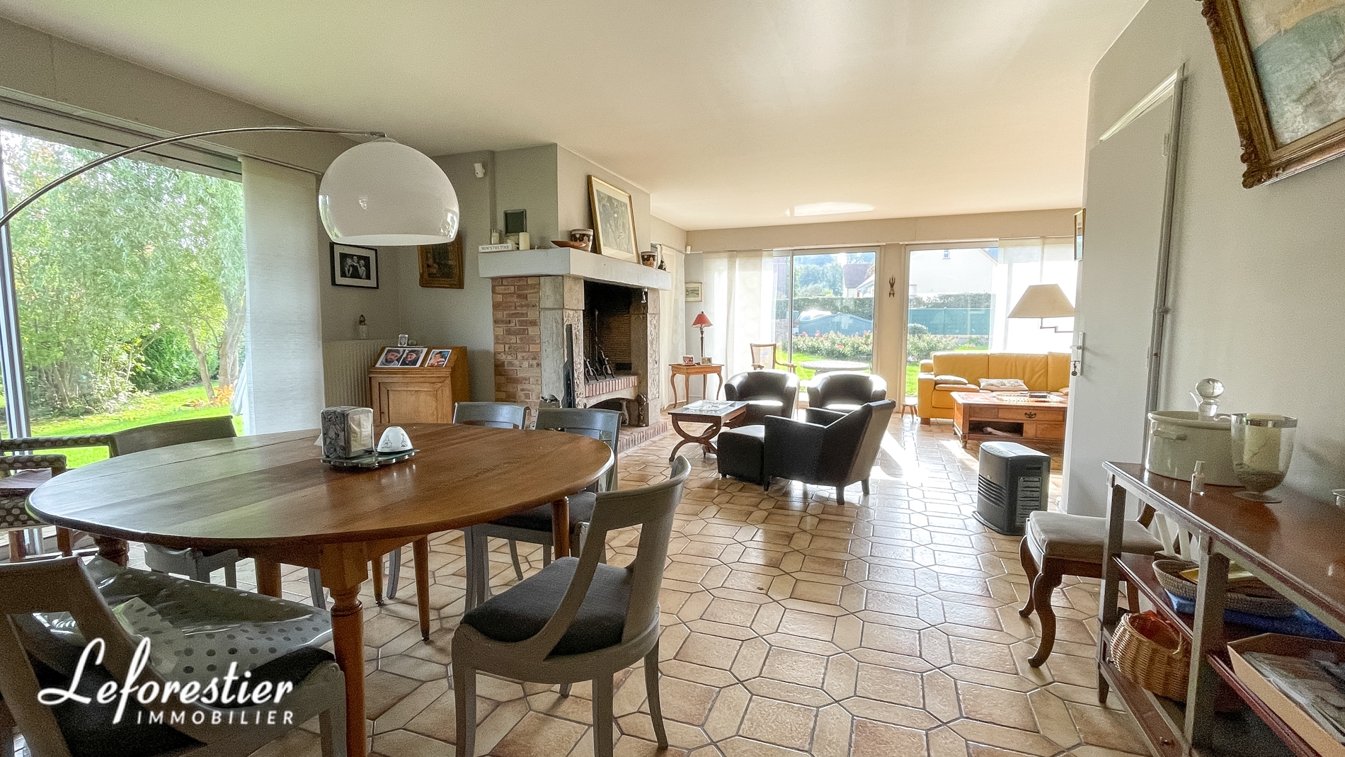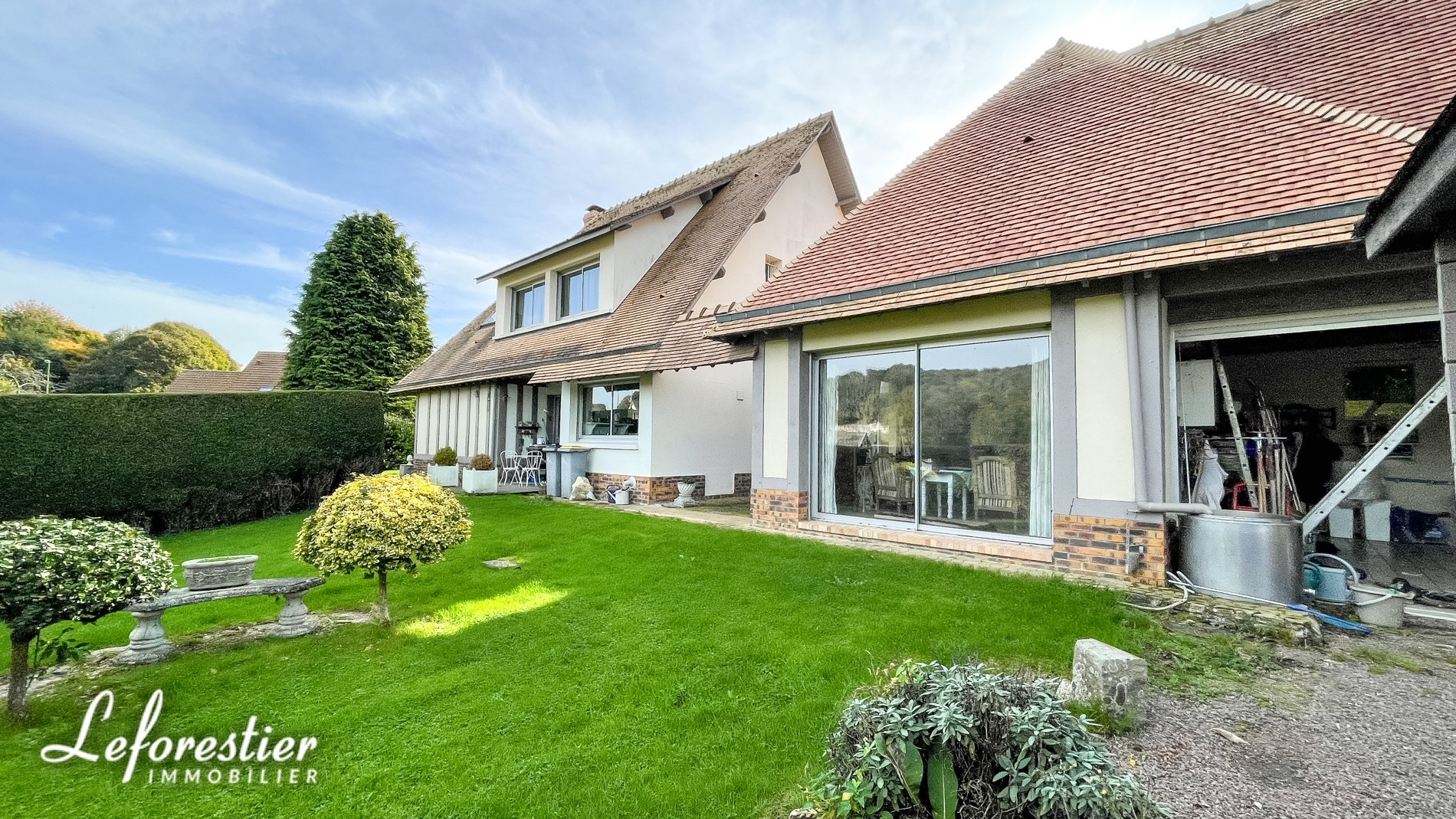 Située dans un village paisible de la vallée de la Saâne, entre Rouen et Dieppe, entre Val-de-Saâne et Luneray, cette maison moderne est construite dans un style néo-normand très léger, avec de grandes baies vitrées en aluminium et une véranda. La lumière inonde le vaste séjour qui s’articule autour d’une cheminée de belle facture où crépite un feu de bois. Elle peut aisément recevoir un appareil de chauffage du type insert ou poêle à granulés pour économiser l’énergie fossile. En véritable maison de famille, elle dispose de nombreuses chambres dont une de plain-pied. Si nécessaire, le double garage attenant représente un potentiel habitable supplémentaire pour un bureau ou d’autres chambres indépendantes.