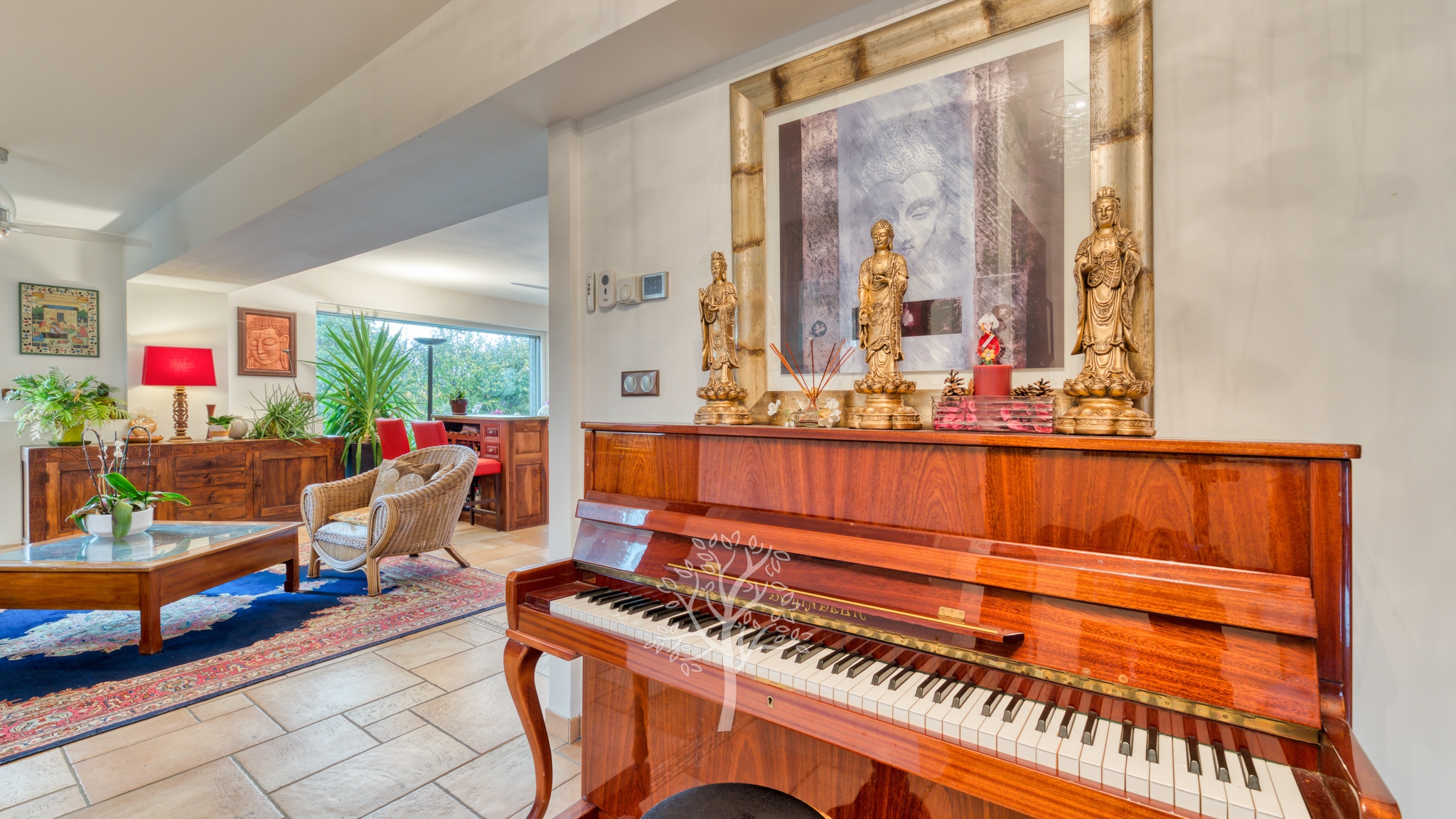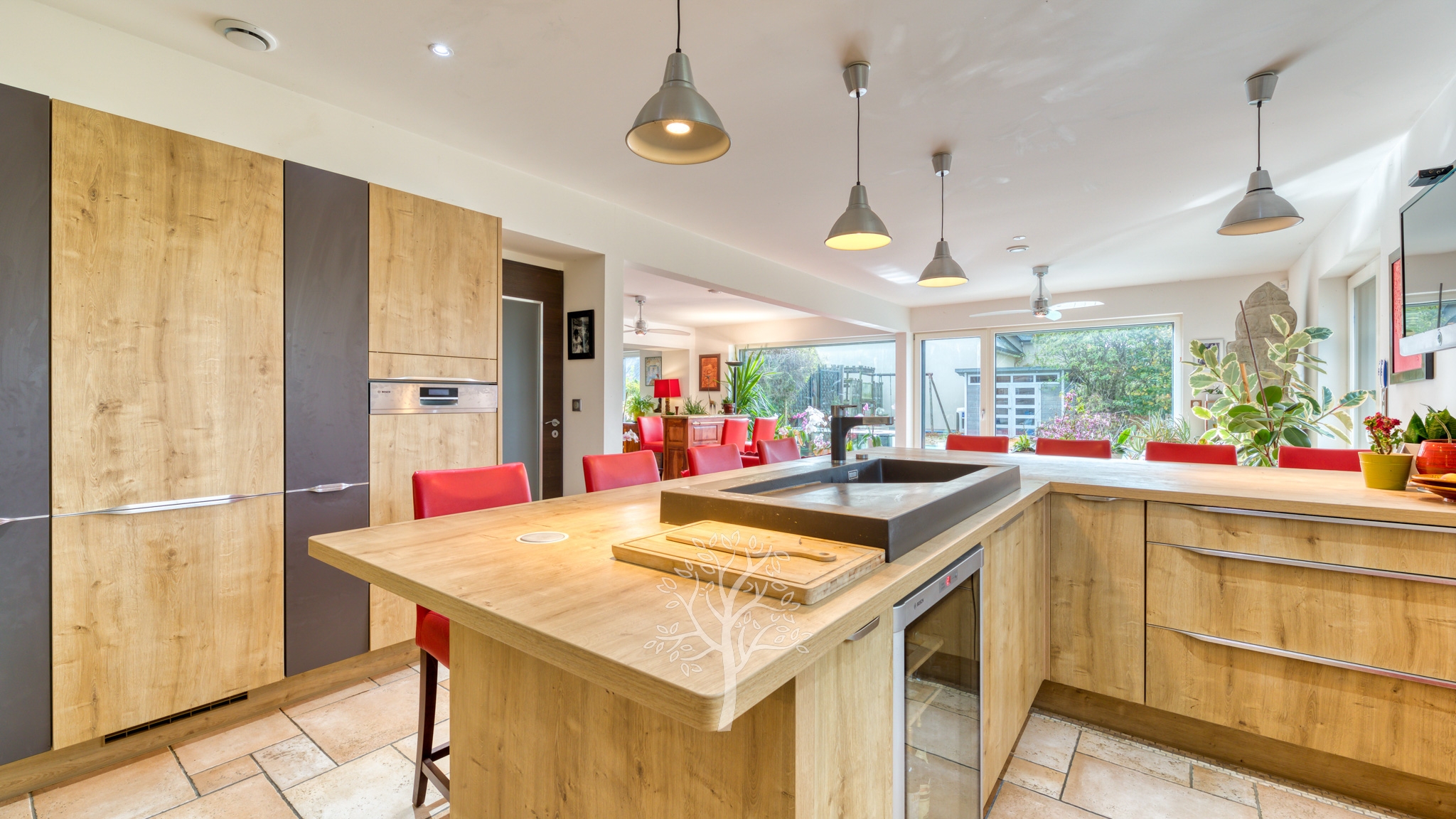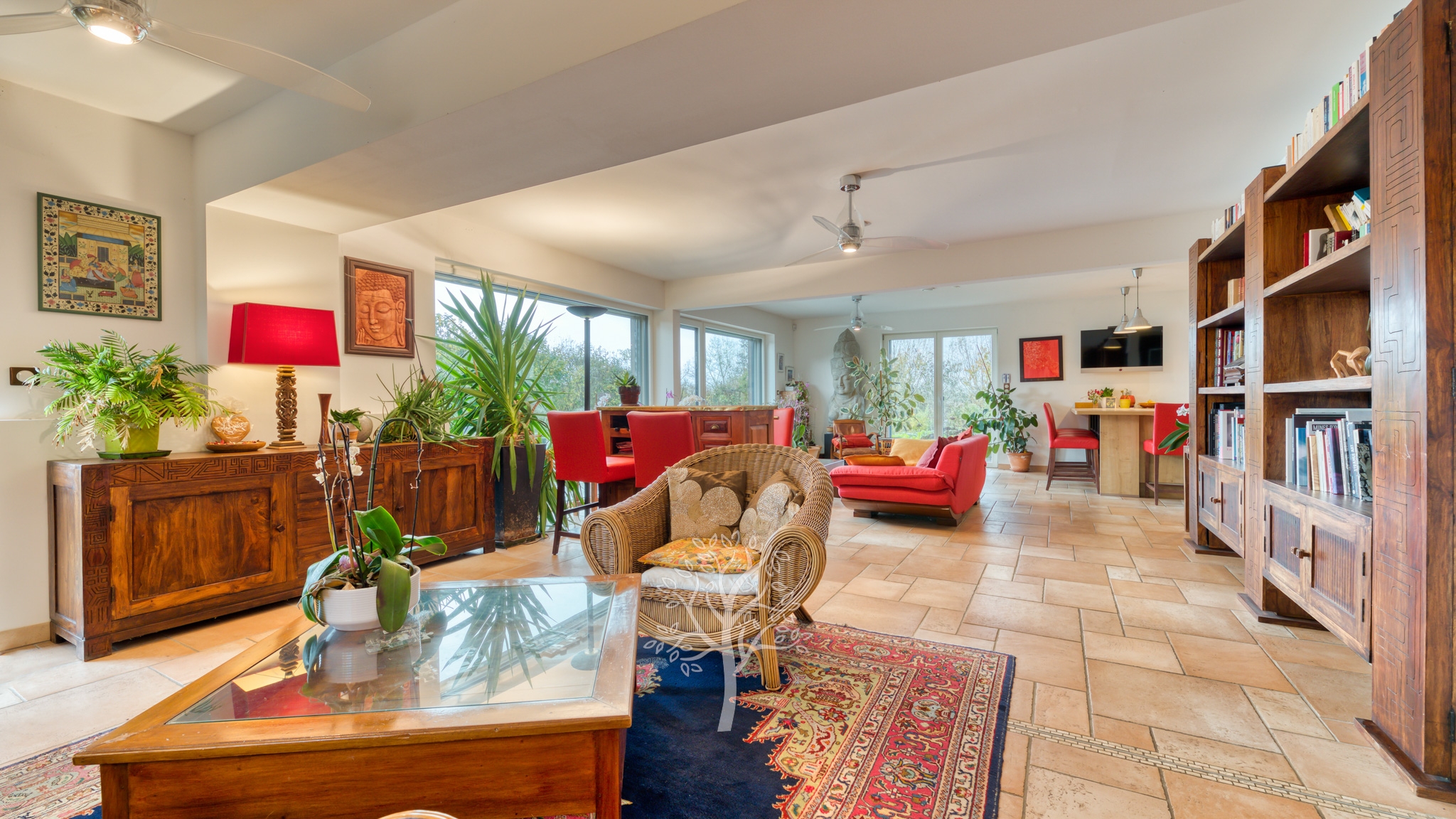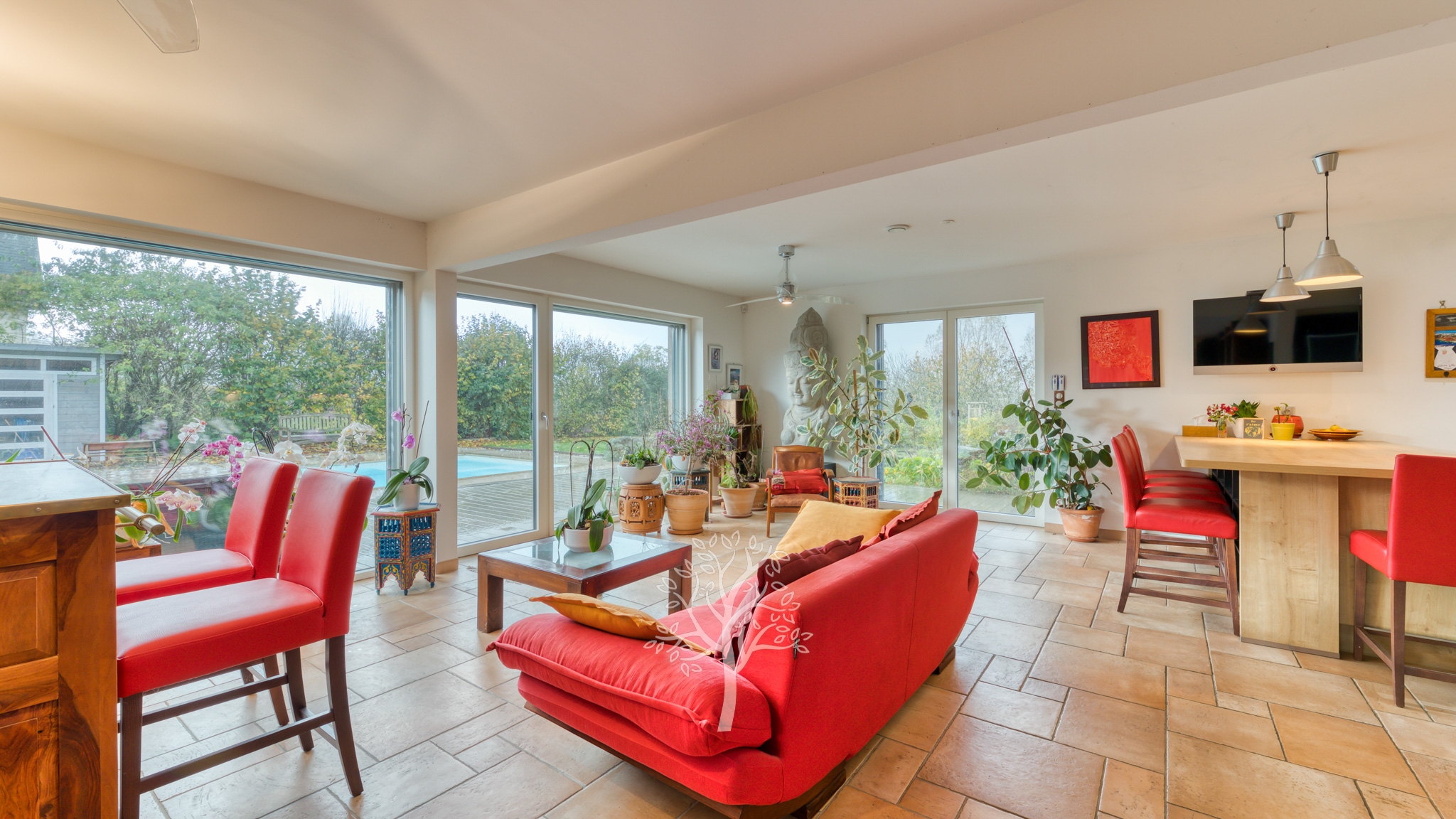 Le design intérieur de cette maison est à la fois moderne et chaleureux. Les grandes baies vitrées inondent les pièces de lumière naturelle et offrent une vue panoramique sur le beau jardin et le marais. Le salon spacieux et lumineux est idéal pour se détendre en famille ou pour recevoir des invités. La cuisine entièrement équipée est ouverte sur ce bel espace de vie et sur la terrasse donnant sur la piscine.