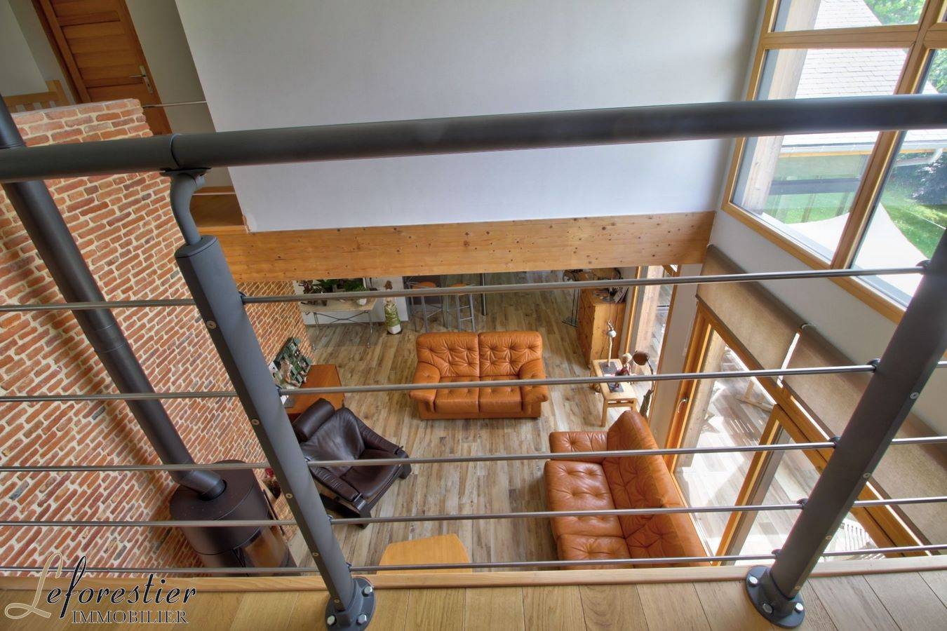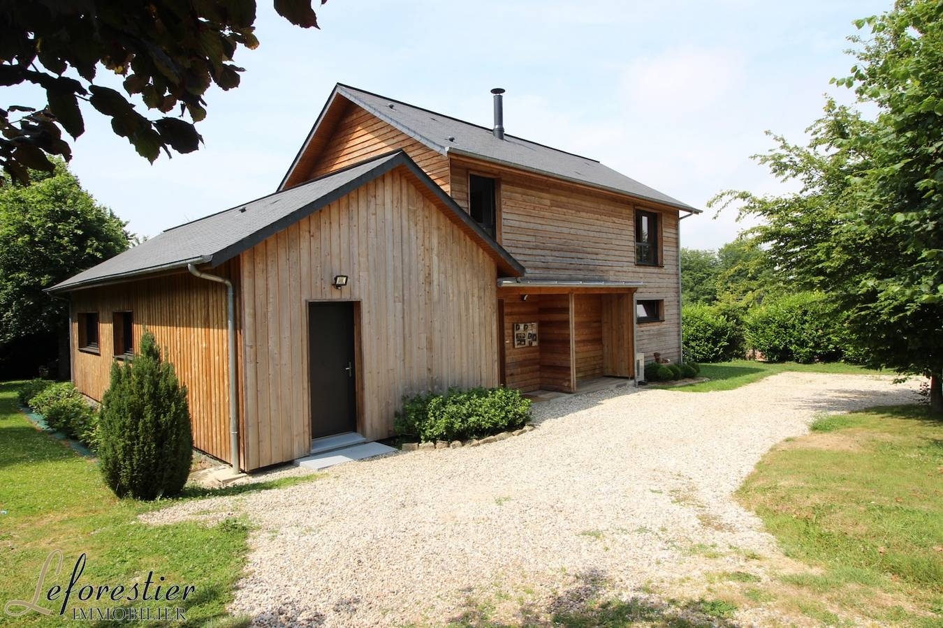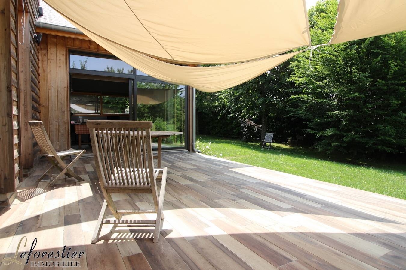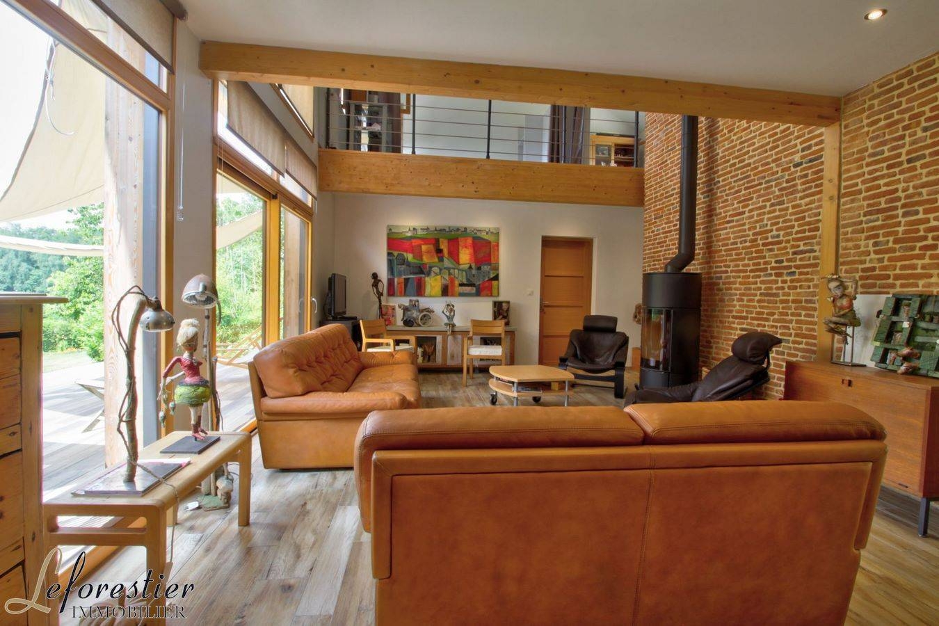 Cette élégante maison contemporaine en ossature bois bénéficie de tous les atouts des maisons modernes de notre époque. L’alliage de nobles matériaux comme le bois, le verre et l’aluminium permet d’obtenir un niveau de confort exceptionnel. La lumière pénètre en abondance par les nombreuses et larges ouvertures à double vitrage. La pompe à chaleur produit économiquement l’énergie transmise à un plancher chauffant. A mi- saison, le poêle à bois vient compléter le système et apporte une touche conviviale au salon-mezzanine.