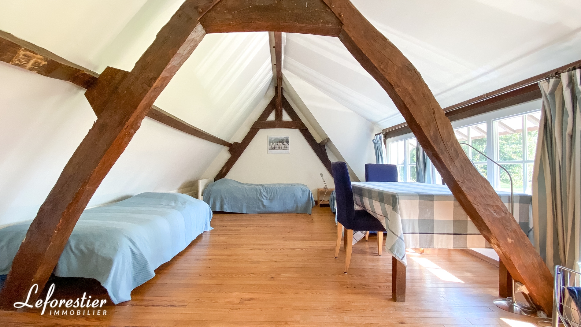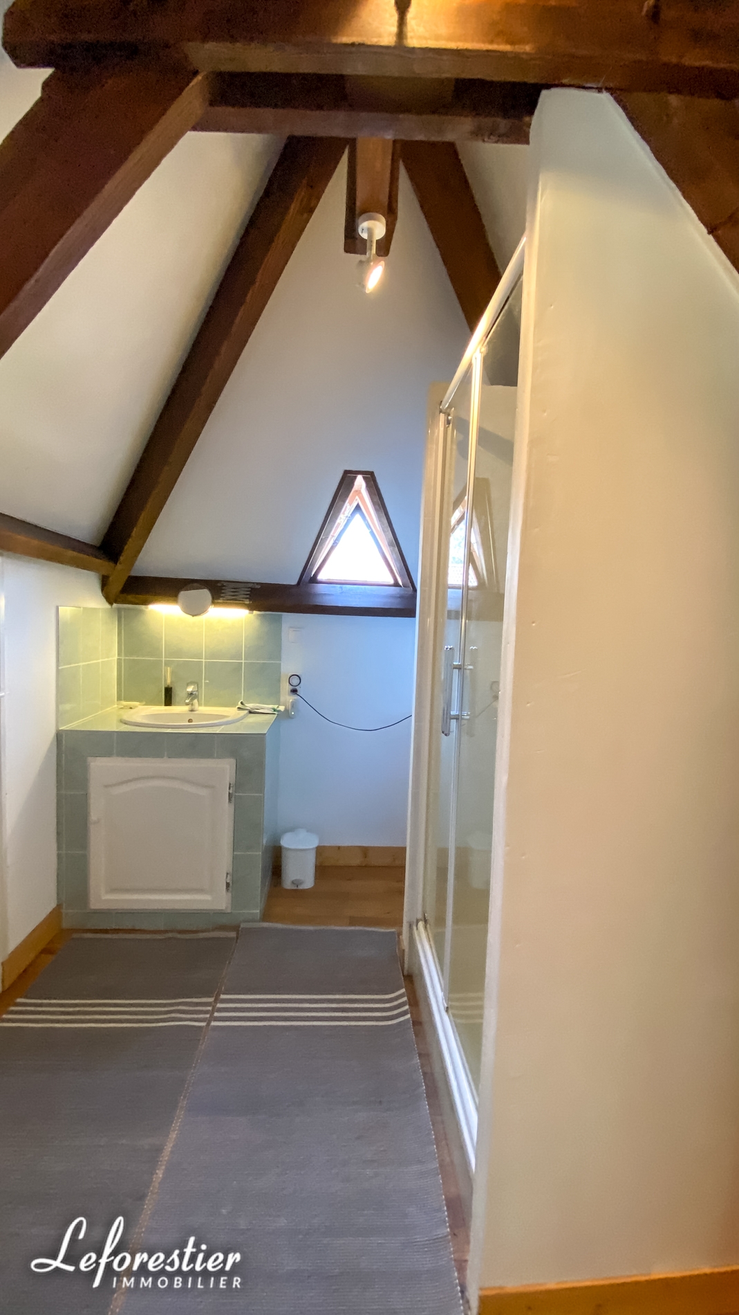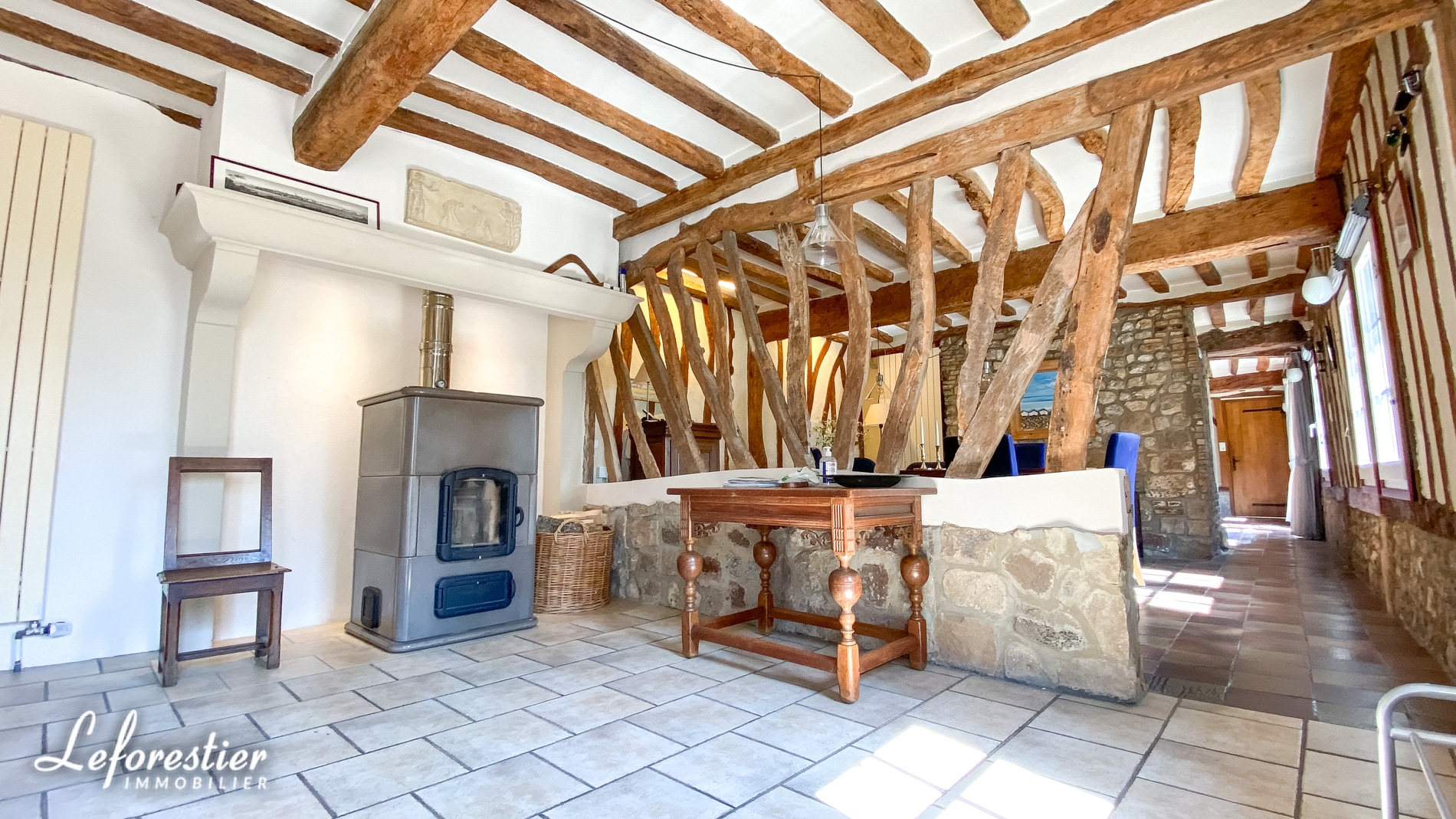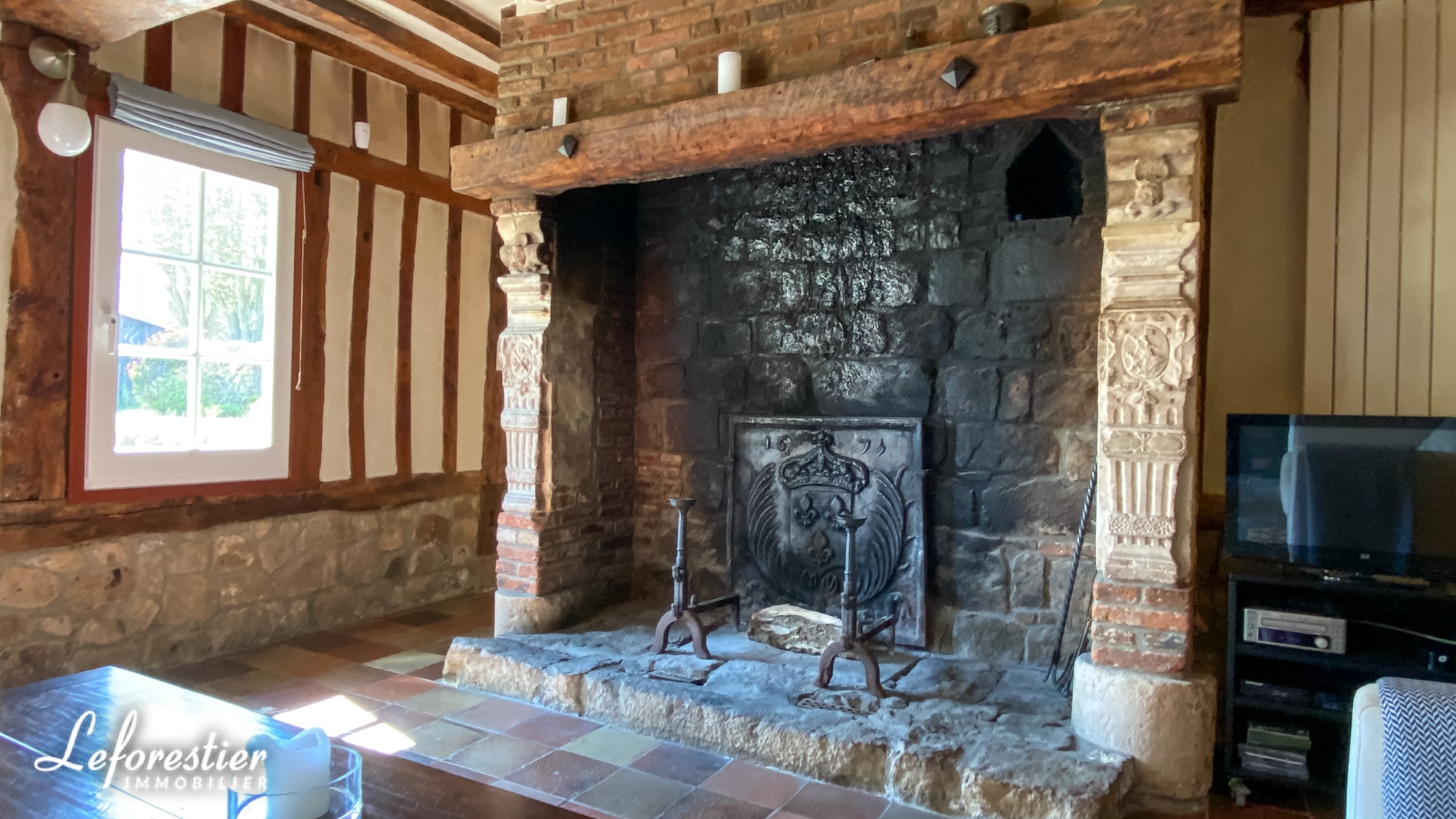 Dans le vestibule d’entrée partiellement ouvert sur la salle à manger, trône un majestueux poêle à bois traditionnel qui diffuse une agréable chaleur dans tout le rez-de-chaussée. Le séjour salon est cosy et offre un bel espace détente en famille devant la cheminée monumentale en grès. Les poutres en chêne brut donnent le cachet typique de la normande cauchoise. La cuisine est fonctionnelle et indépendante. Pour s’isoler et travailler au calme, un bureau fait face à la nature. Le confort de vie est privilégié dans cette maison de campagne : la suite principale est au RDC et s’ouvre sur terrasse pavée face au jardin. La chambre est vaste avec de beaux placards dressing et la salle de bains comprend un meuble avec double vasque, une baignoire et une douche italienne. Toilettes indépendants.