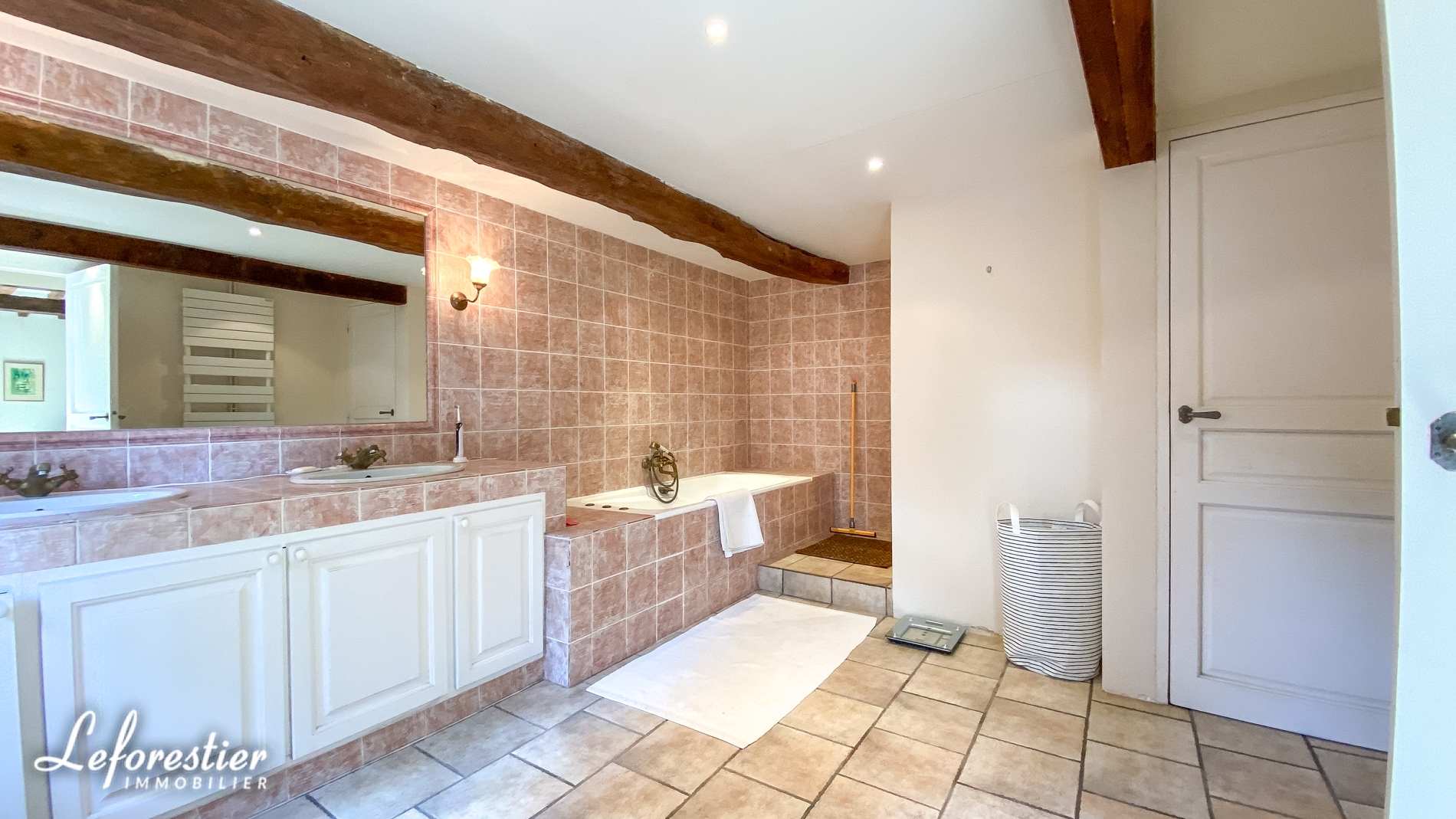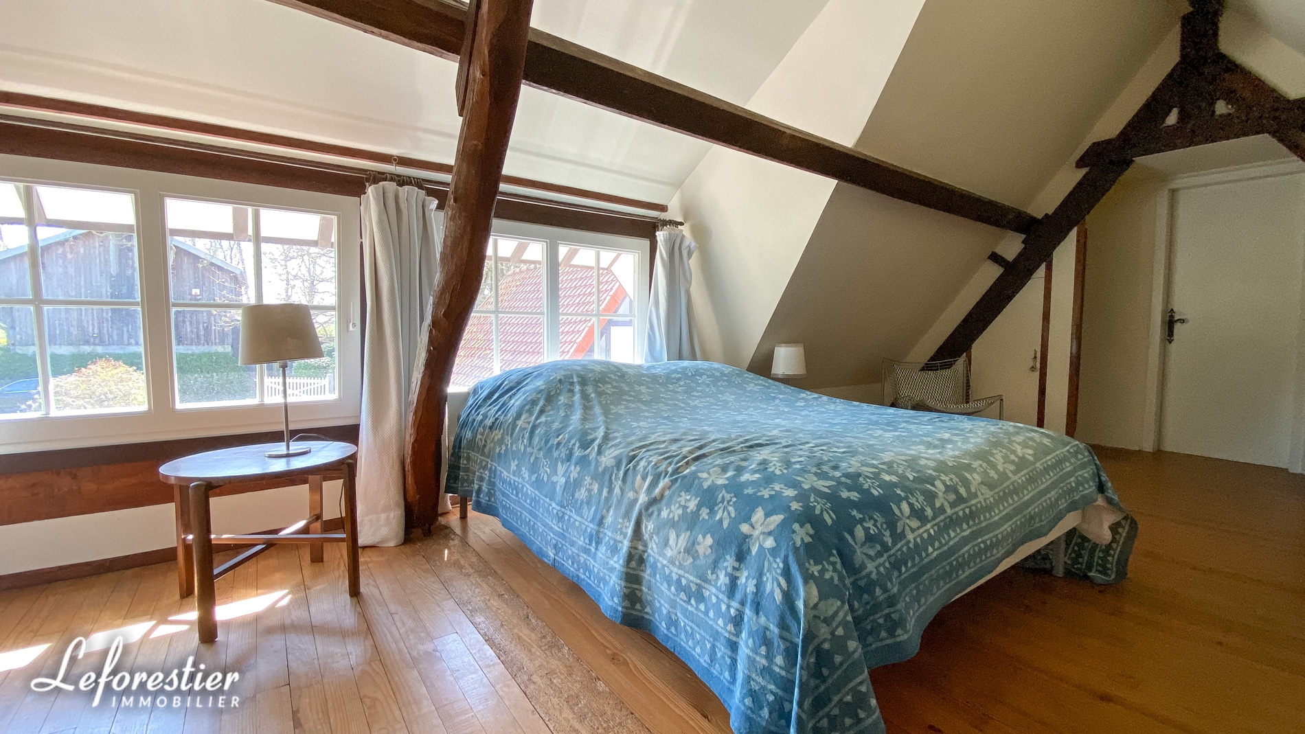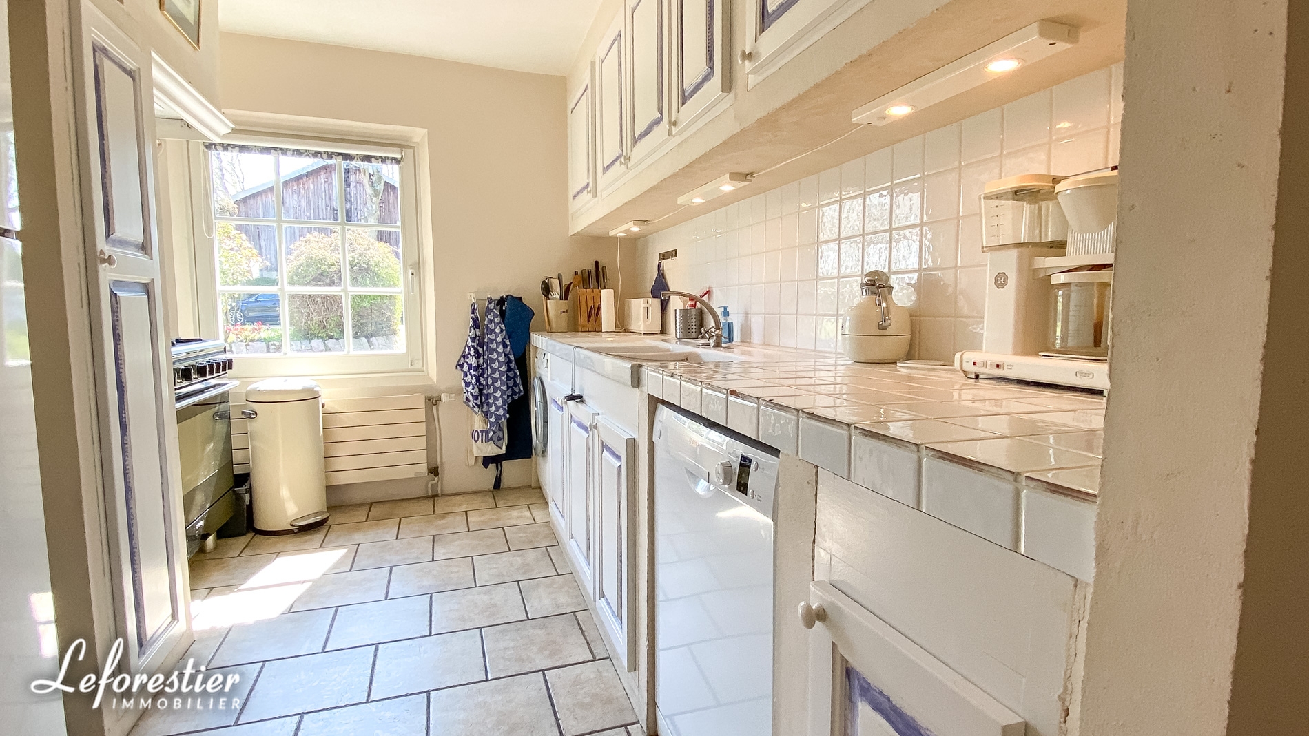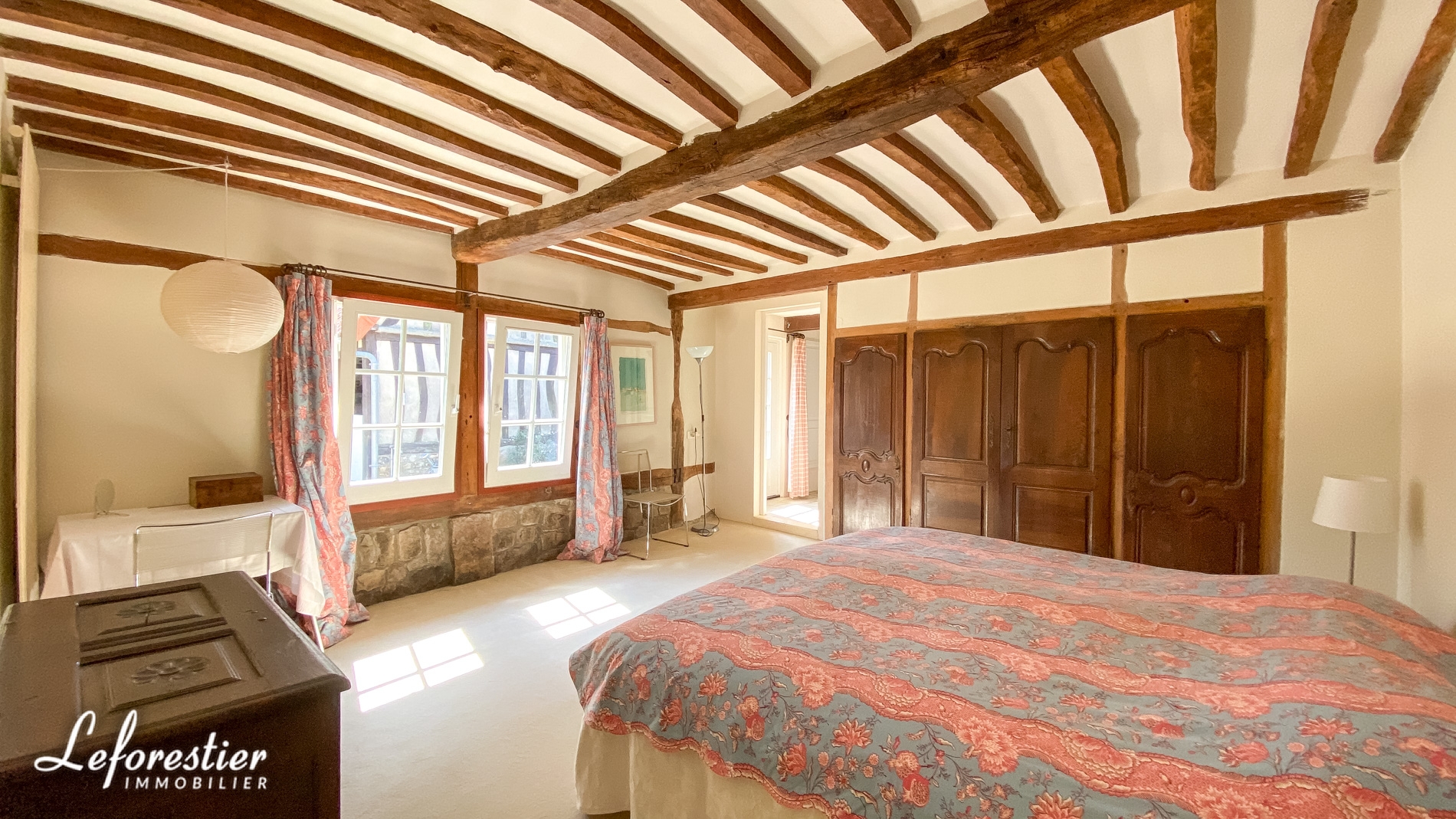 Dans le vestibule d’entrée partiellement ouvert sur la salle à manger, trône un majestueux poêle à bois traditionnel qui diffuse une agréable chaleur dans tout le rez-de-chaussée. Le séjour salon est cosy et offre un bel espace détente en famille devant la cheminée monumentale en grès. Les poutres en chêne brut donnent le cachet typique de la normande cauchoise. La cuisine est fonctionnelle et indépendante. Pour s’isoler et travailler au calme, un bureau fait face à la nature. Le confort de vie est privilégié dans cette maison de campagne : la suite principale est au RDC et s’ouvre sur terrasse pavée face au jardin. La chambre est vaste avec de beaux placards dressing et la salle de bains comprend un meuble avec double vasque, une baignoire et une douche italienne. Toilettes indépendants.