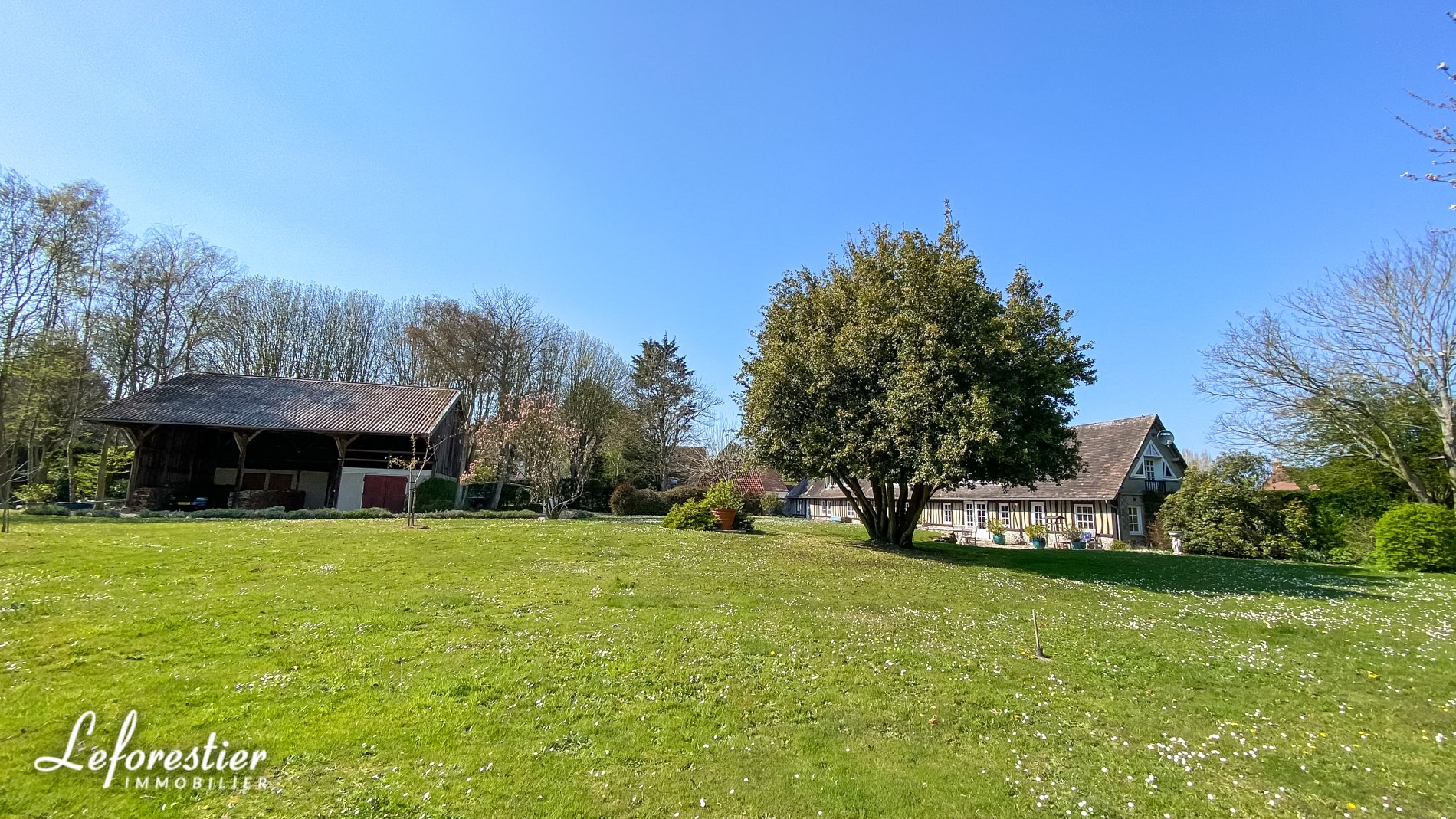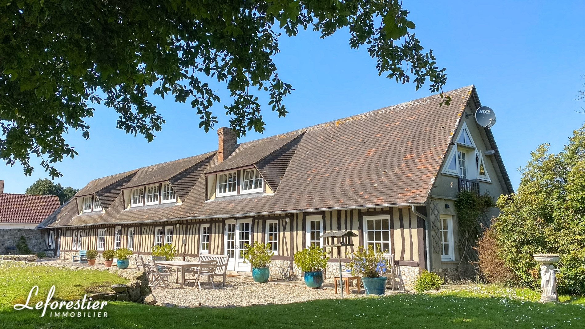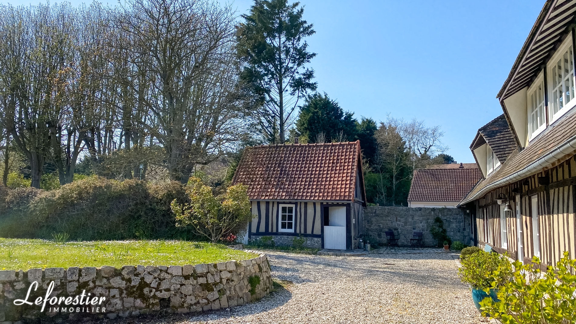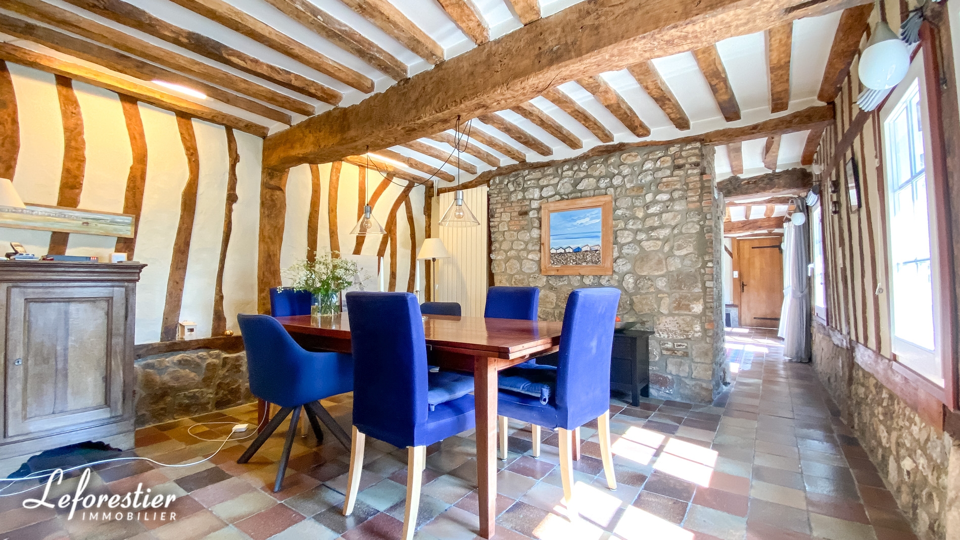 Dans le village de Sainte-Marguerite-sur-mer, sur les falaises de la côte d’Albâtre cette belle maison normande se niche dans un parc boisé entouré de talus et à l’abri des regards. La façade à colombages avec ses nombreuses ouvertures à petits carreaux typiquement normandes est exposée sud.