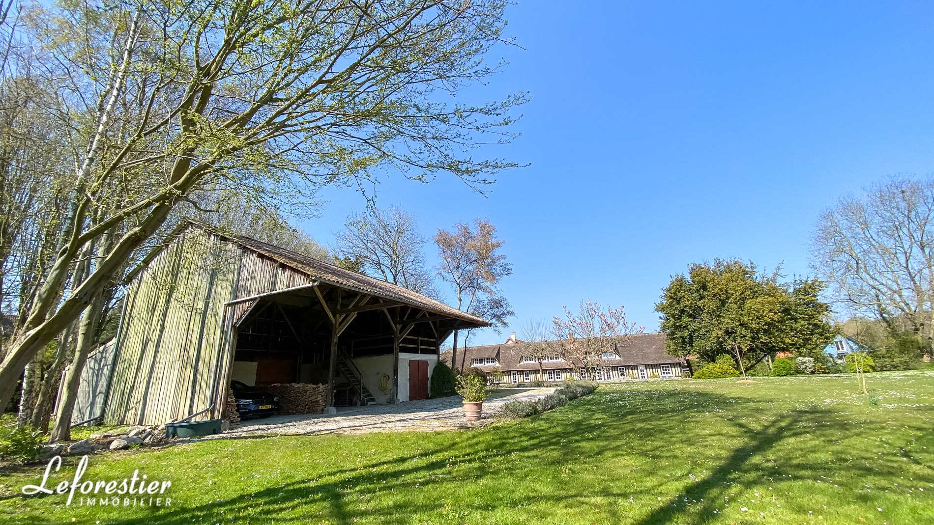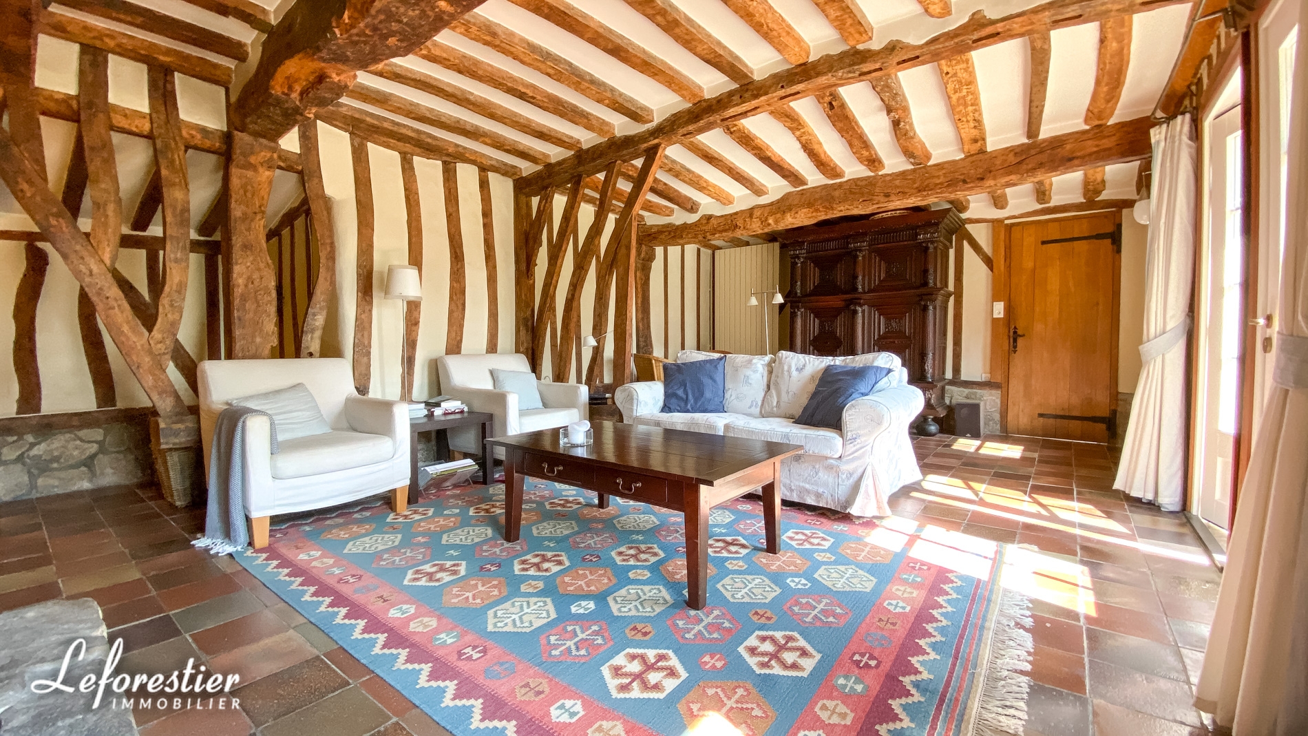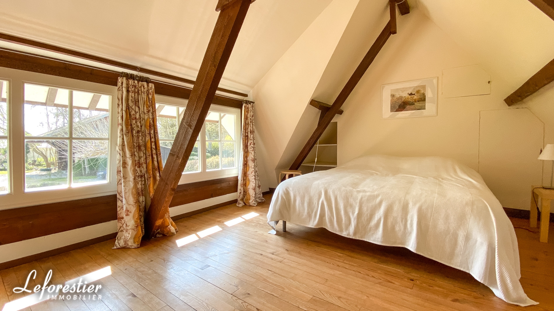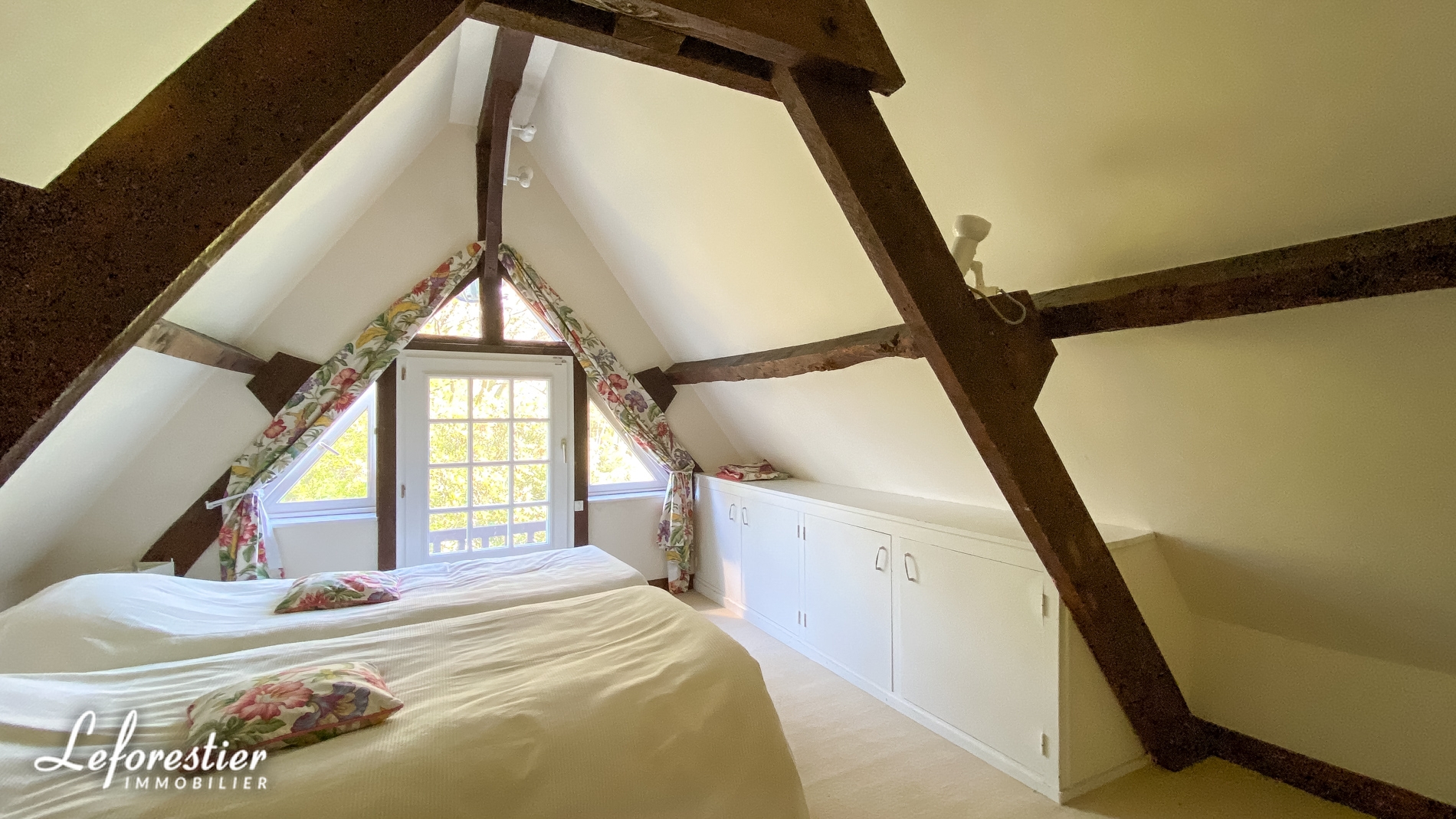 Dans le village de Sainte-Marguerite-sur-mer, sur les falaises de la côte d’Albâtre cette belle maison normande se niche dans un parc boisé entouré de talus et à l’abri des regards. La façade à colombages avec ses nombreuses ouvertures à petits carreaux typiquement normandes est exposée sud.