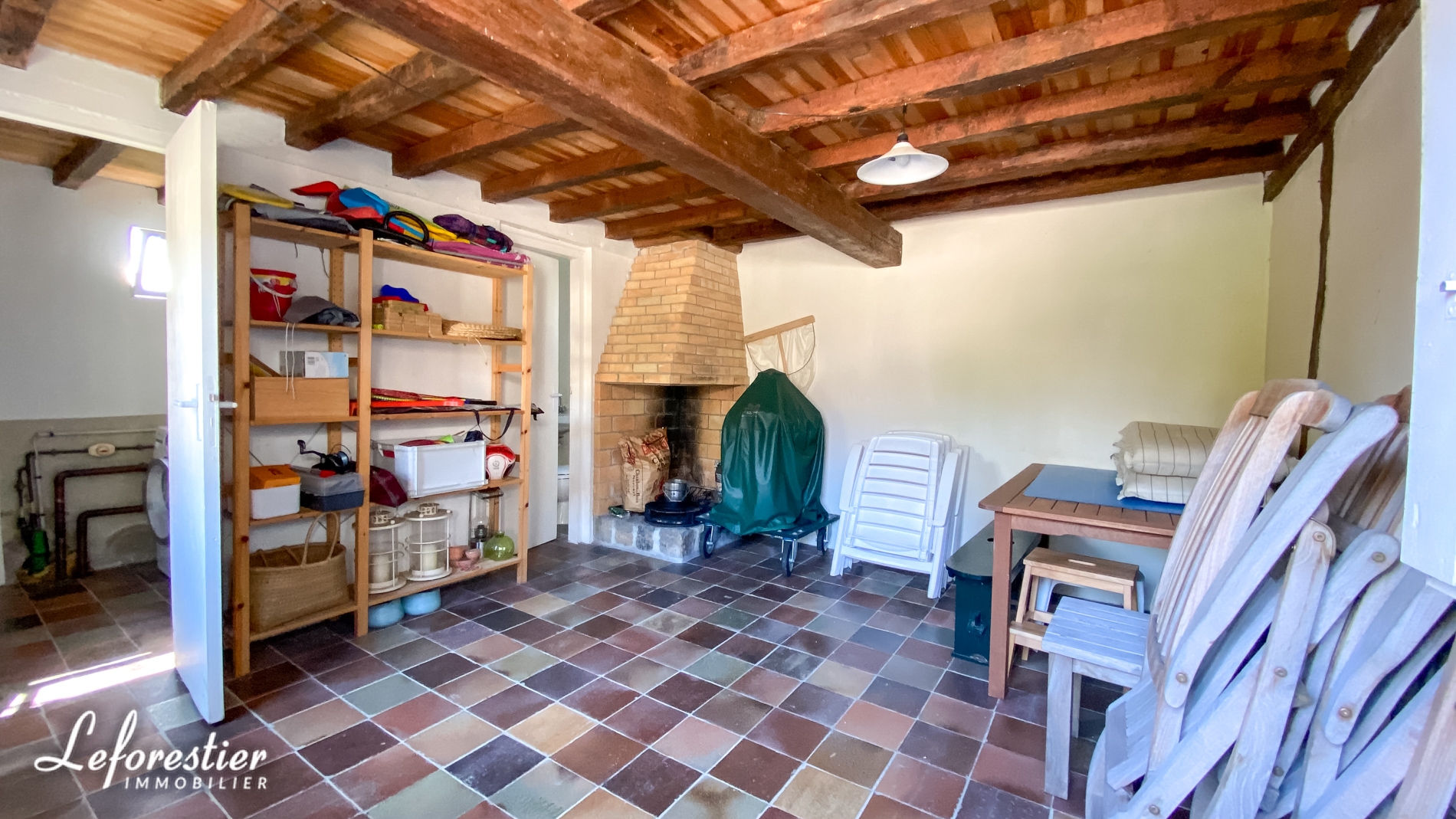 Une petite dépendance attenante à la maison principale comprend la chaufferie, un cabinet de toilettes et une pièce avec cheminée, idéale pour les barbecues en arrière-saison.