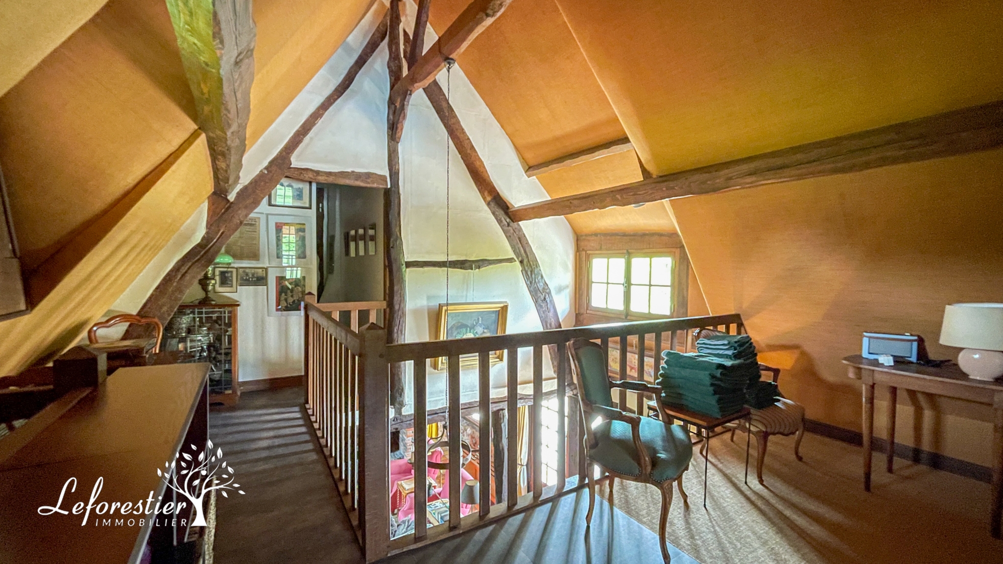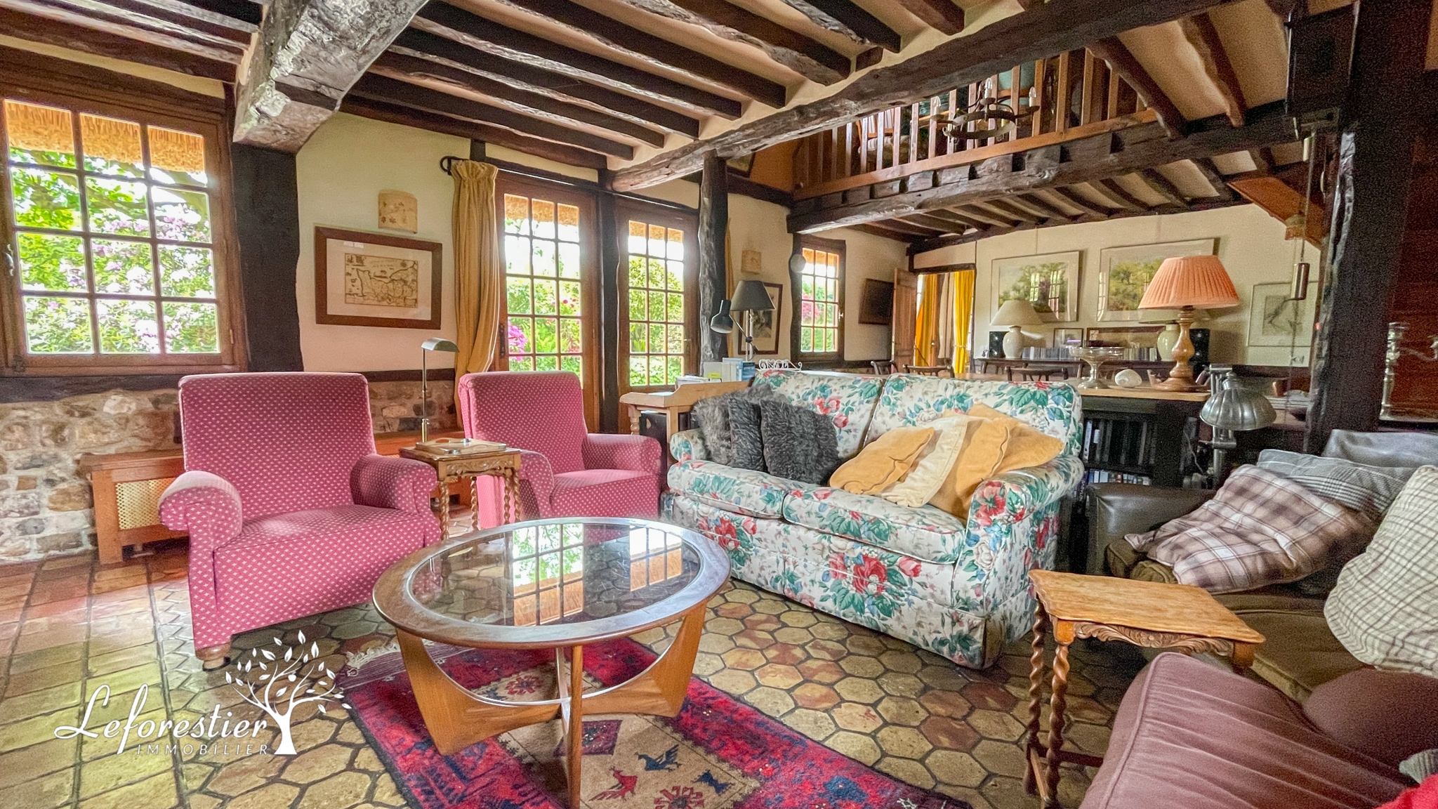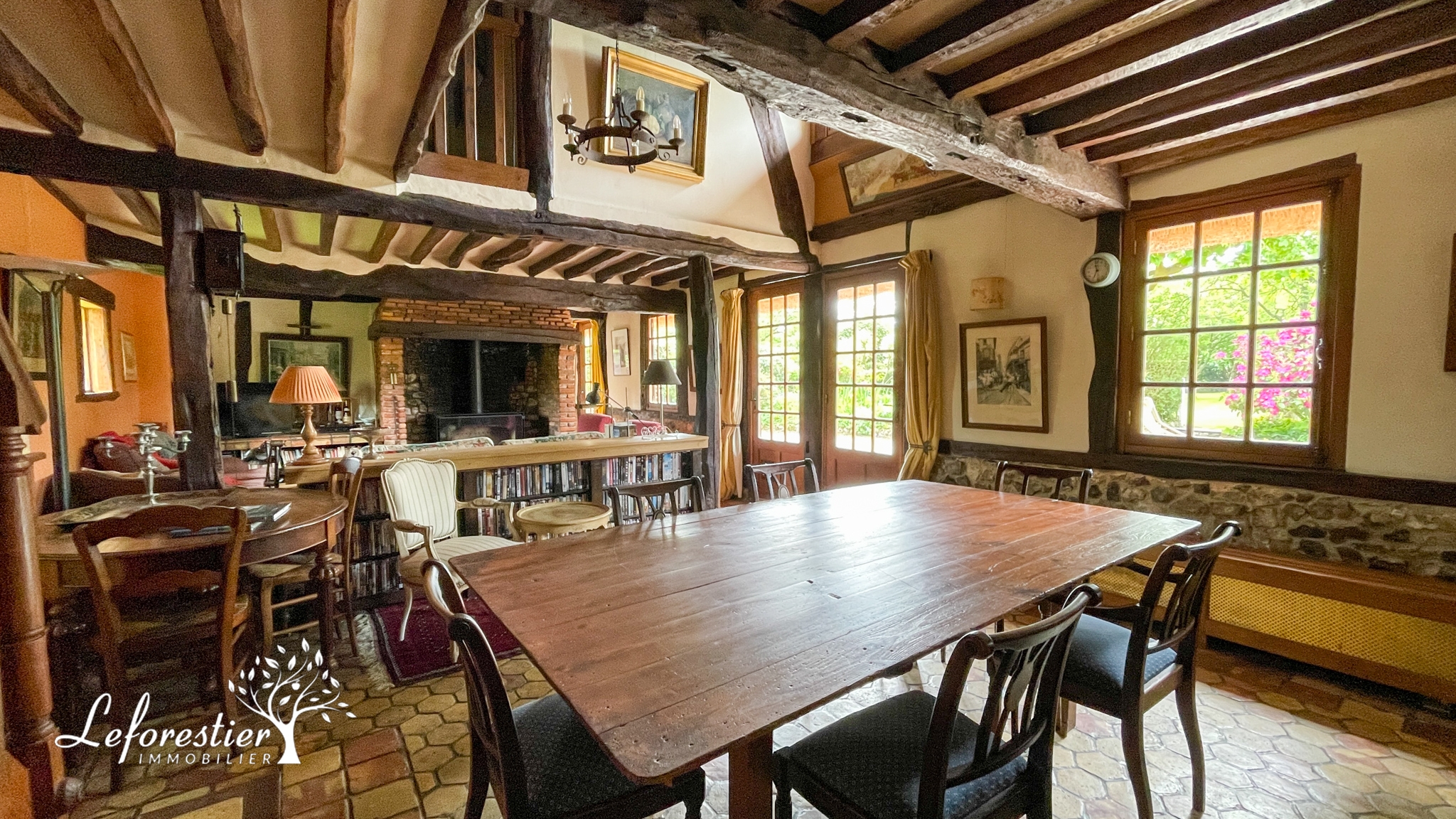 Cette longère a su conserver tous ses éléments d’origine avec sa splendide cheminée, ses poutres apparentes et ses splendides tomettes du XVIIIe siècle. Une fois franchi la porte, vous découvrez cette magnifique pièce de vie. Une mezzanine a été créée afin de profiter de la belle charpente depuis le rez de chaussée, le sentiment d’espace est présent.