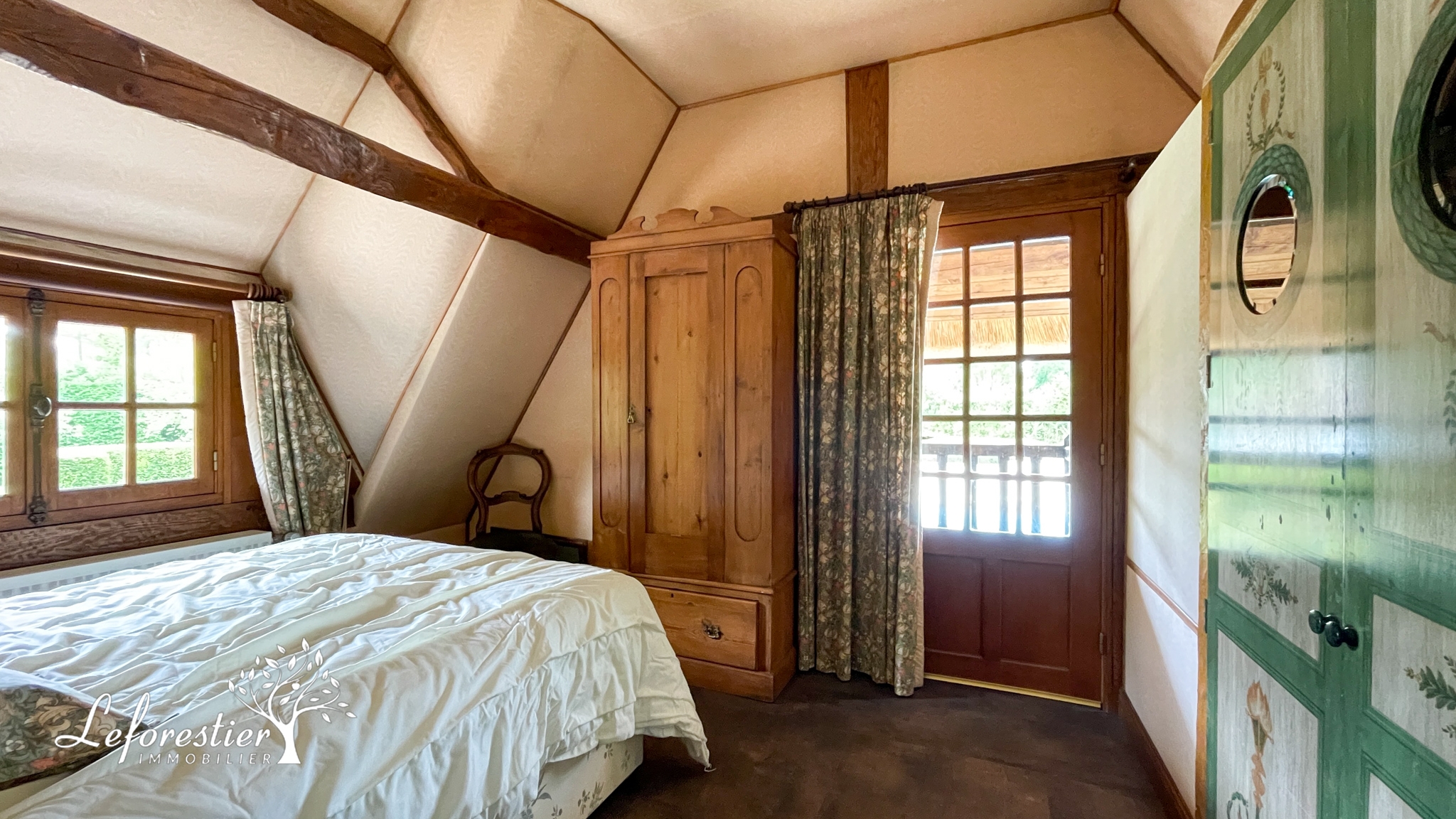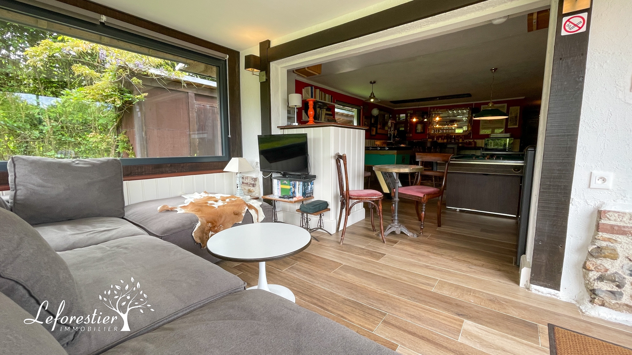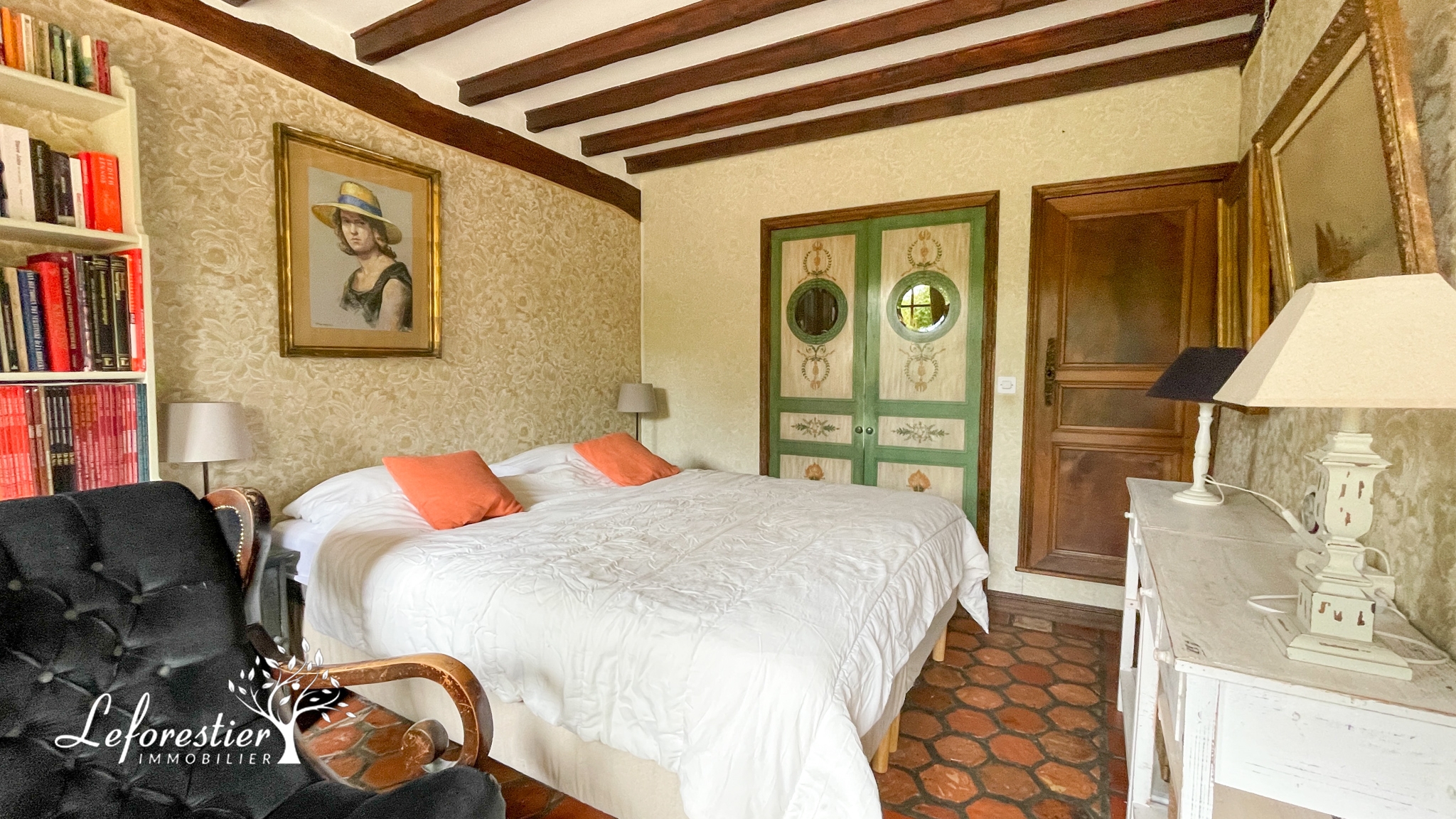 Cette longère a su conserver tous ses éléments d’origine avec sa splendide cheminée, ses poutres apparentes et ses splendides tomettes du XVIIIe siècle. Une fois franchi la porte, vous découvrez cette magnifique pièce de vie. Une mezzanine a été créée afin de profiter de la belle charpente depuis le rez de chaussée, le sentiment d’espace est présent.
