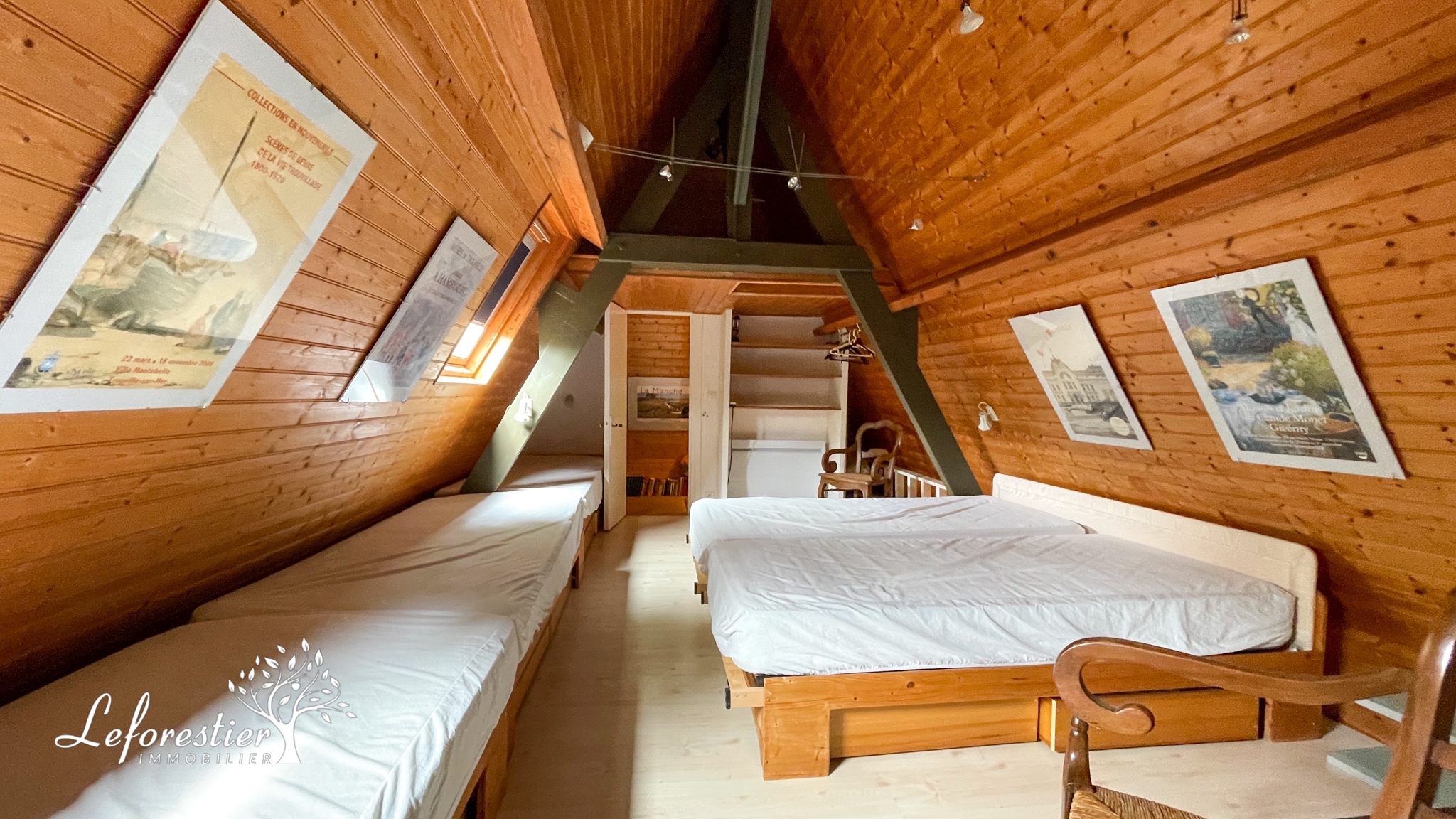 Une fois gravi l’escalier, nous arrivons sur la mezzanine, formant un grand palier où l’on peut aisément faire un espace de télétravail. On y trouve également 3 chambres avec leurs cabinets de toilettes et une salle de bain. L’une des chambres possède une porte fenêtre qui découvre un adorable balcon situé juste au-dessus de la piscine.
