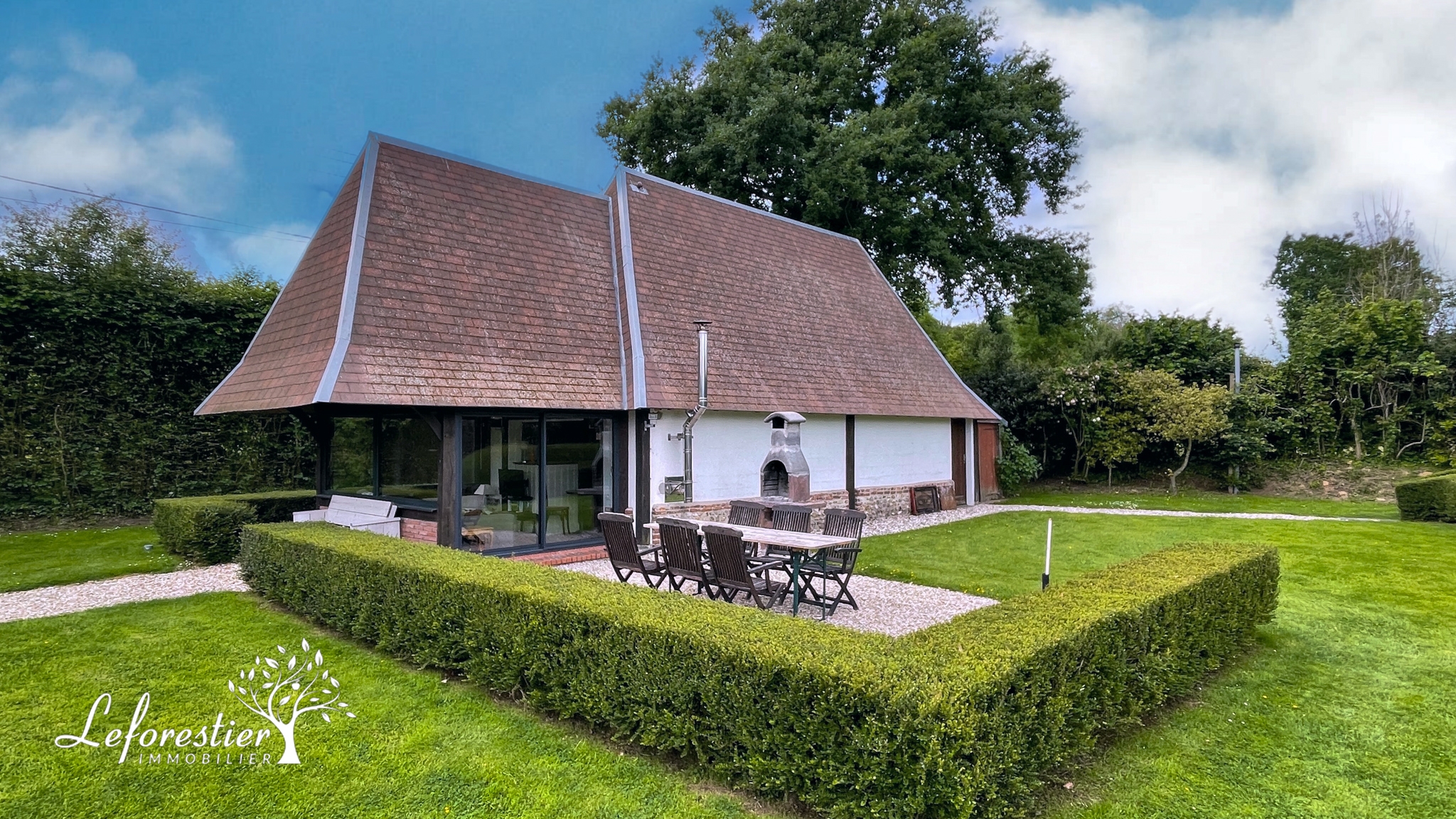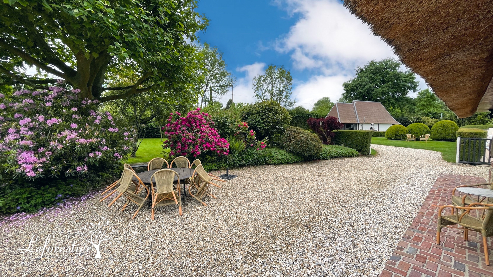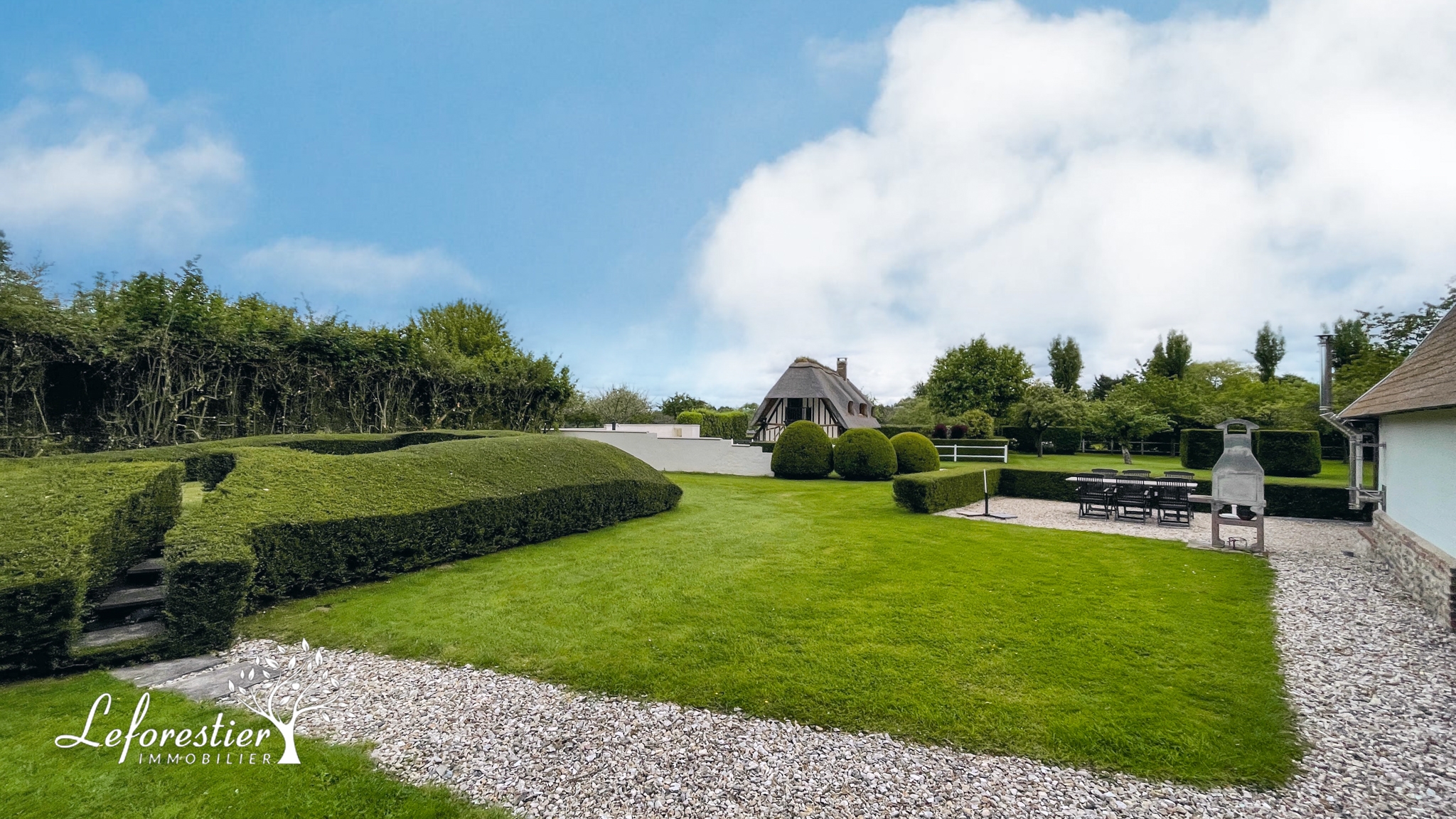 Le jardin est très entretenu avec ses haies taillées et sa pelouse impeccable. La terrasse est des plus agréable à l’abri d’une très belle végétation.