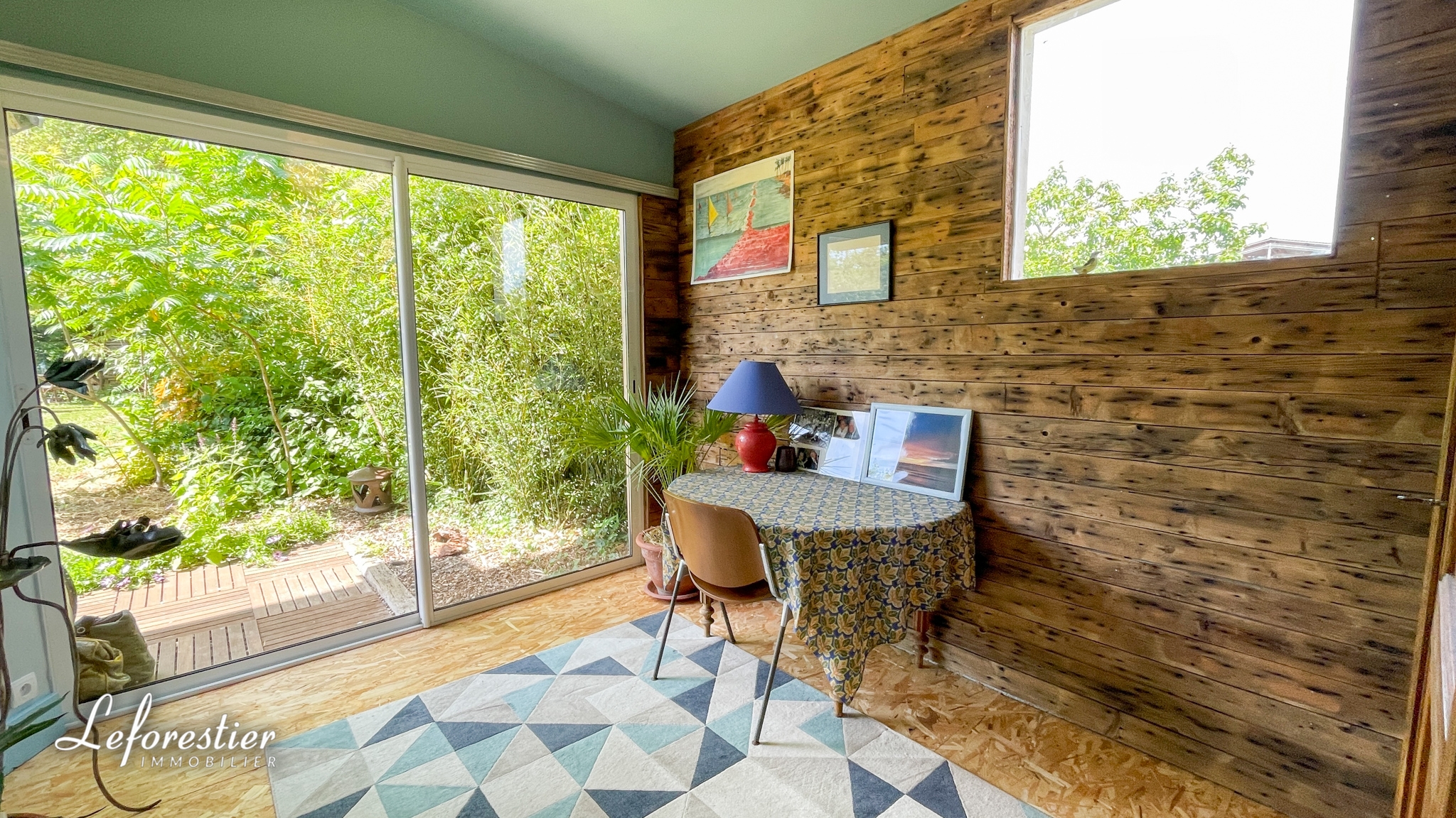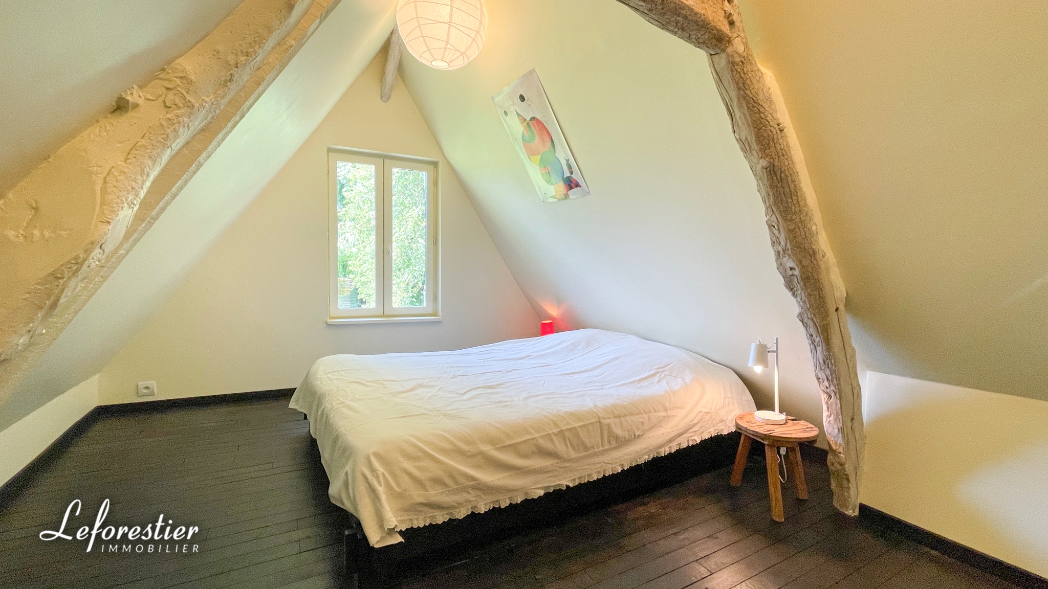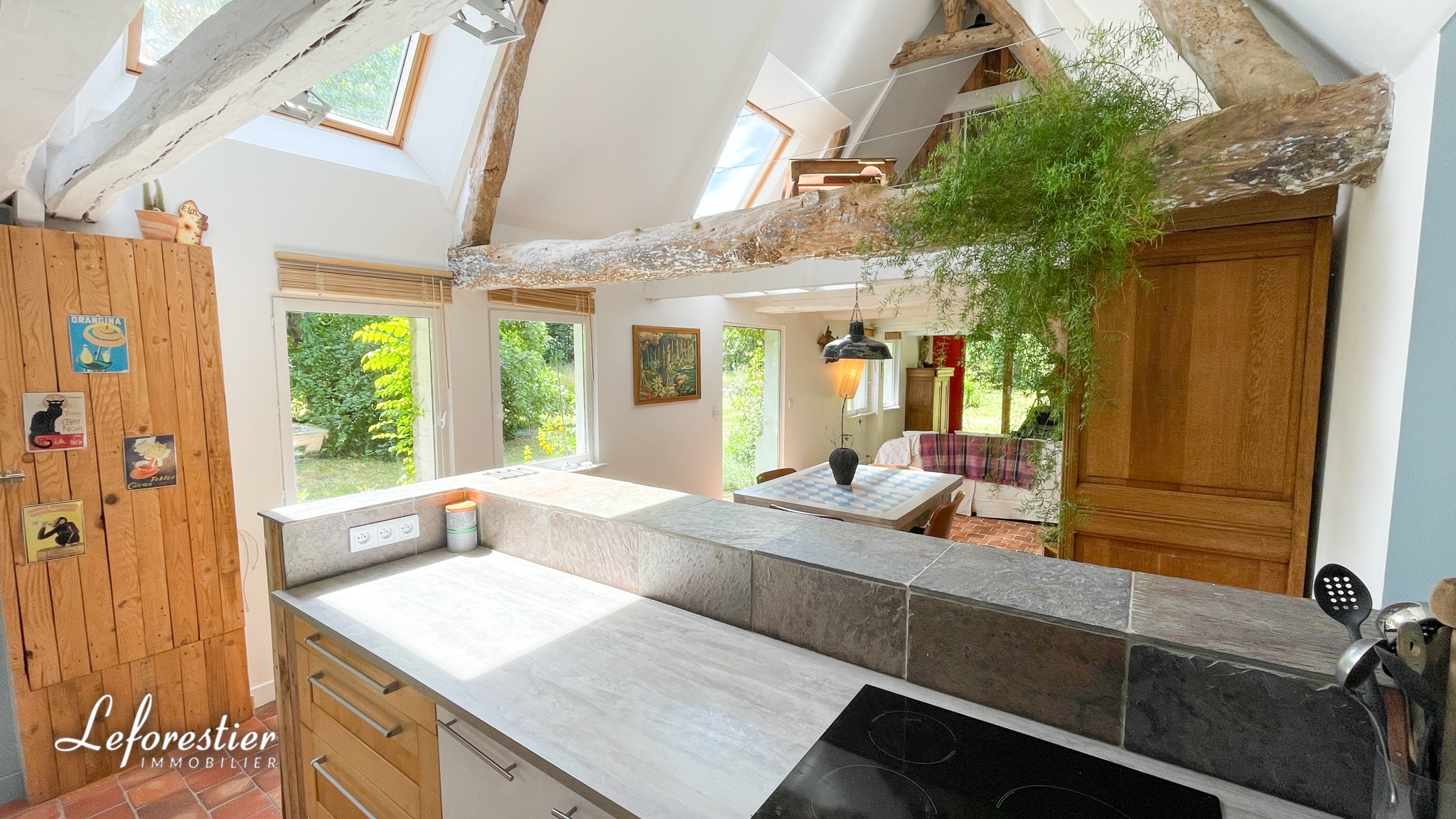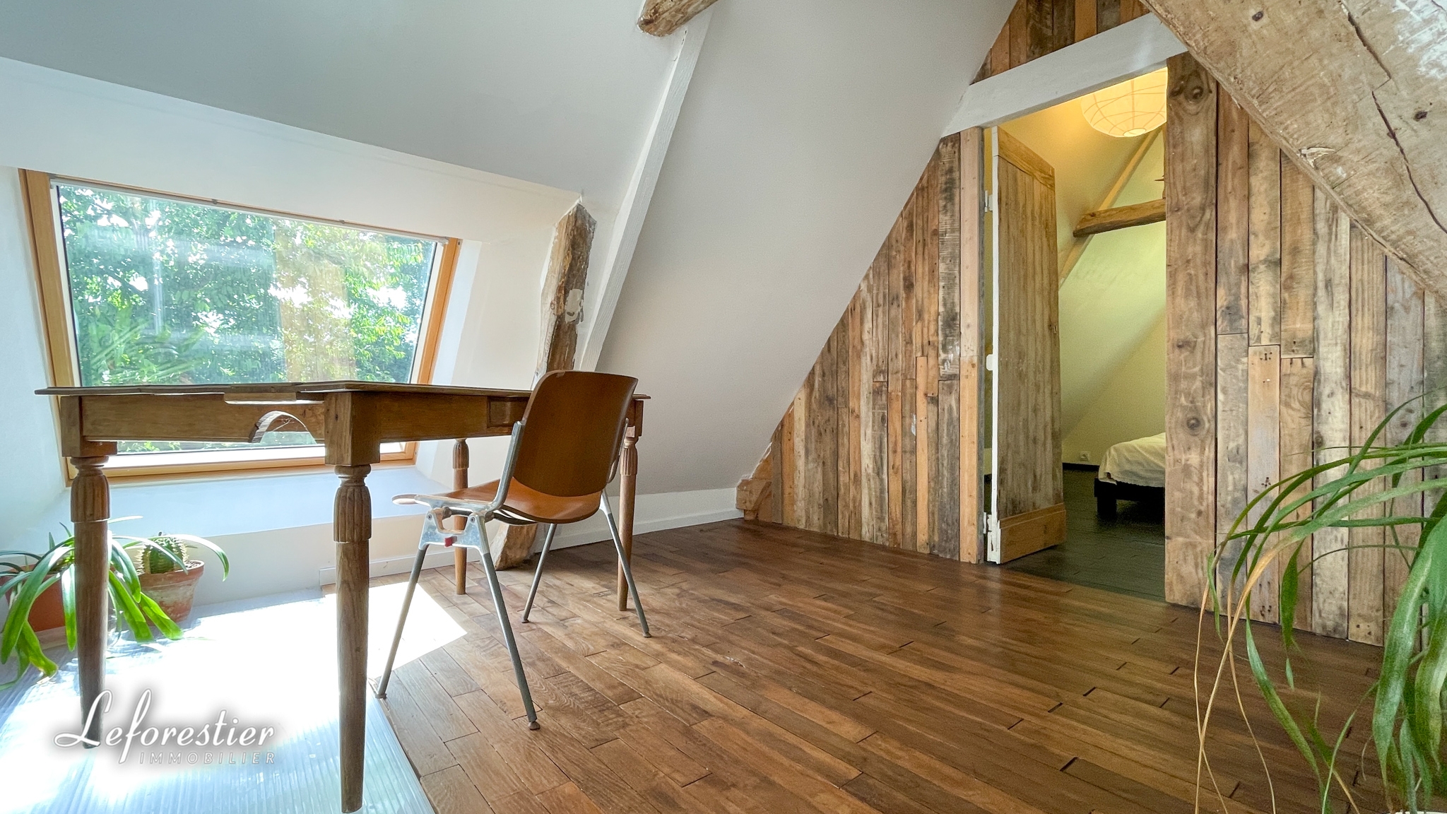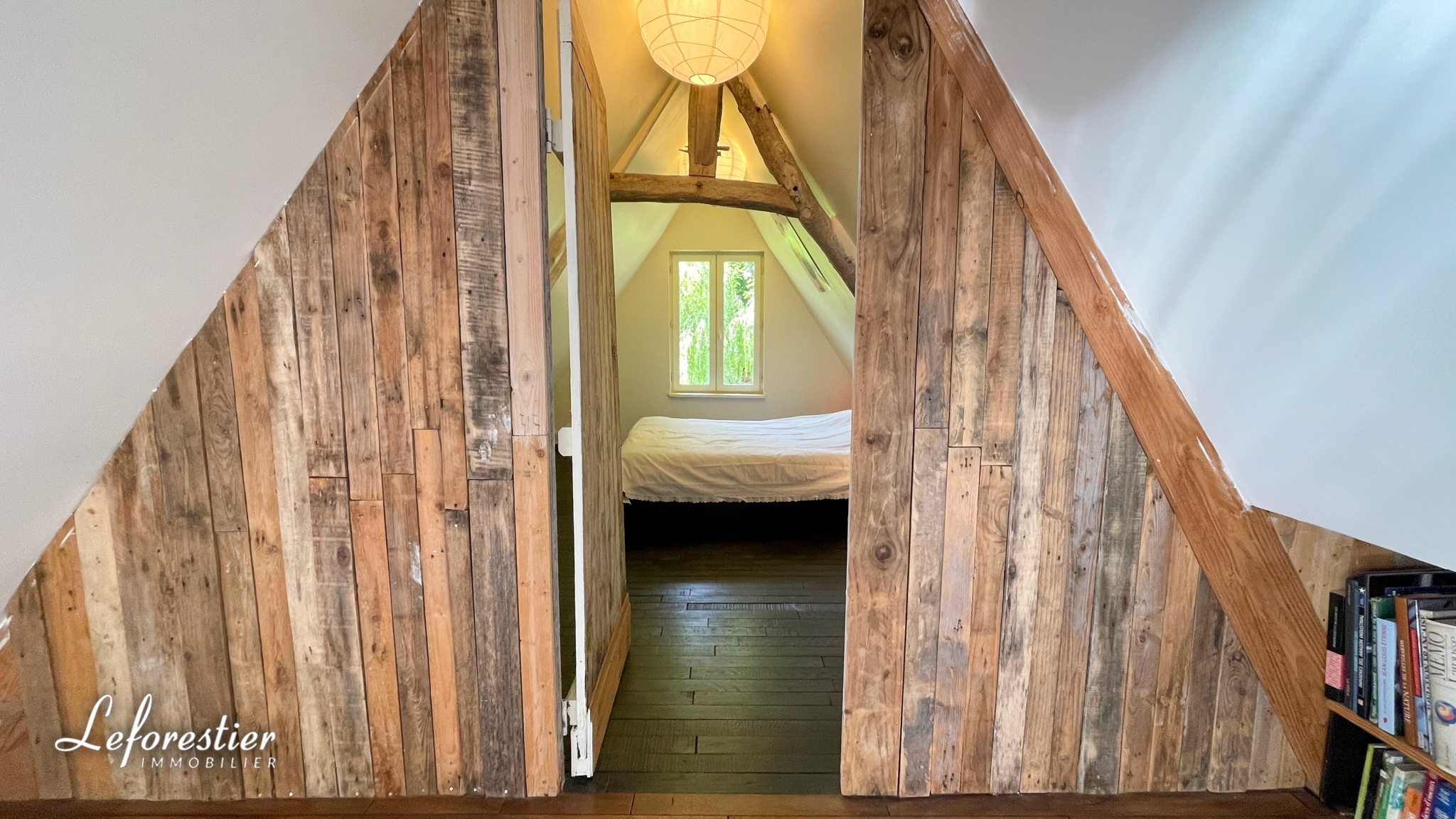 Au rez de chaussée, l'espace de vie (43m2) est spacieux et lumineux. Il comprend un salon séjour cosy avec son poêle à bois. La cuisine, ouverte, est conviviale grâce à ses volumes vitrés et charpente apparente. Le couloir dessert deux chambres de plain pied, une salle de bains et toilettes. A l'étage, palier à usage de bureau en mezzanine, chambre en pignon.