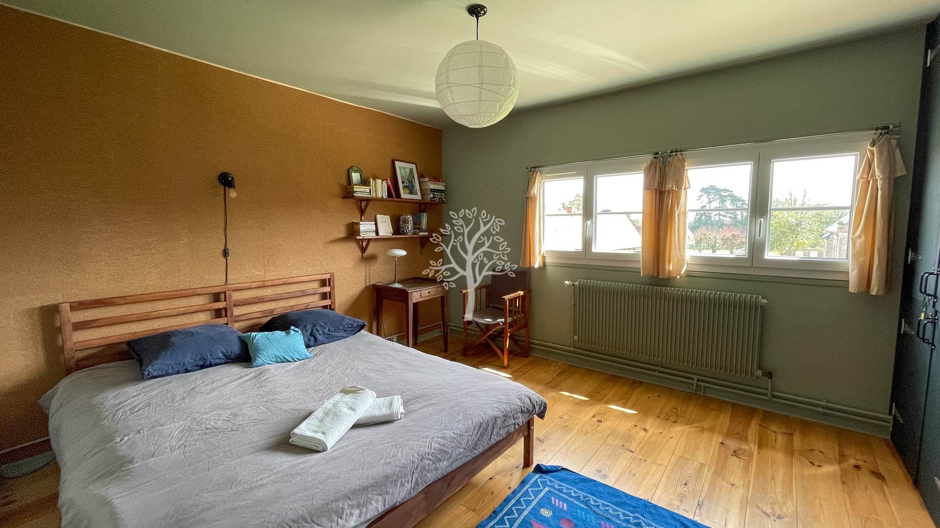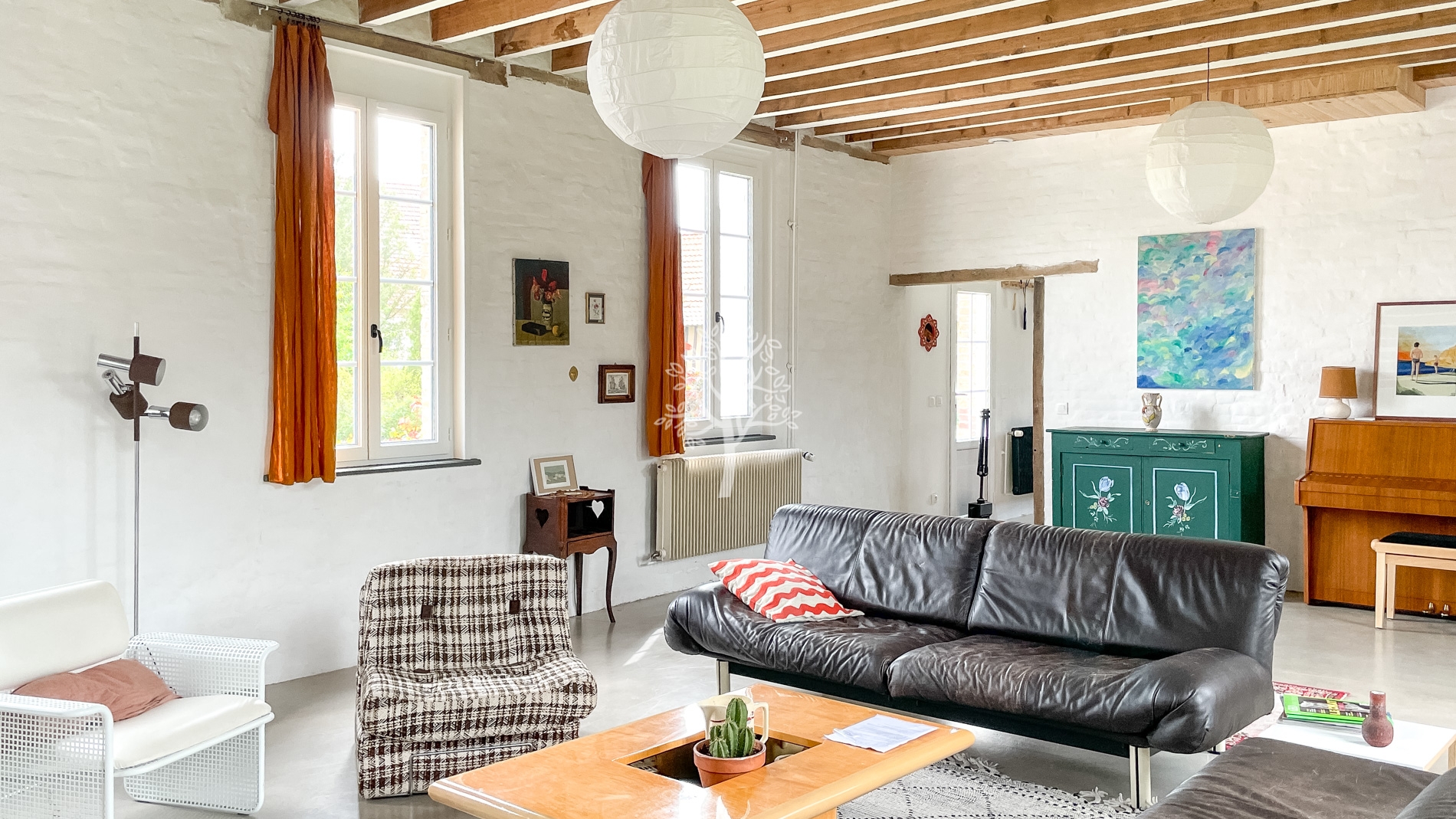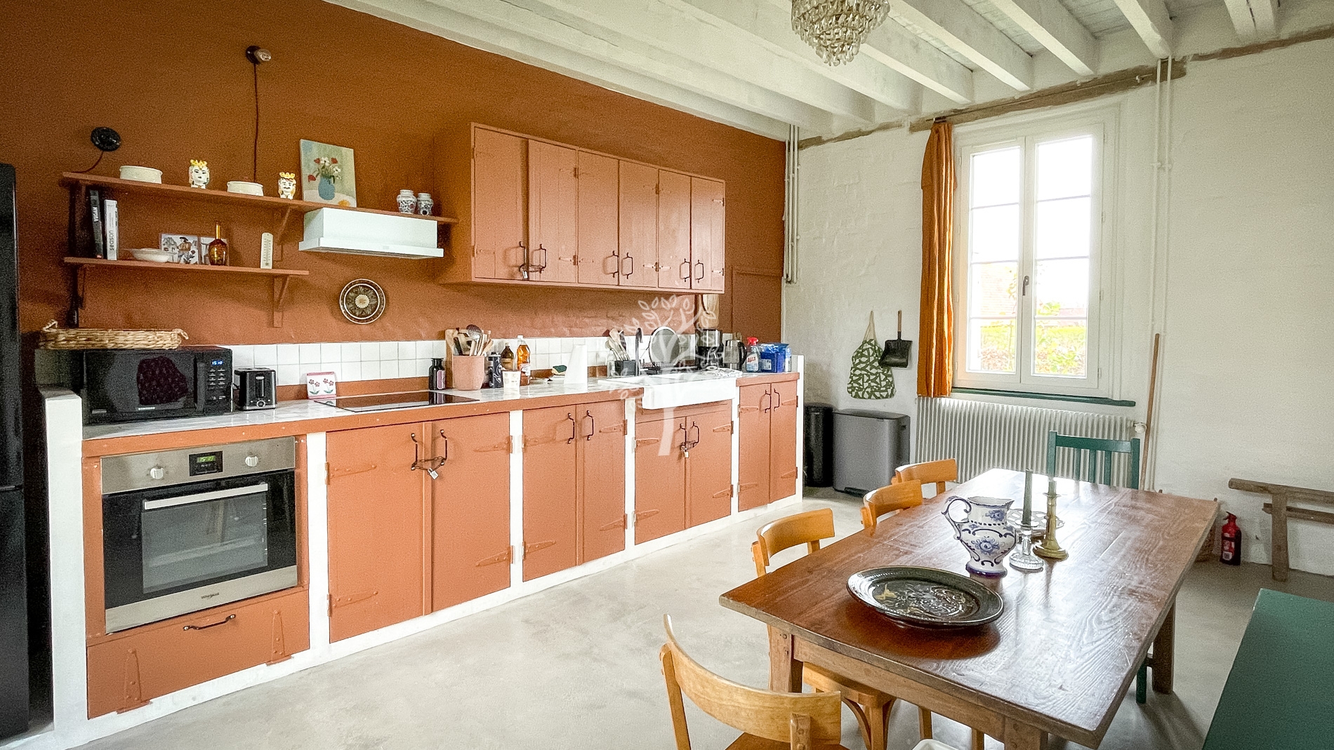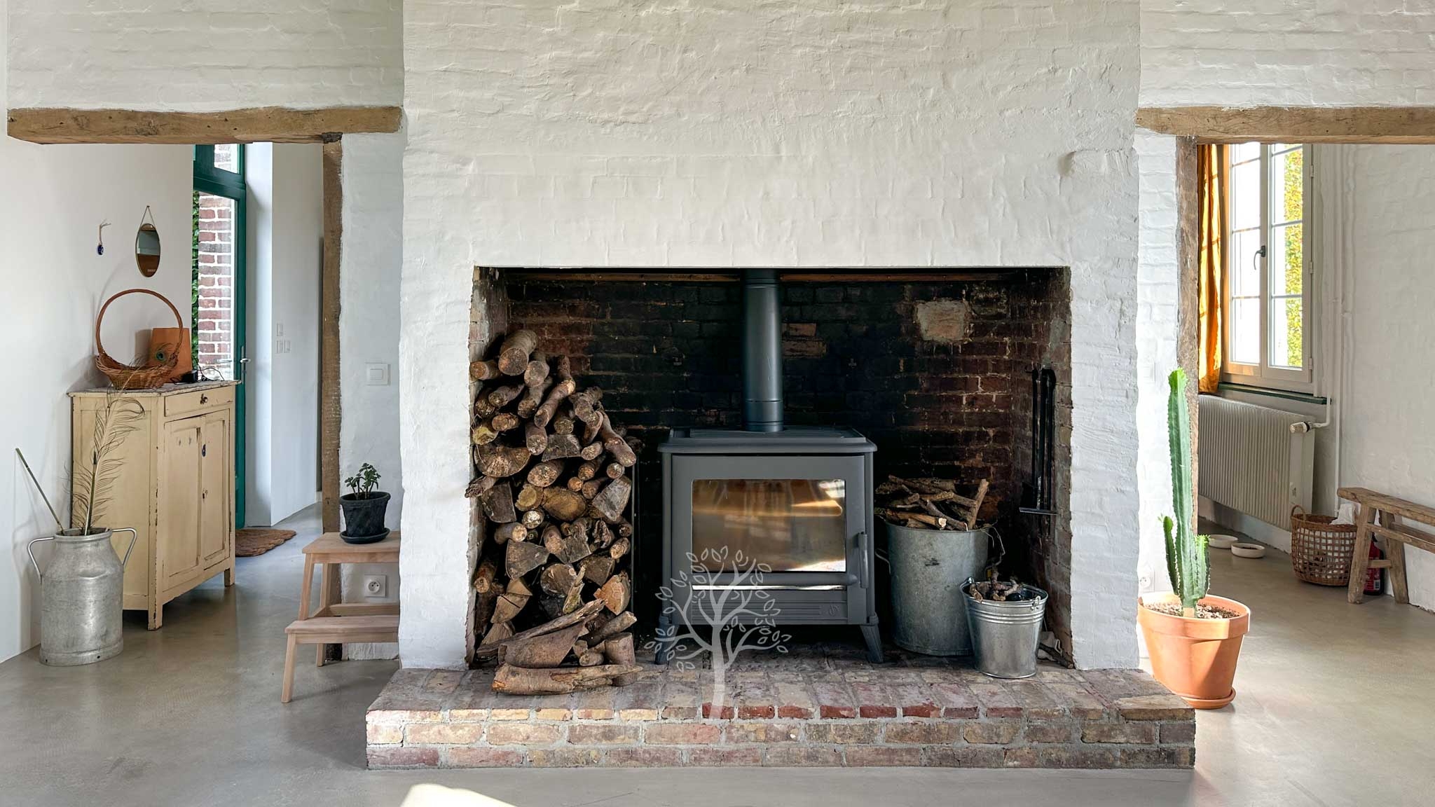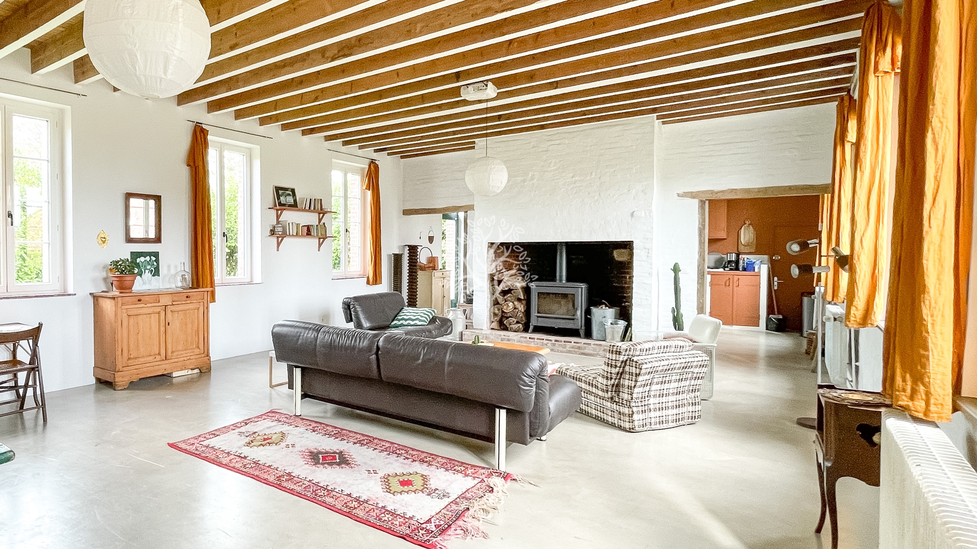 Dès l’entrée, on comprend que la restauration réalisée dans cette bâtisse a été faite avec le plus grand soin. Alliant matériaux modernes et respect de l’ancien, la grande pièce de vie est chaleureuse et lumineuse avec de grandes ouvertures et un poêle à bois. Le sol en béton ciré a été appliqué après un décaissement total pour éviter des remontées humides, défaut rencontré parfois dans les maisons anciennes.