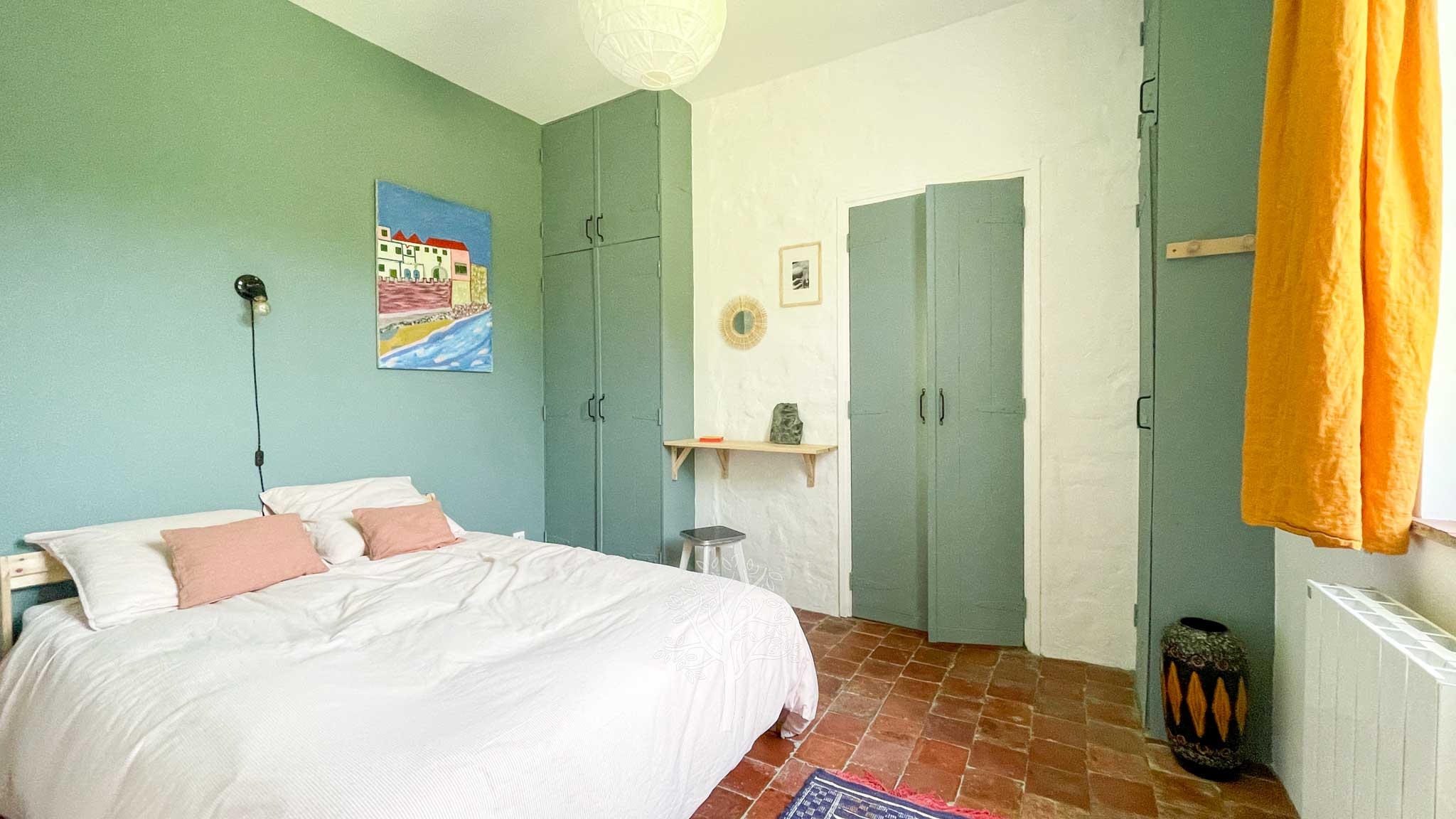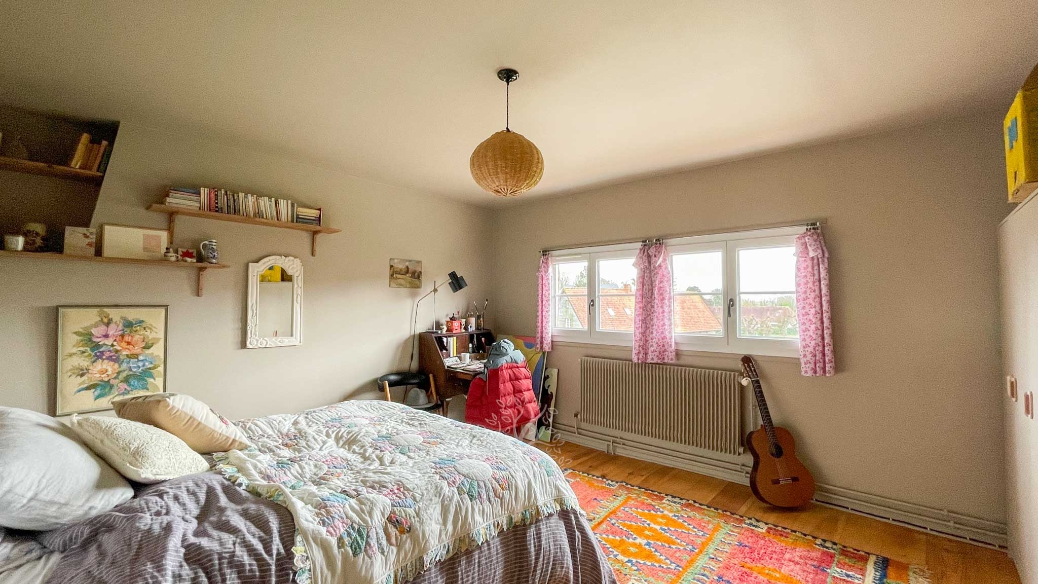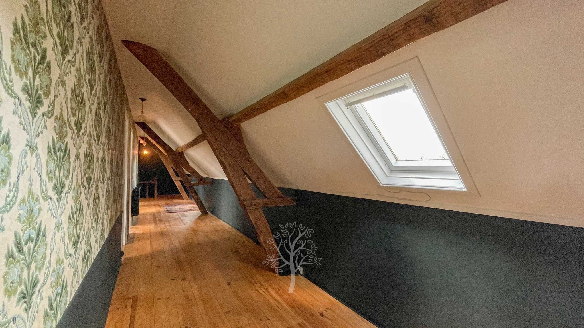 A l’étage les 4 chambres sont chaleureuses et faciles d’accès par large couloir. Une salle de douche avec WC est commune pour ces chambres.