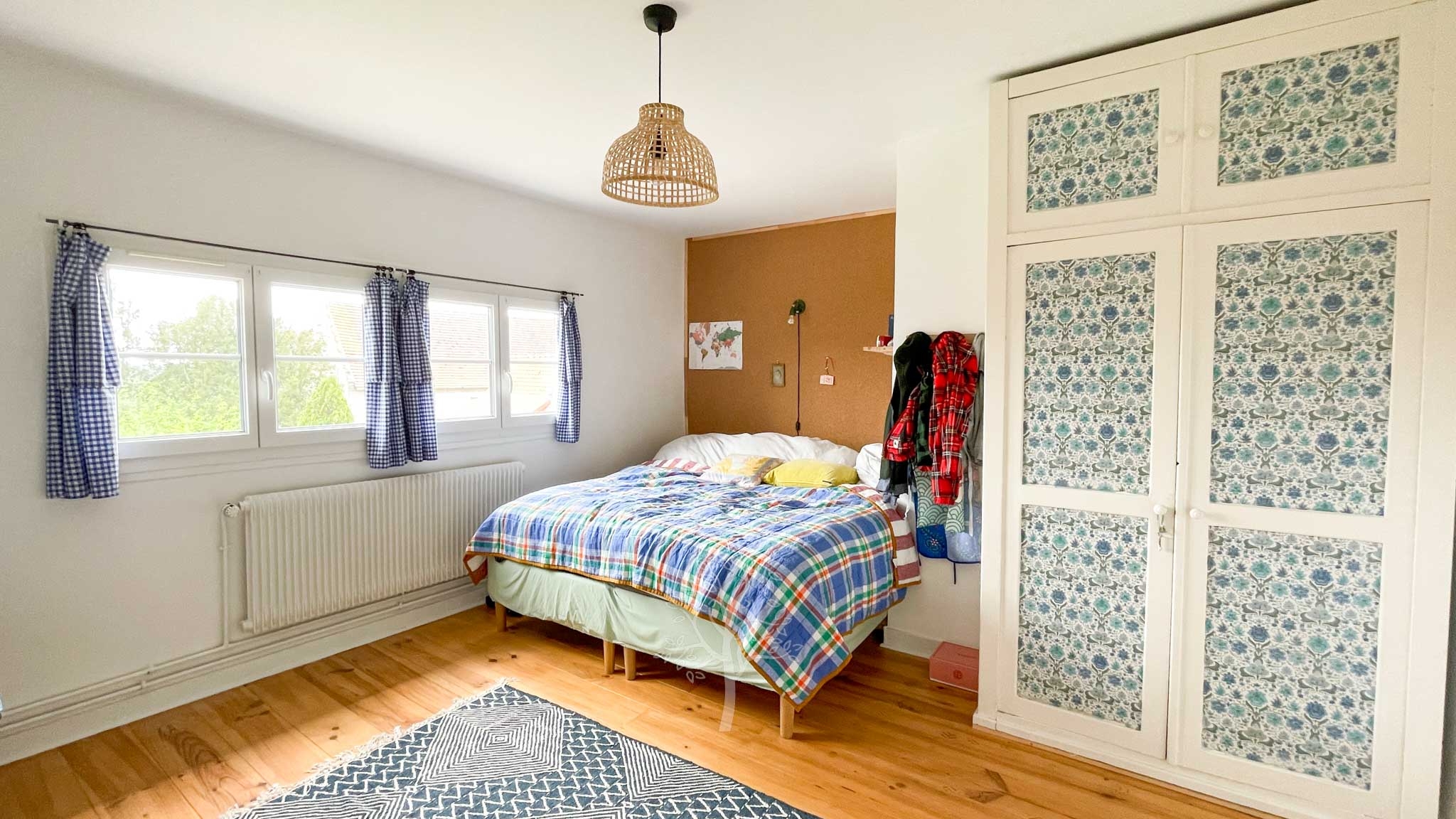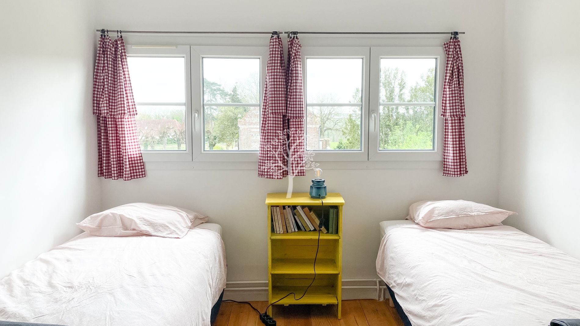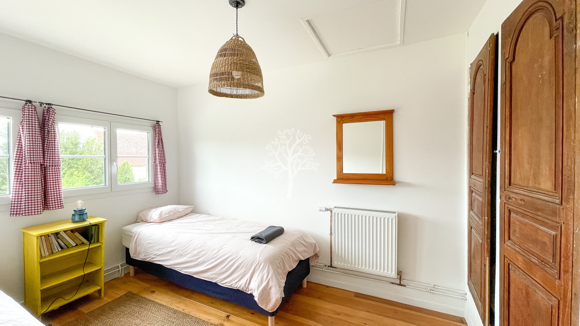 A l’étage les 4 chambres sont chaleureuses et faciles d’accès par large couloir. Une salle de douche avec WC est commune pour ces chambres.