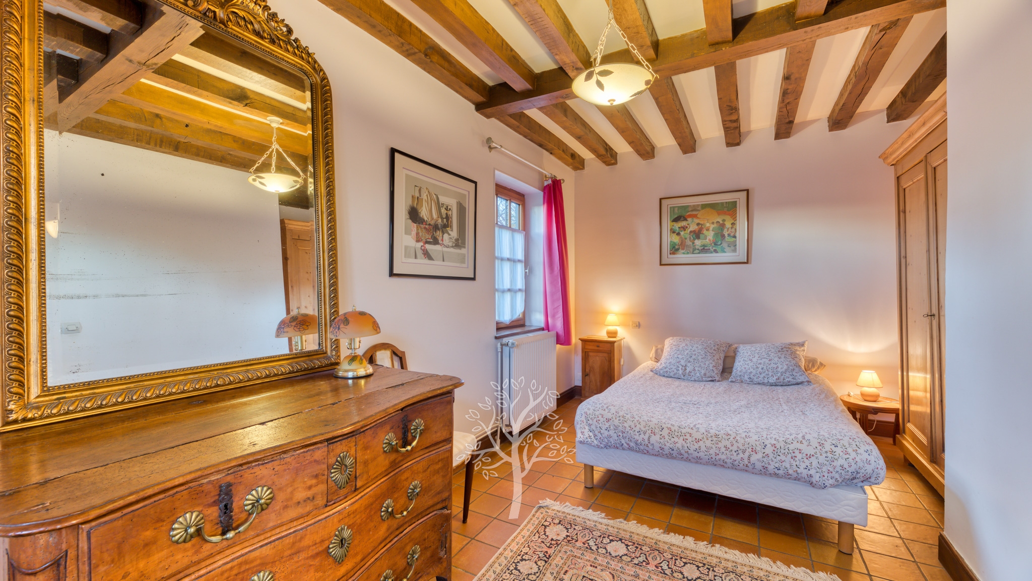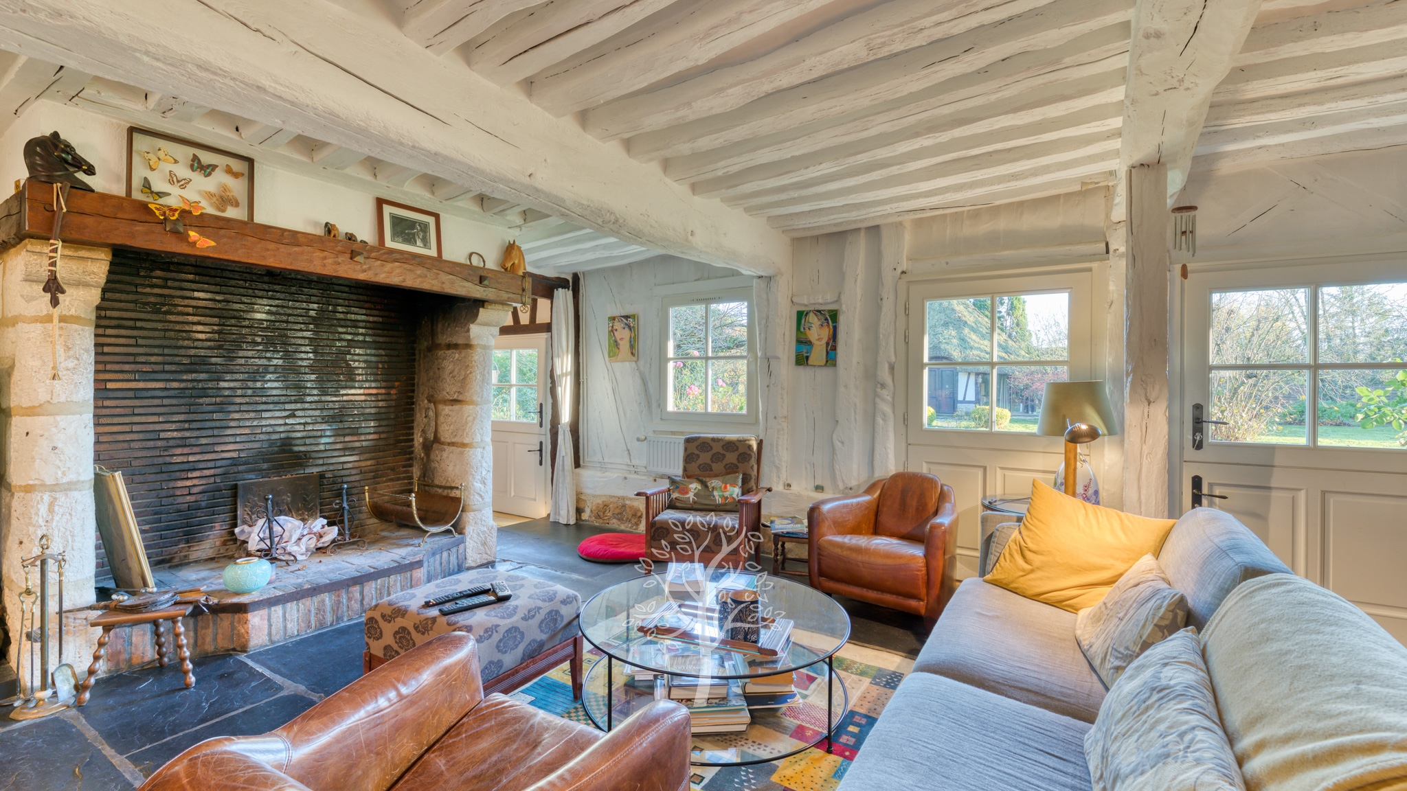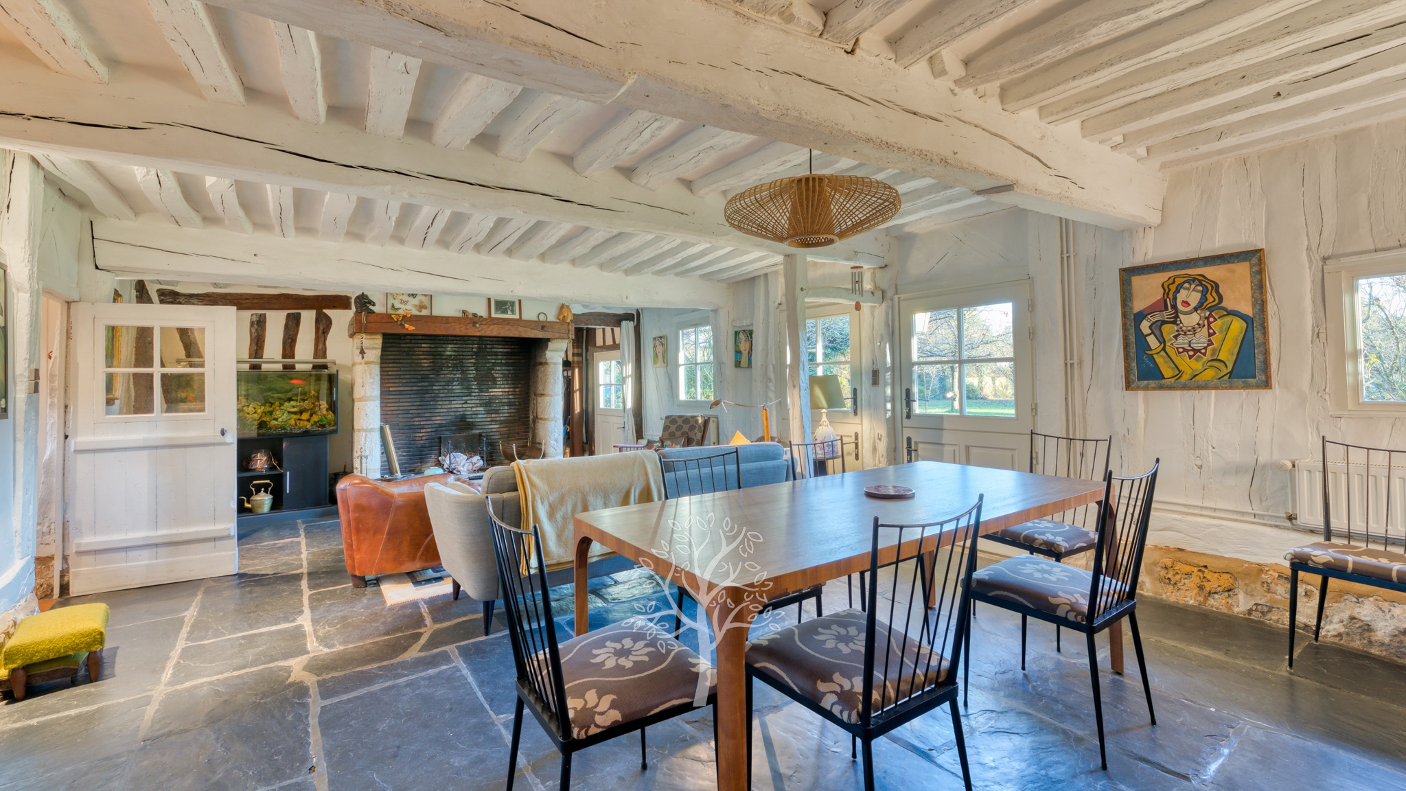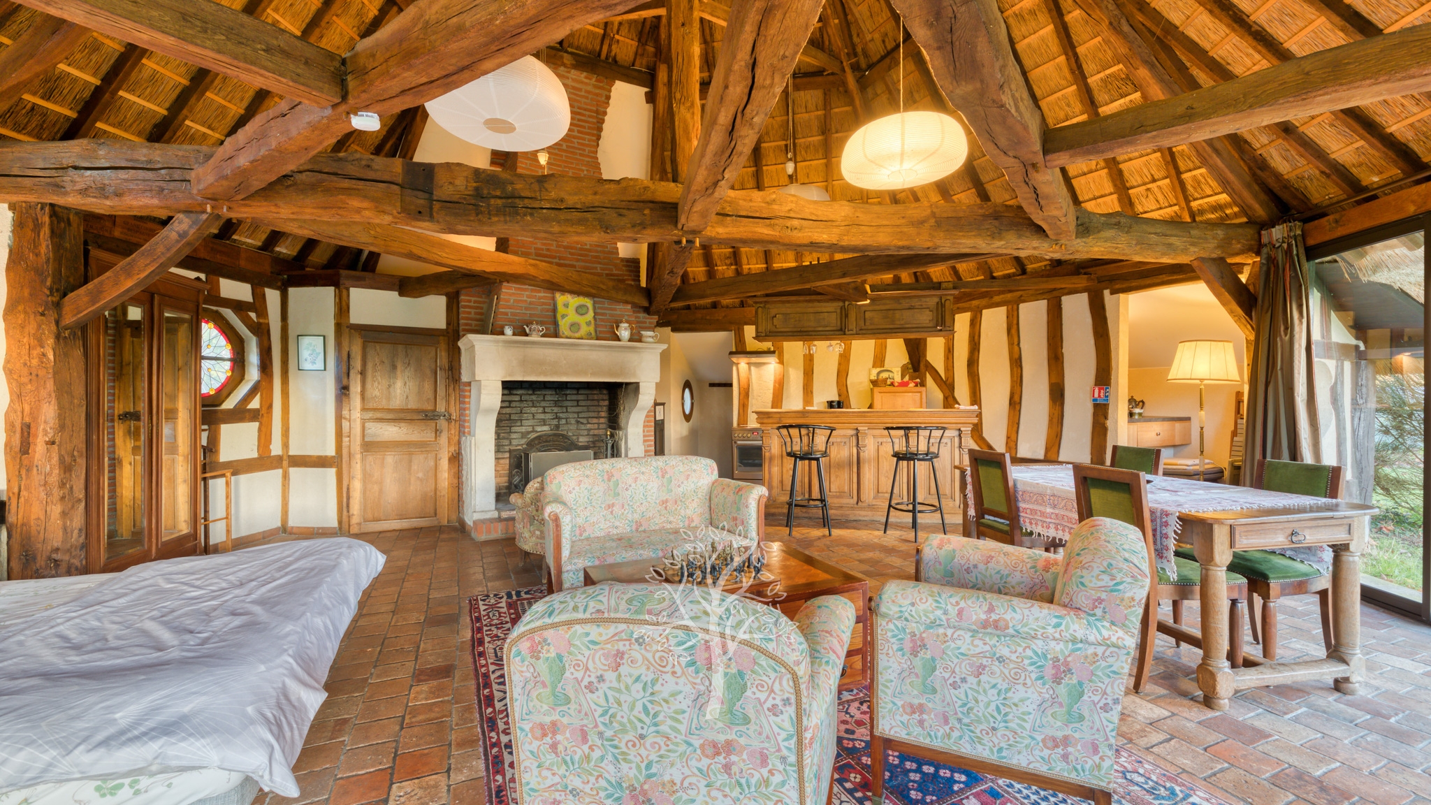La maison principale du 16e siècle, avec ses 160 m2, offre non seulement un espace généreux mais aussi une atmosphère chargée d'authenticité. La pièce de vie est confortable La cheminée cauchoise. Les poutres blanchies apportent une atmosphère très actuelle, et surtout de la luminosité, le sol en ardoise dans la pièce de vie contribuent au caractère de cet espace complété par la cuisine semi ouverte et la petite arrière-cuisine. Le grand bureau avec sa cheminée en bois et d'autres caractéristiques architecturales historiques donnent l'impression d'un lieu unique et accueillant. Le rez-de-chaussée est complété par deux chambres et un WC.