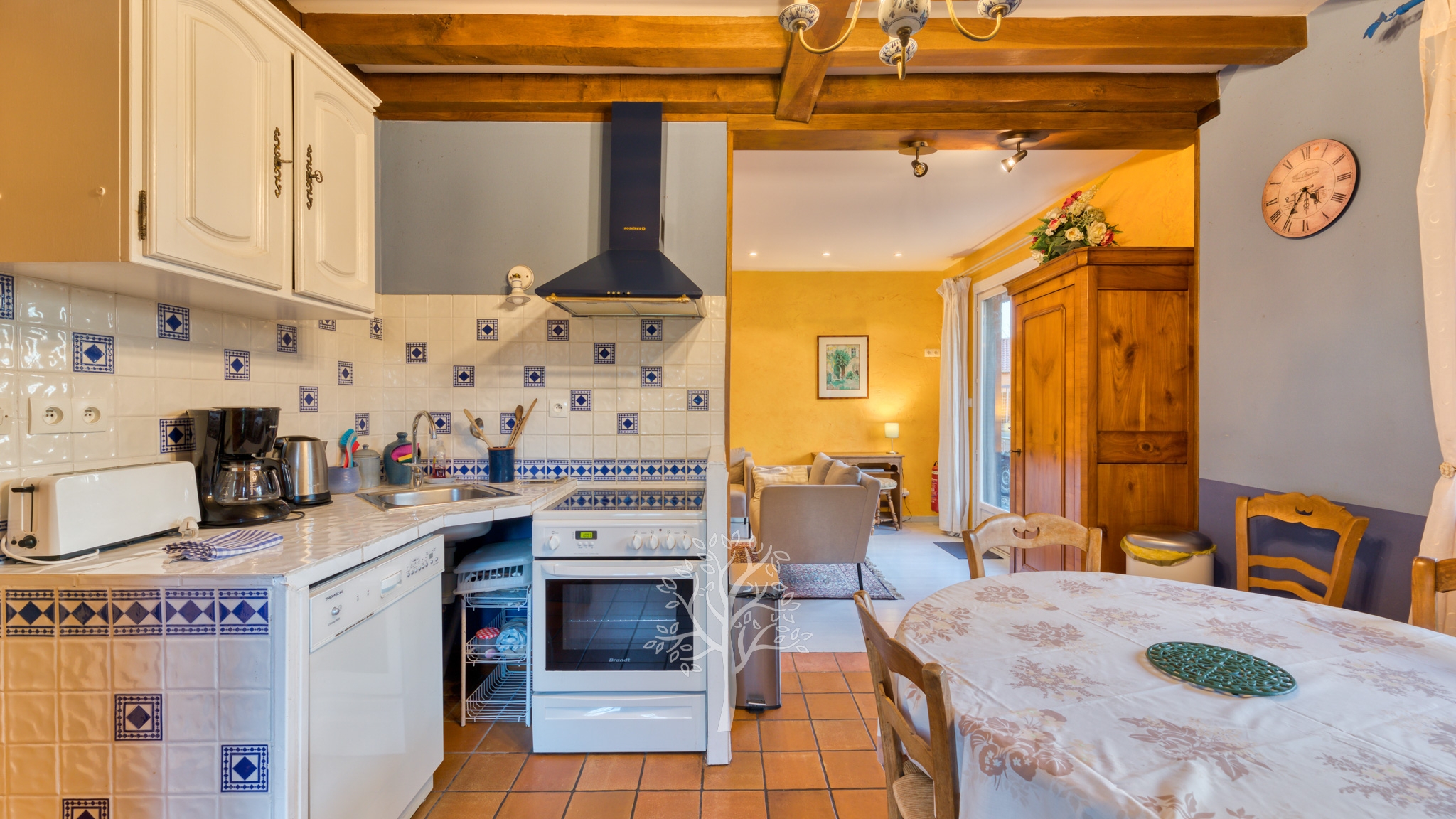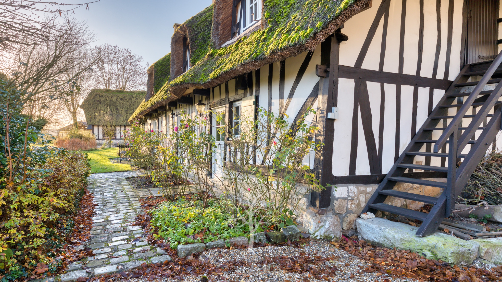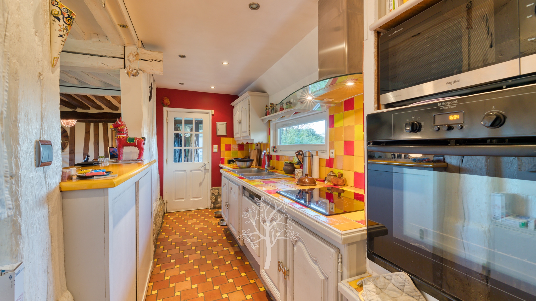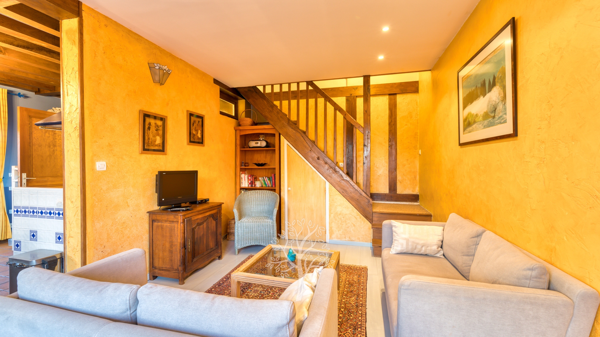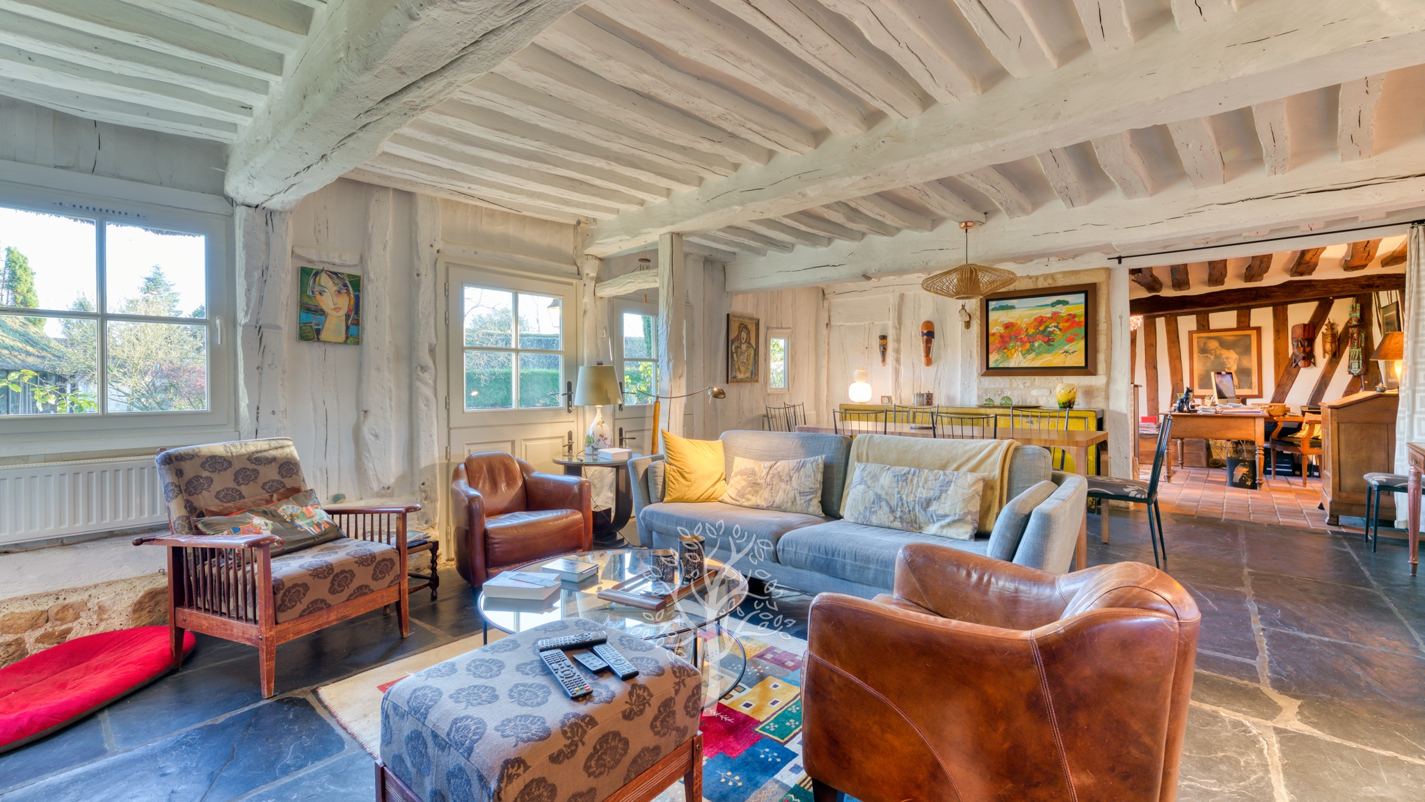 La maison principale du 16e siècle, avec ses 160 m2, offre non seulement un espace généreux mais aussi une atmosphère chargée d'authenticité. La pièce de vie est confortable La cheminée cauchoise. Les poutres blanchies apportent une atmosphère très actuelle, et surtout de la luminosité, le sol en ardoise dans la pièce de vie contribuent au caractère de cet espace complété par la cuisine semi ouverte et la petite arrière-cuisine. Le grand bureau avec sa cheminée en bois et d'autres caractéristiques architecturales historiques donnent l'impression d'un lieu unique et accueillant. Le rez-de-chaussée est complété par deux chambres et un WC.