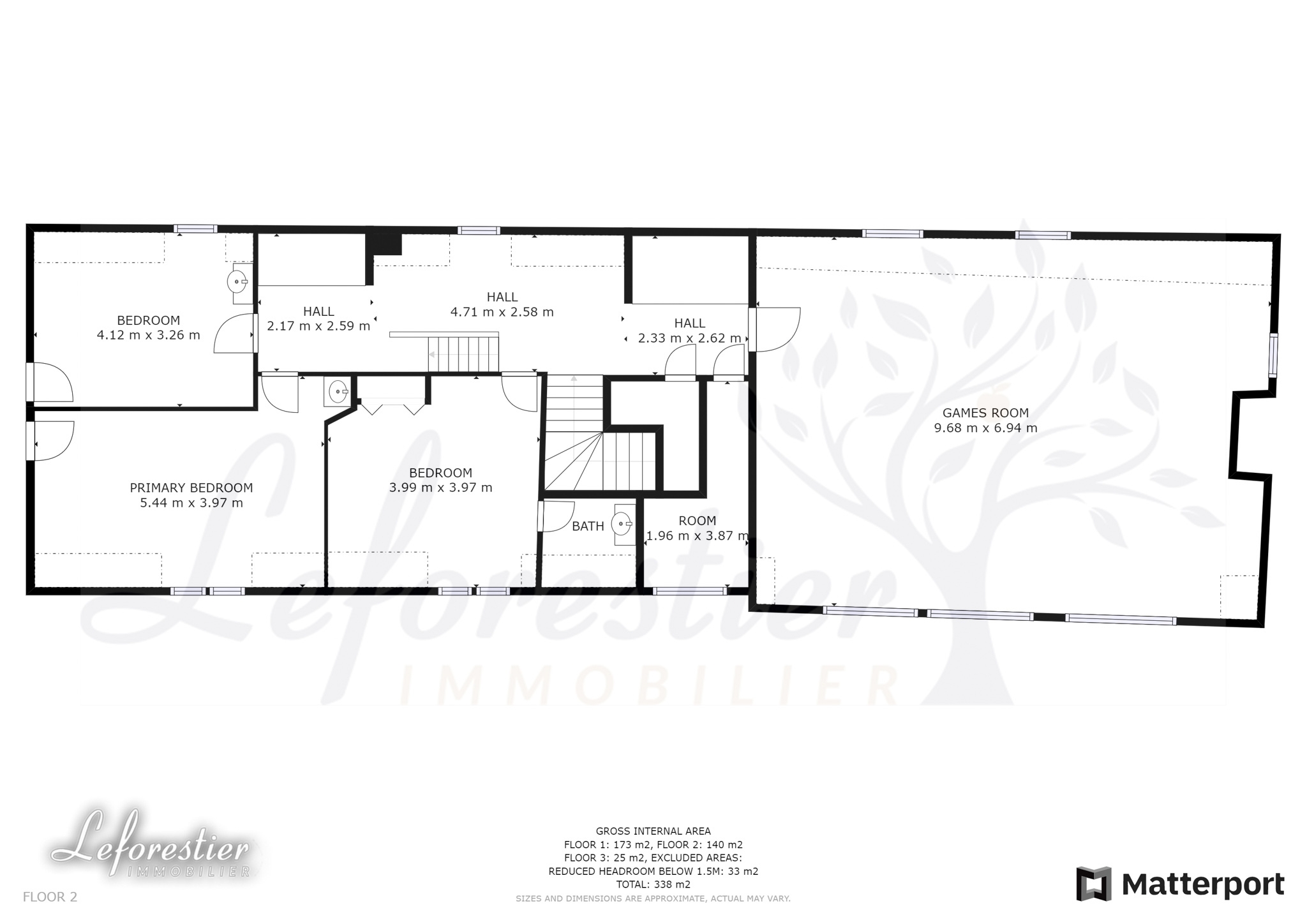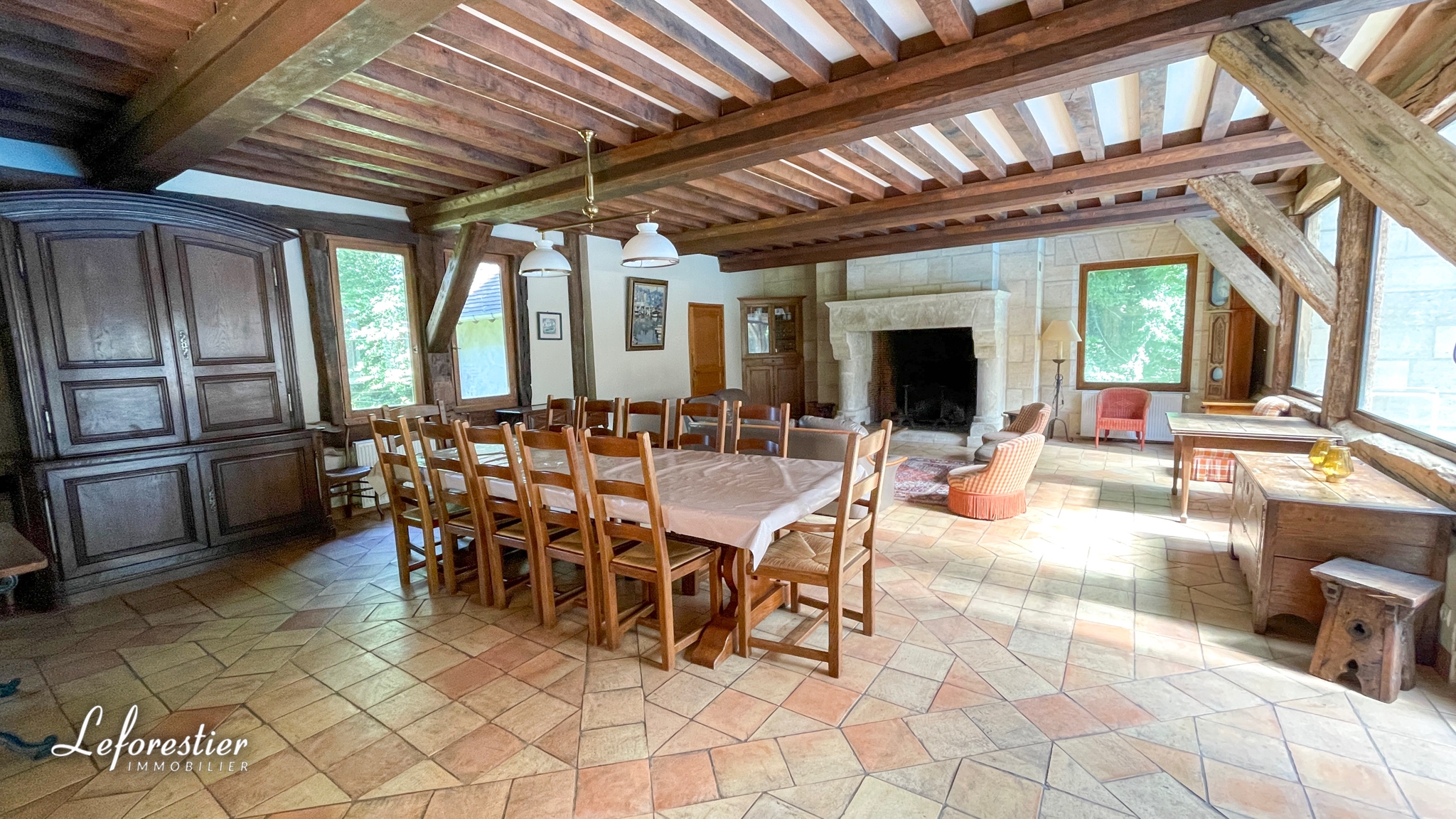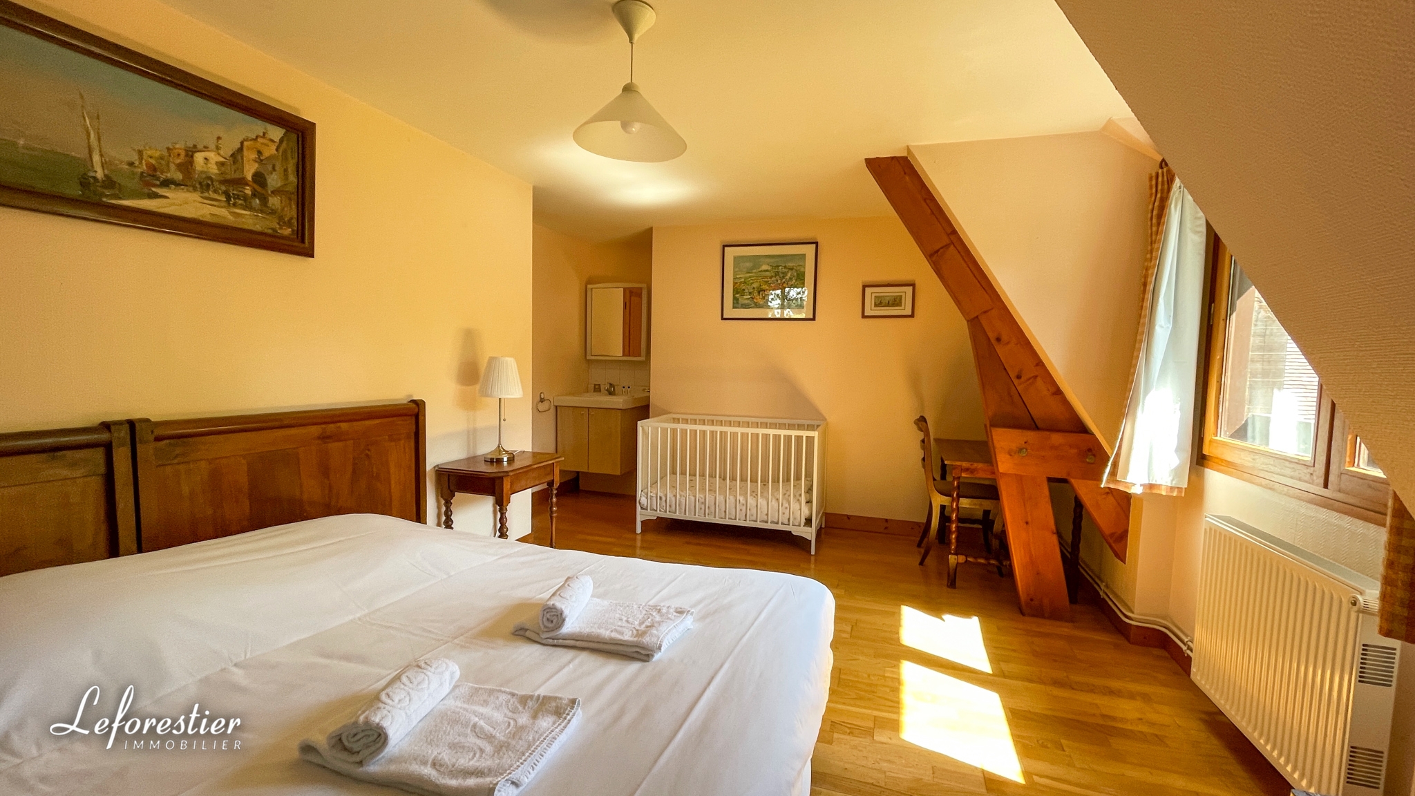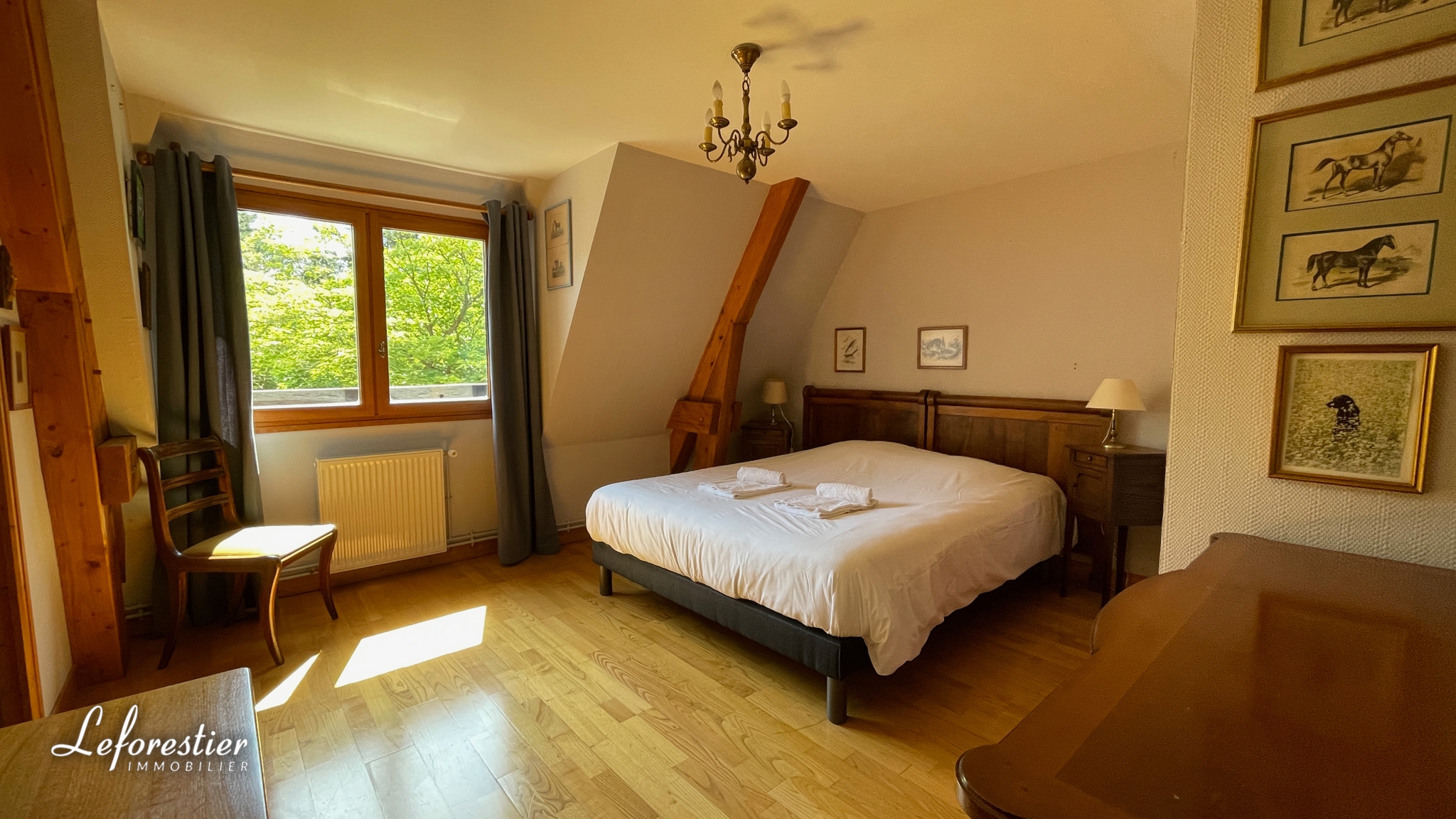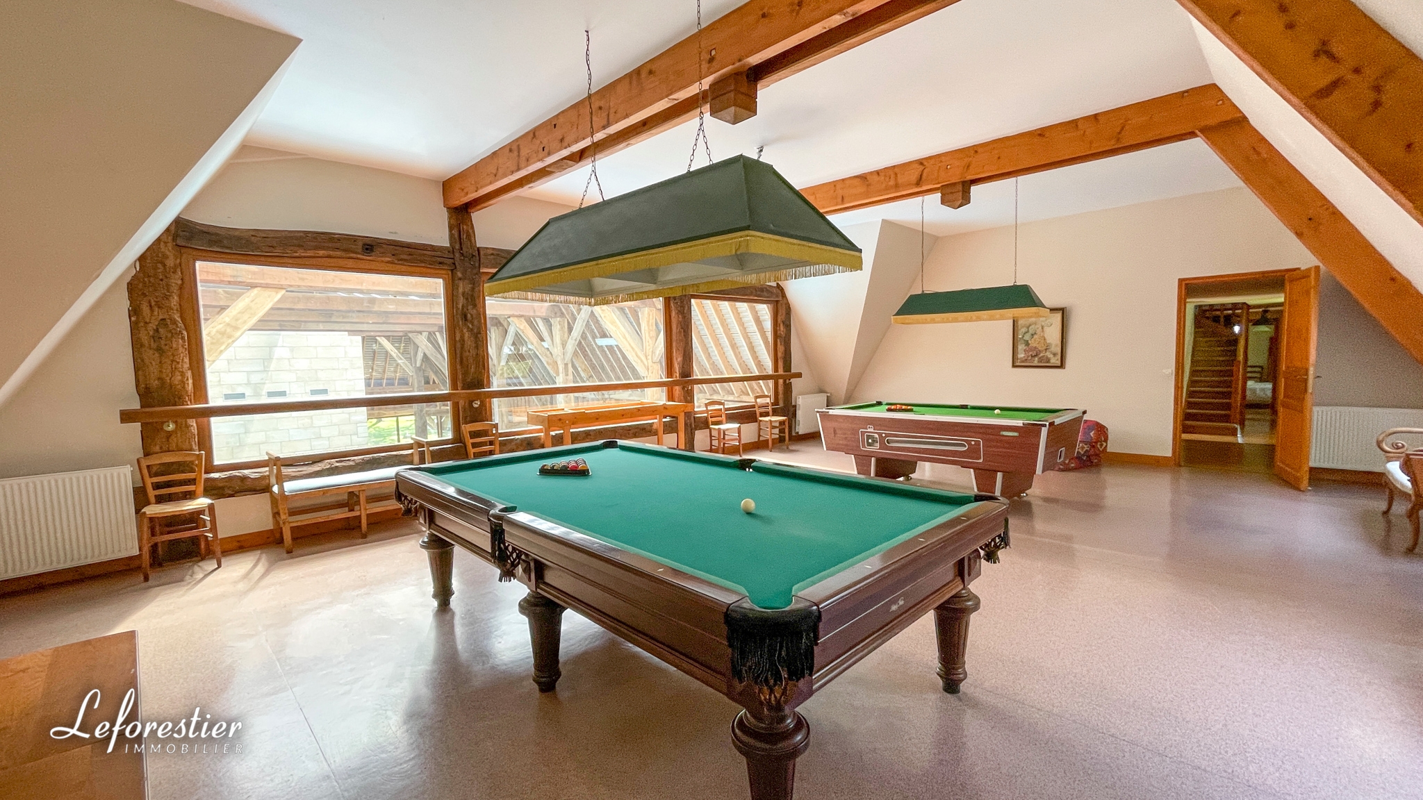 Aujourd’hui utilisée en gîte, la seconde maison offre également des proportions hors normes : deux grands salons accueilleront de nombreux convives. En lien direct, la piscine intérieure est couverte et chauffée. Aux étages, 5 chambres et une grande salle de jeux ayant vue sur la piscine ! Ce gîte génère un revenu locatif annuel de 80 000 euros qui couvre très aisément les charges.