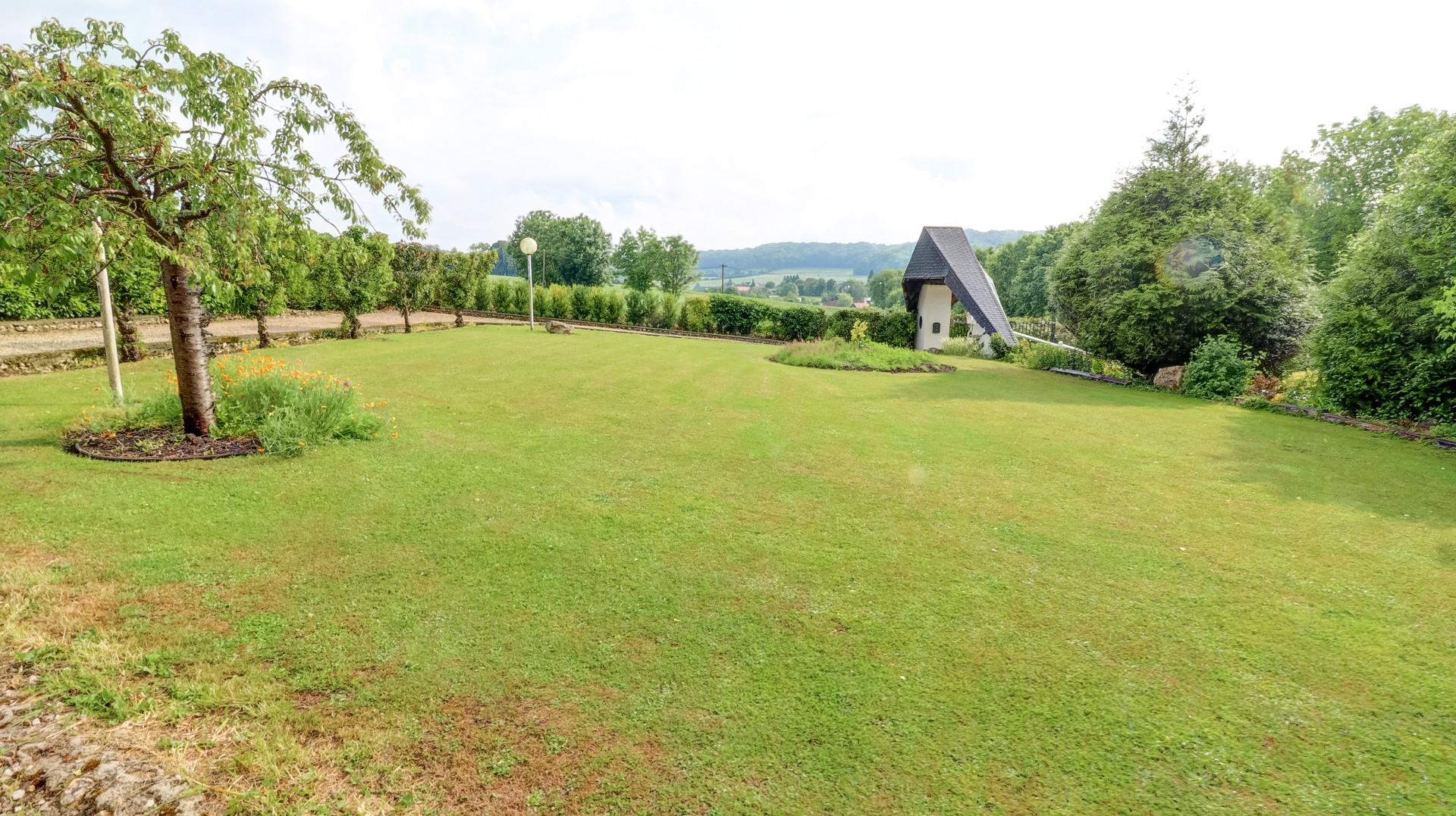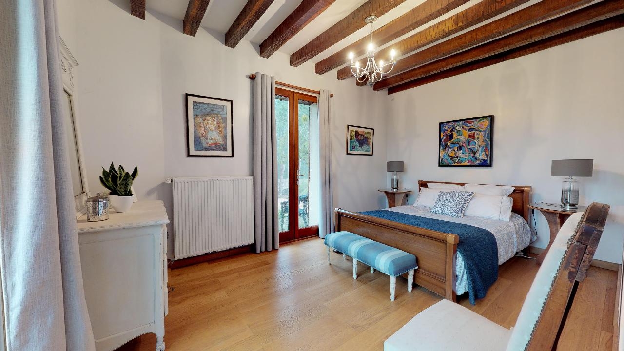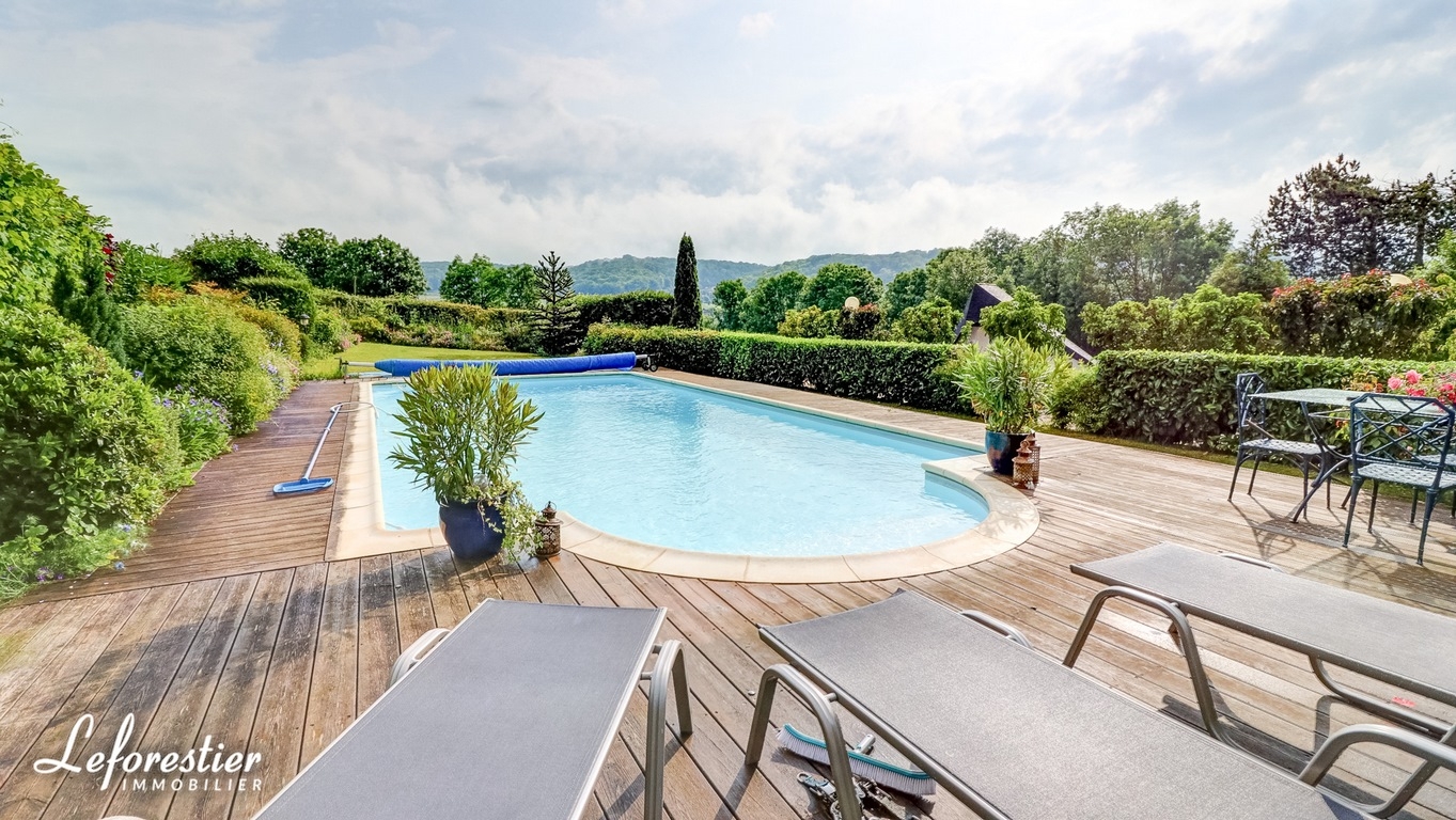Le chauffage est assuré par une chaudière à gaz dernière génération qui produit une chaleur efficace à laquelle le poêle à bois du salon contribue en hiver. Les ouvertures en bois double vitrage ont toutes une vue splendide du jardin clos qui domine la campagne environnante. Côté sud, la piscine chauffée de 6 m X 12 m s’intègre bien au centre de sa terrasse en bois bordée de massifs fleuris. Un garage en sous-sol abrite deux véhicules qui accèdent à la propriété par deux entrées différentes sur la petite route de campagne menant au centre du village.