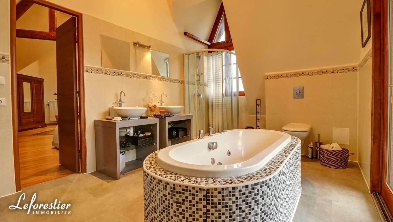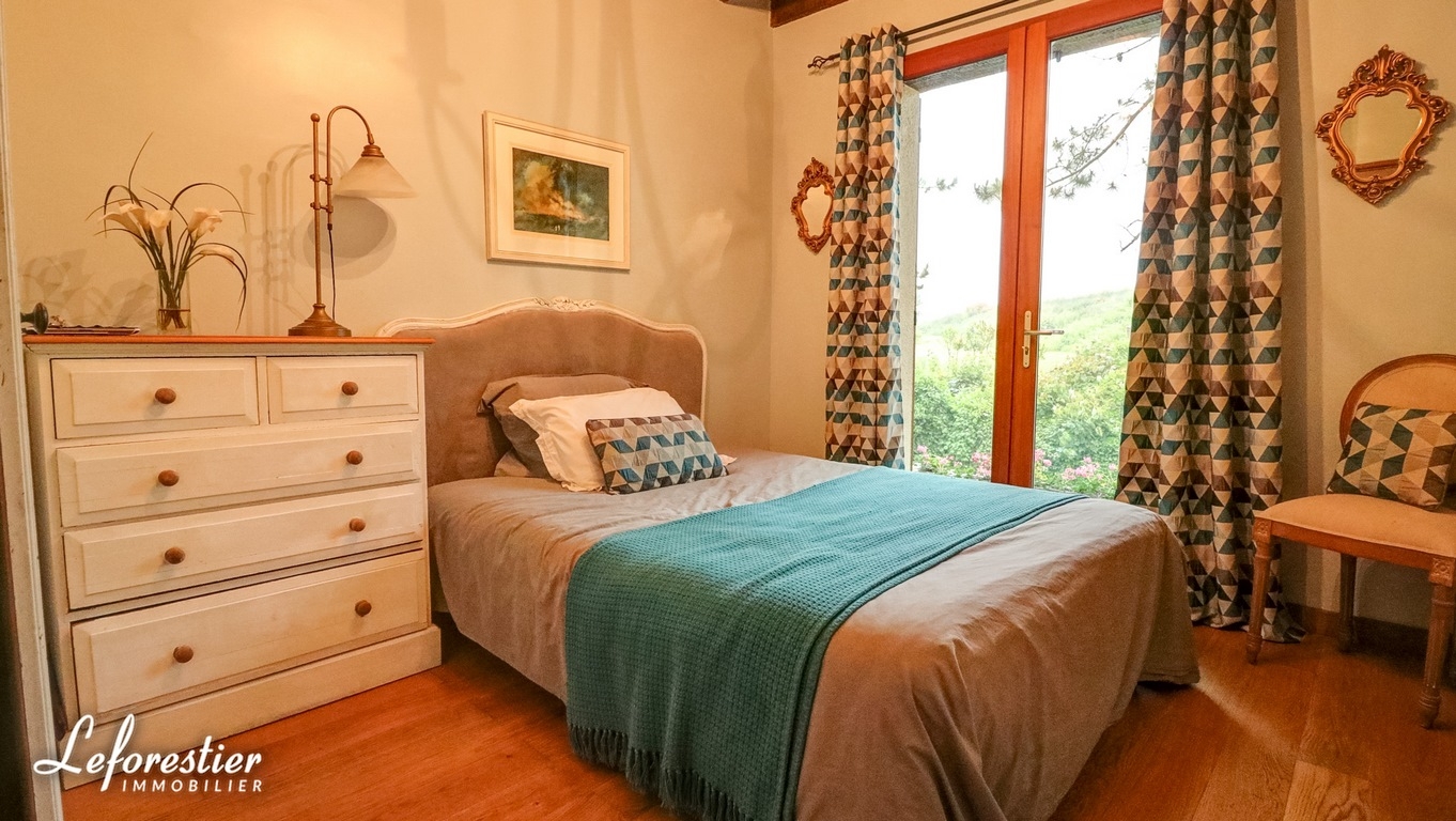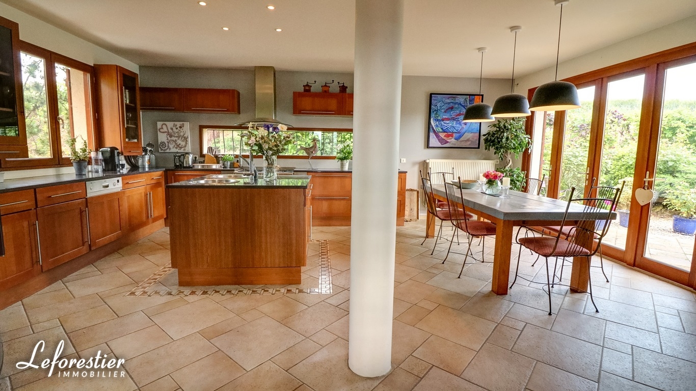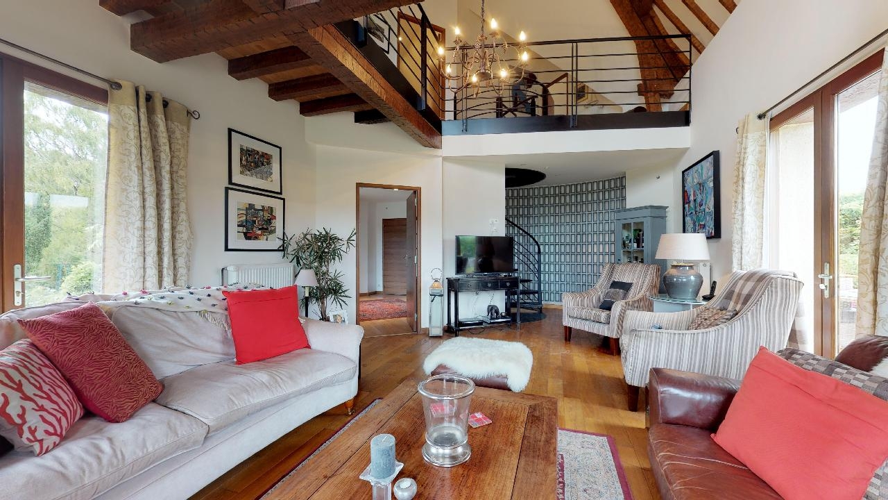 Dotée de cinq chambres, dont deux de plain-pied, de trois salles de bains, d’un grand salon avec une mezzanine au-dessus, d’une vaste cuisine-salle à manger dont la porte-fenêtre ouvre sur une belle terrasse, d’une belle salle de jeux, elle peut accueillir une grande famille et recevoir les amis confortablement.