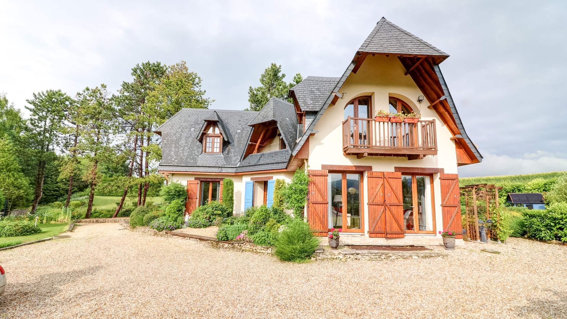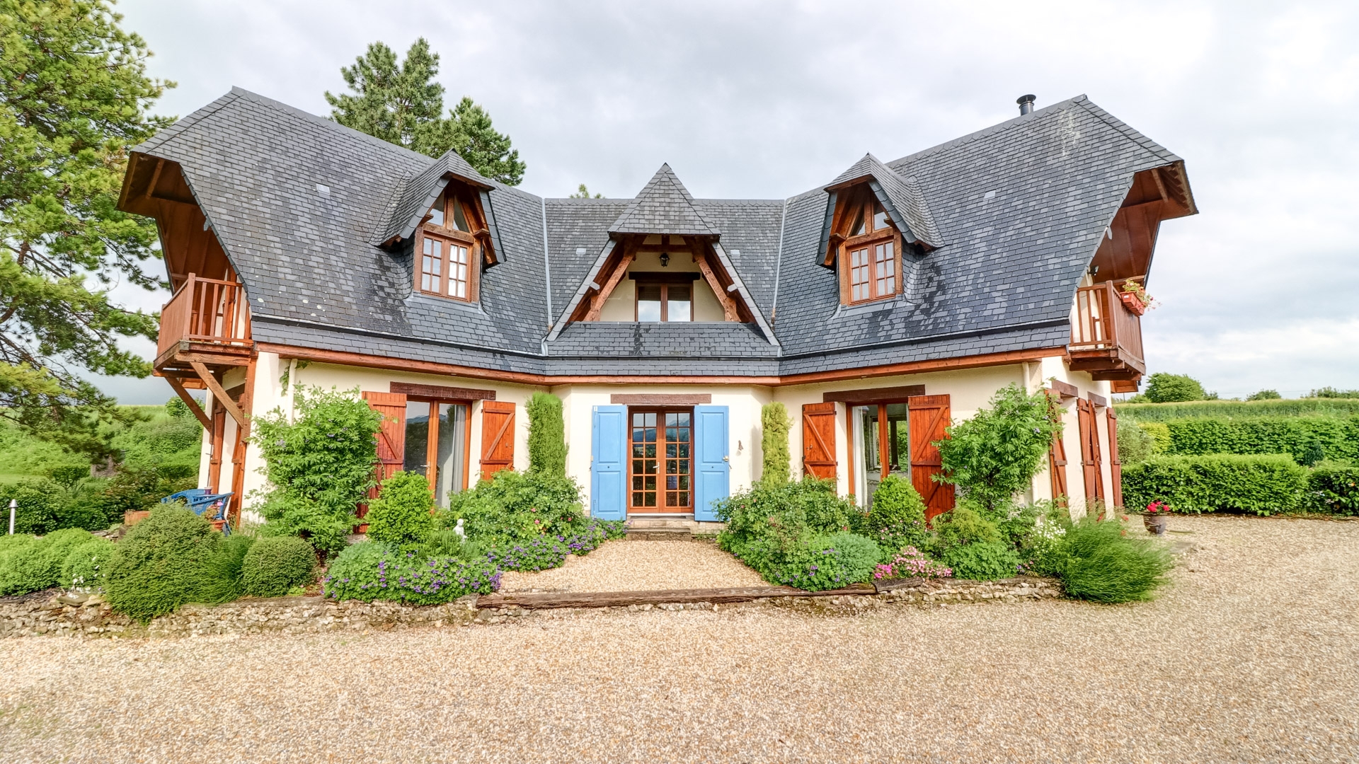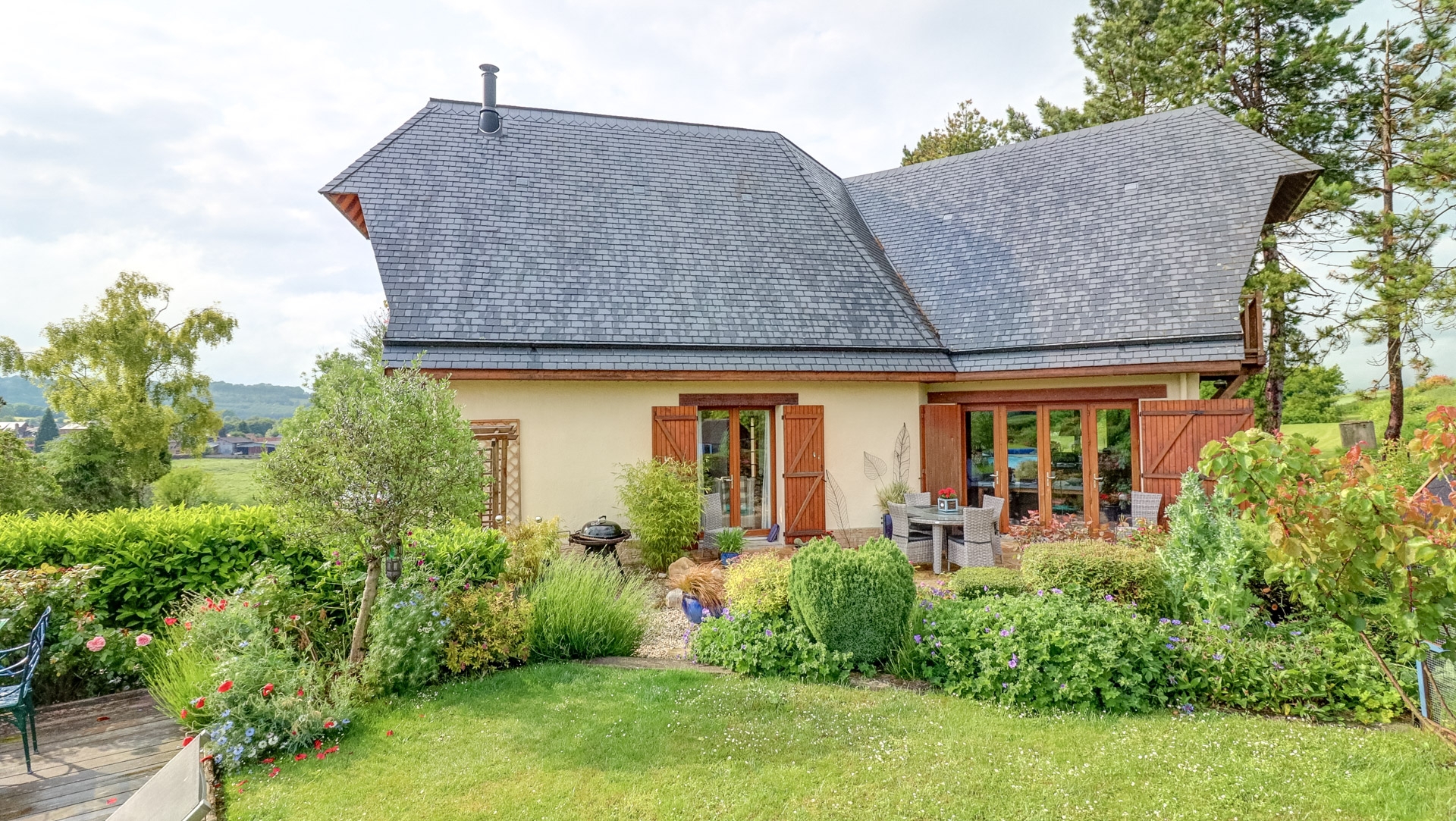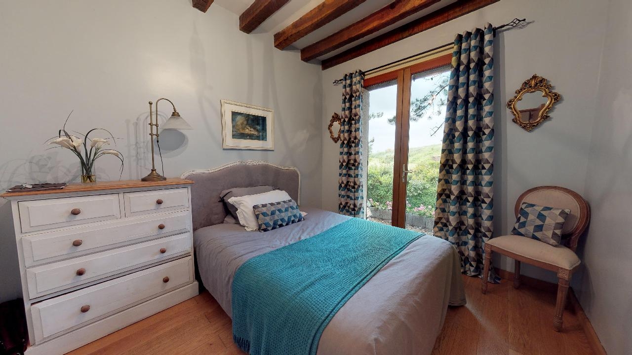 Dotée de cinq chambres, dont deux de plain-pied, de trois salles de bains, d’un grand salon avec une mezzanine au-dessus, d’une vaste cuisine-salle à manger dont la porte-fenêtre ouvre sur une belle terrasse, d’une belle salle de jeux, elle peut accueillir une grande famille et recevoir les amis confortablement.