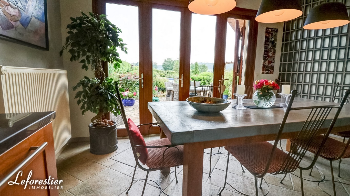 L’environnement immédiat de cette maison d’architecte à vendre est champêtre et boisé. Le lieu est très calme et la vue panoramique. Du haut de l’emplacement surélevé, on peut admirer le joli clocher de l’église gothique de Bully.