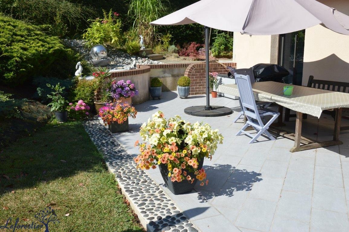 Les baies vitrées de la piscine ouvrent sur une belle terrasse avec vue sur le clocher de l’église. Sous la terrasse, un grand atelier permet de ranger tous les outils et les vélos. Le jardin joliment fleuri est clos et facile à entretenir, l’accès se fait par le portail automatique. Un grand espace bitumé devant le garage permet de garer plusieurs véhicules en toute sécurité.