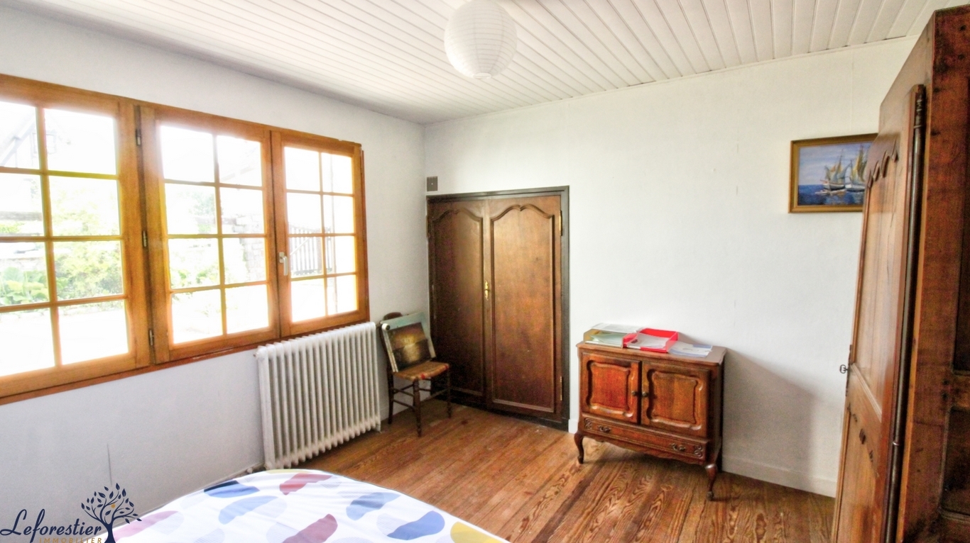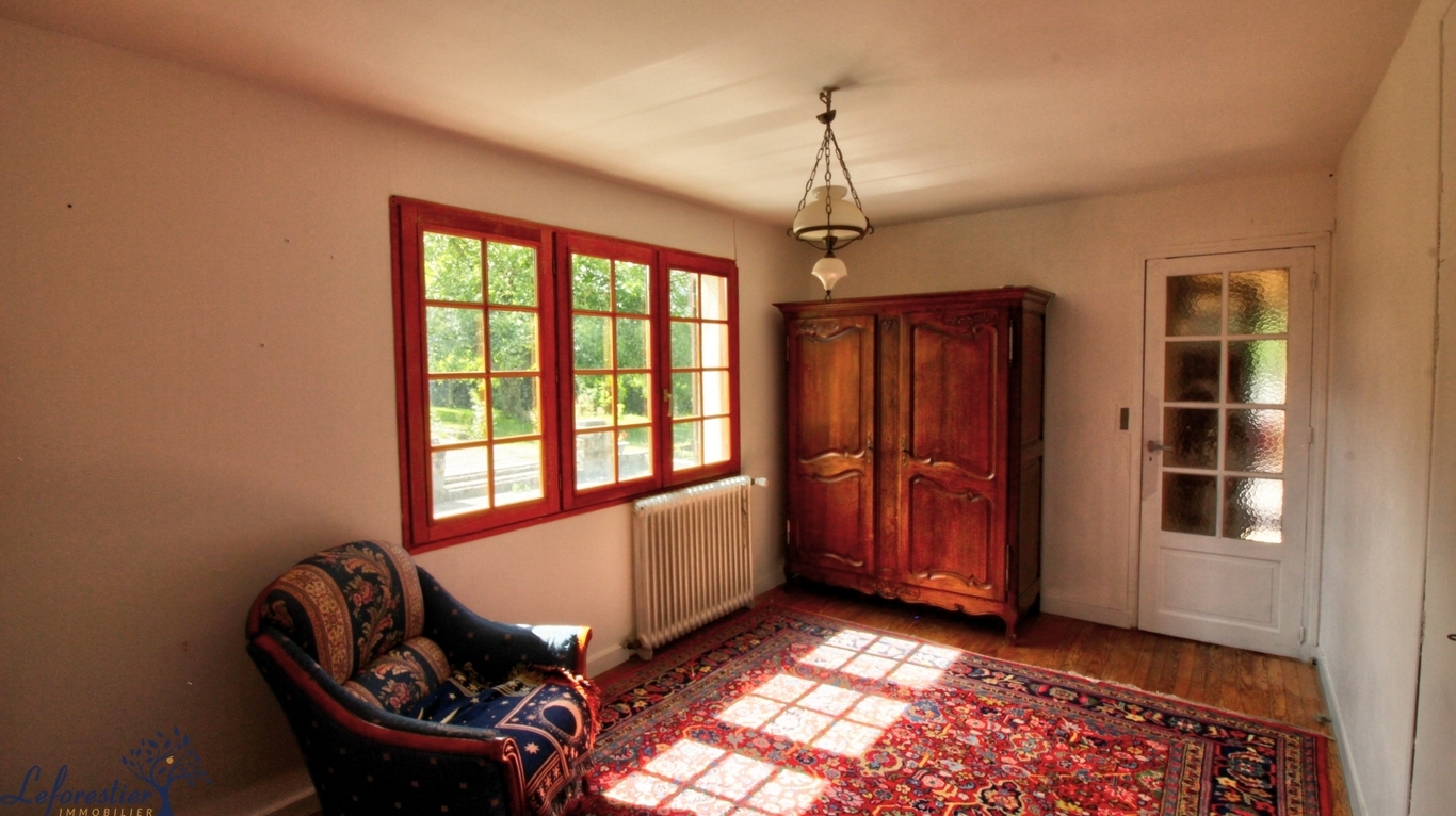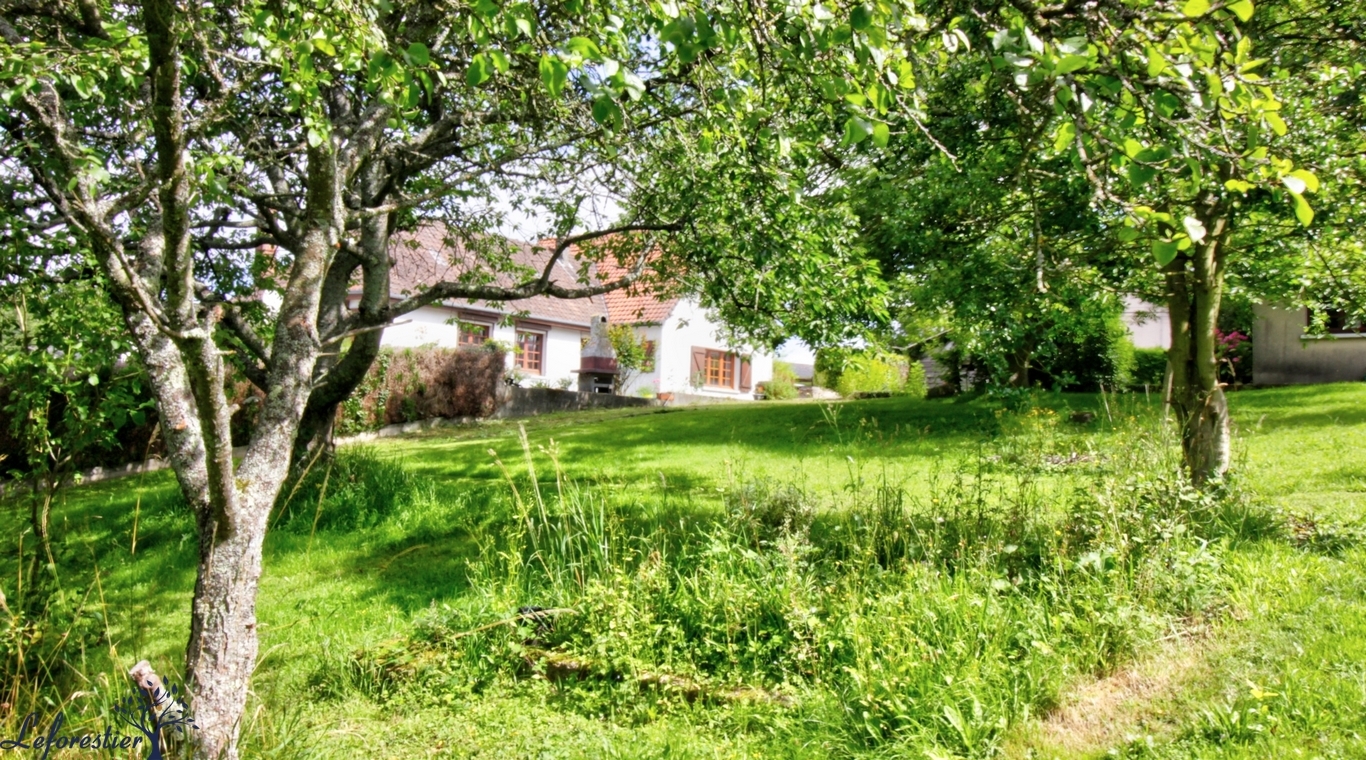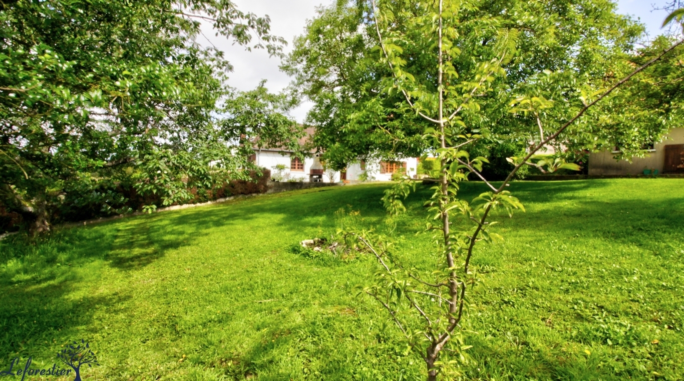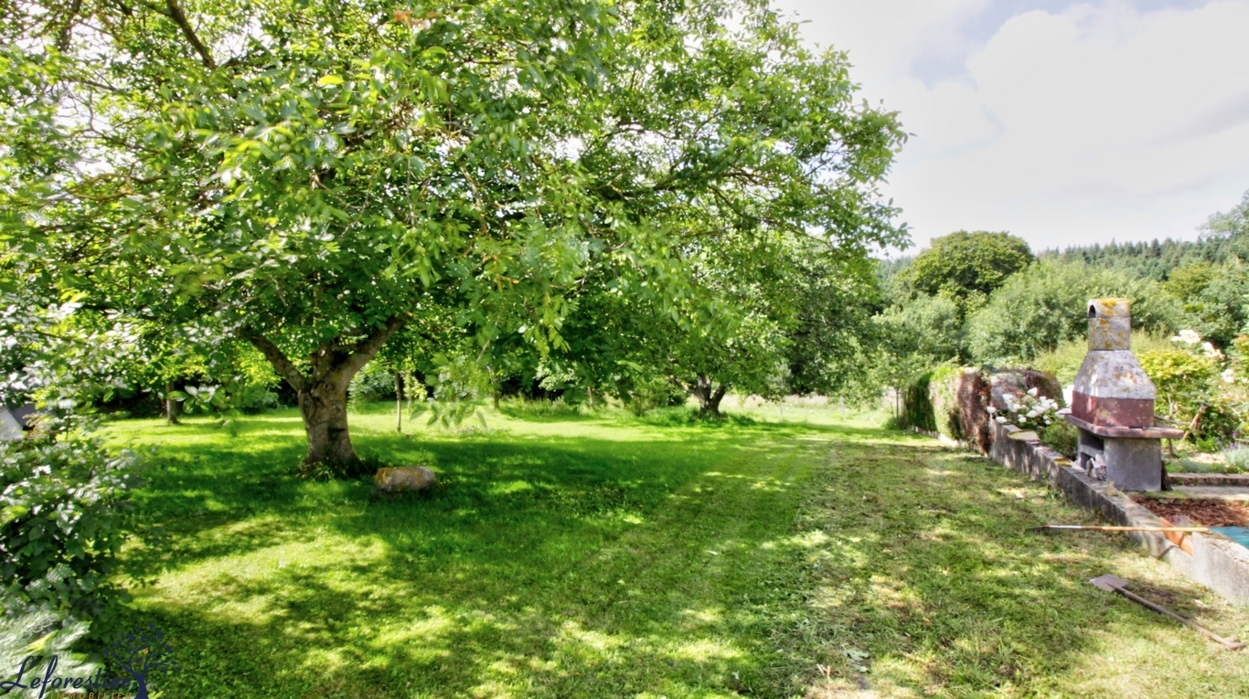 Le jardin descend en pente douce vers une petite route qui conduit à la forêt. De nombreux arbres y sont plantés dont des fruitiers variés. Sous la terrasse, une pièce sert de buanderie et pourrait être aménagée en cuisine d’été. Quelques marches descendent à la cave.