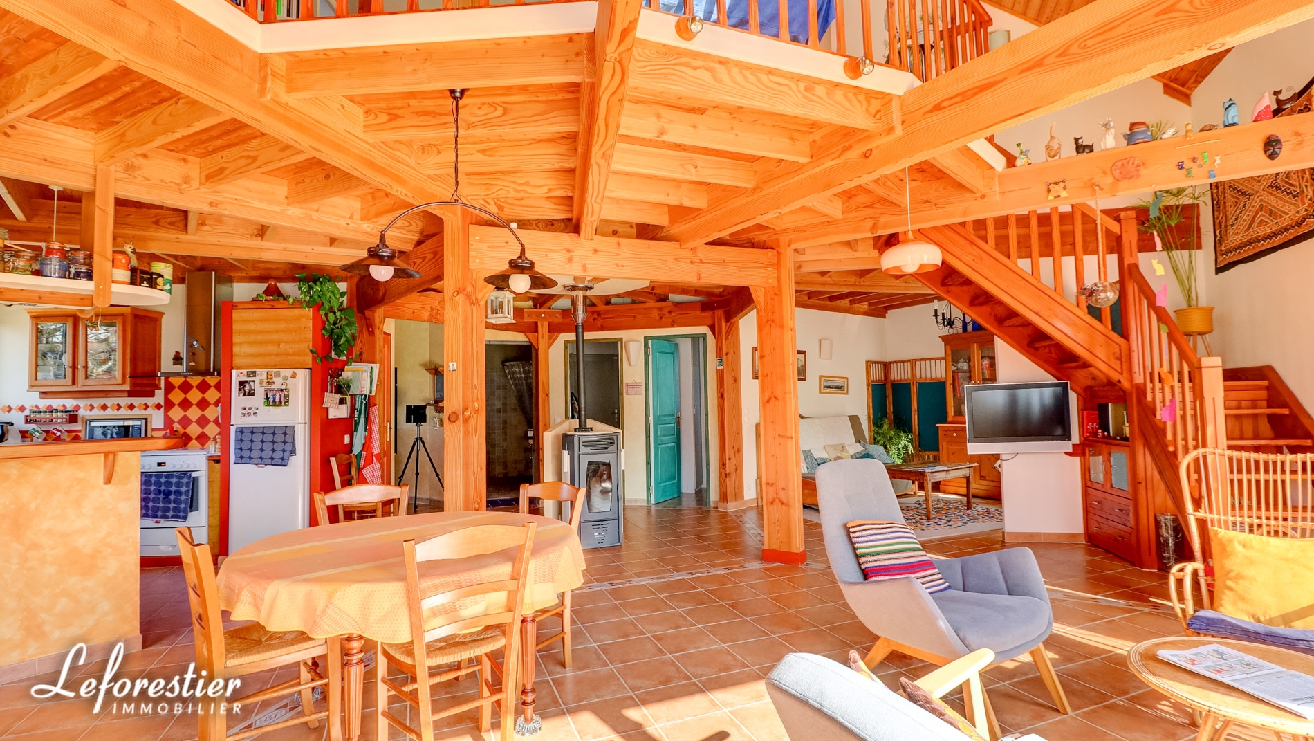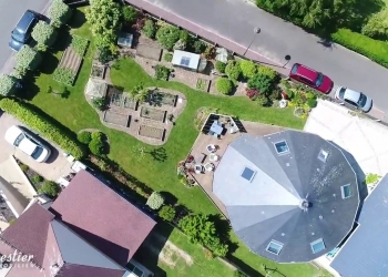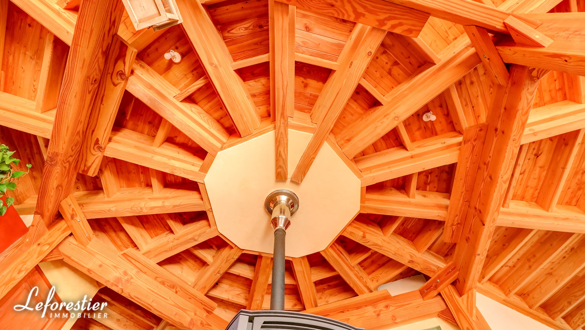De forme penta décagonale (15 cotés), cette maison de bois a été construite sur pilotis, avec des matériaux écologiques. Dans une démarche bioclimatique, Son orientation sud-ouest permet de profiter du soleil toute l’année. Le séjour fait la part belle à l’espace de vie du rez-de-chaussée. Ouvrant sur la terrasse également en bois, l’impression de volume est marquante. Les baies vitrées laissent la lumière envahir le rez-de-chaussée comme l’étage. La forme permet d’éviter la place perdue dans des couloirs ou des paliers. Les 130 mètres carrés sont optimisés. Au centre le poêle à pellets chauffe aisément et économiquement toute la maison, qui est fort bien isolée par ailleurs. Sous la terrasse, une citerne permet d’utiliser l’eau pour les cultures biologiques et pour un usage économique des usages domestiques.