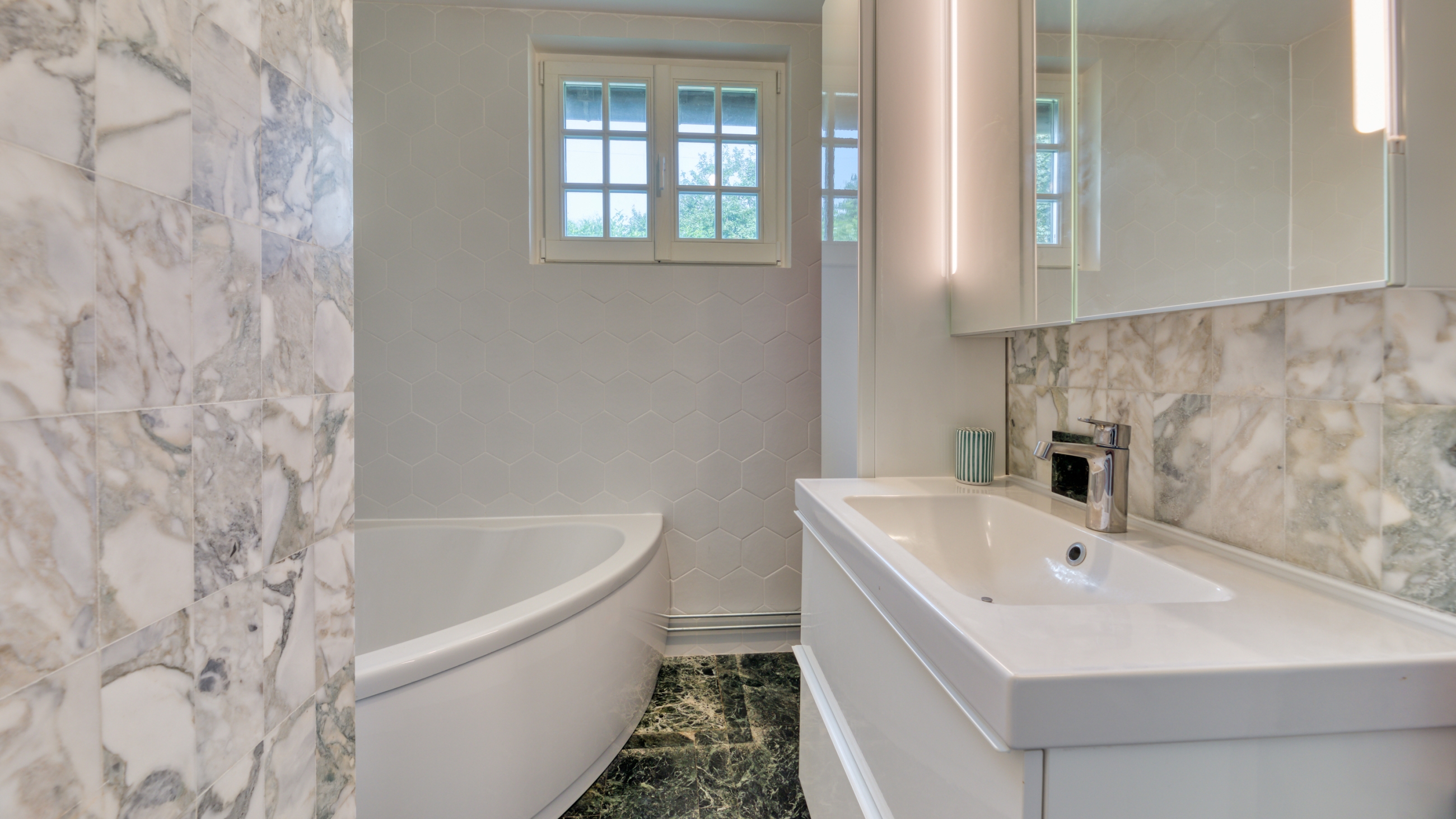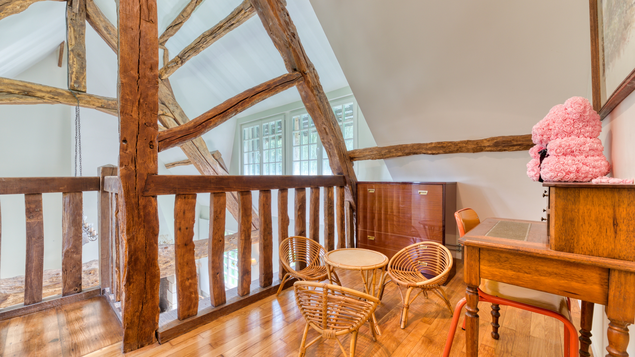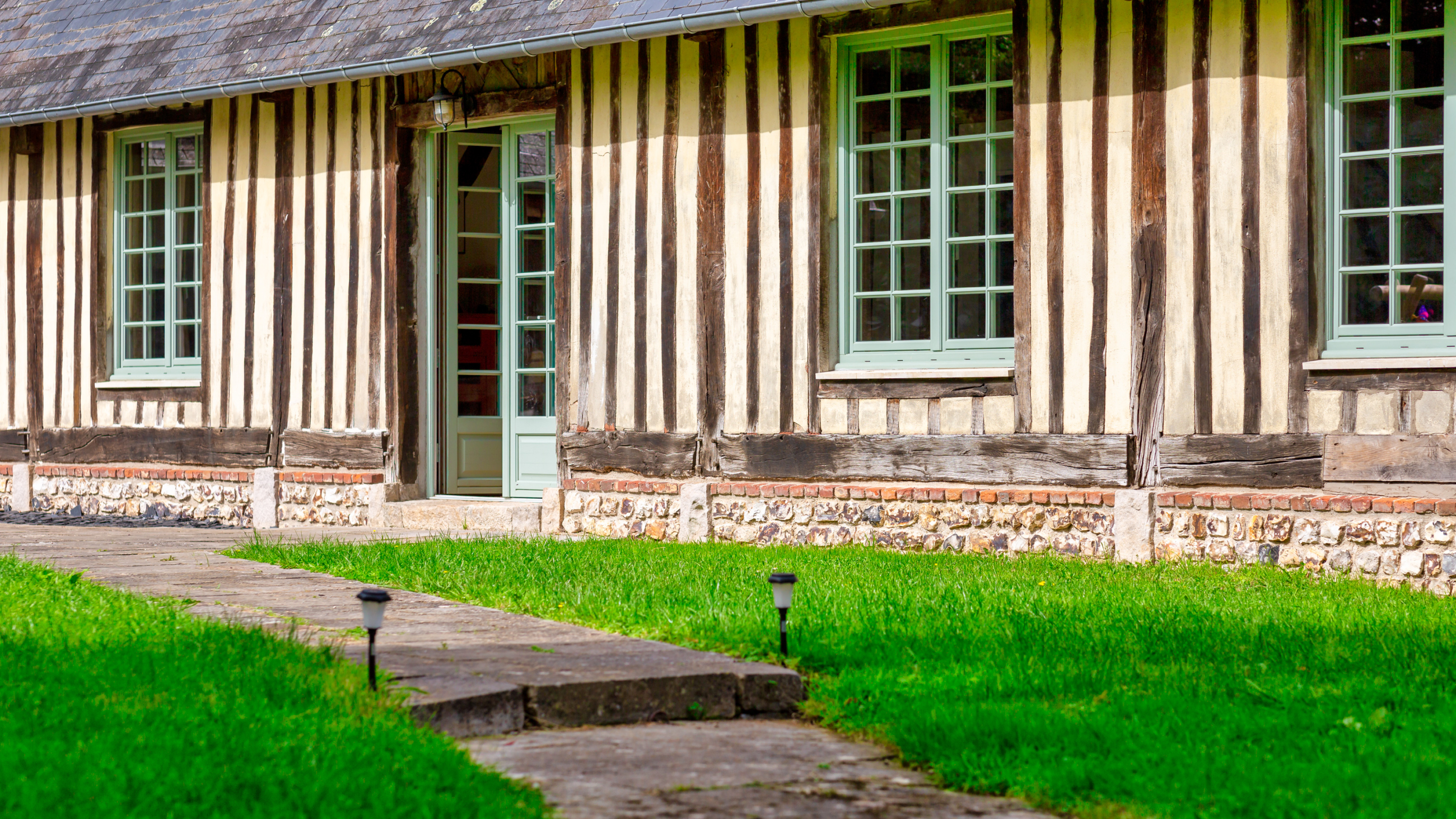 Cette maison Normande fut bâtie en 1969 avec des bases de bois anciens récupérés de granges venant d’ailleurs dans la région. Le propriétaire de l’époque, célèbre marbrier ayant notamment travaillé sur les marbres de la mairie de Dieppe, a installé quelques belles pierres sur la propriété. On en retrouve notamment dans la salle de bain du rez-de-chaussée.