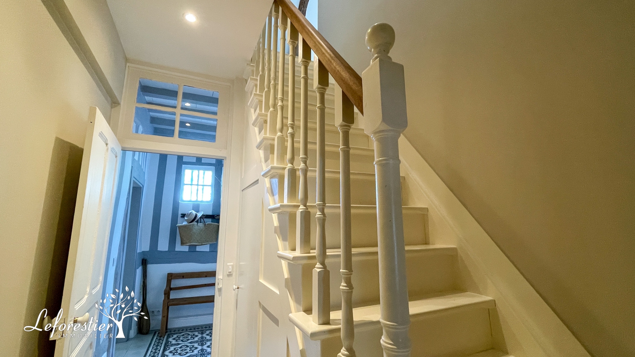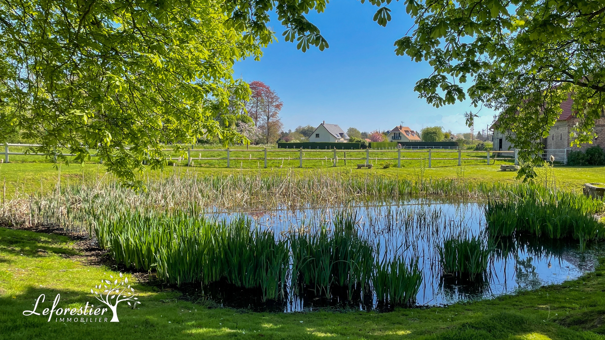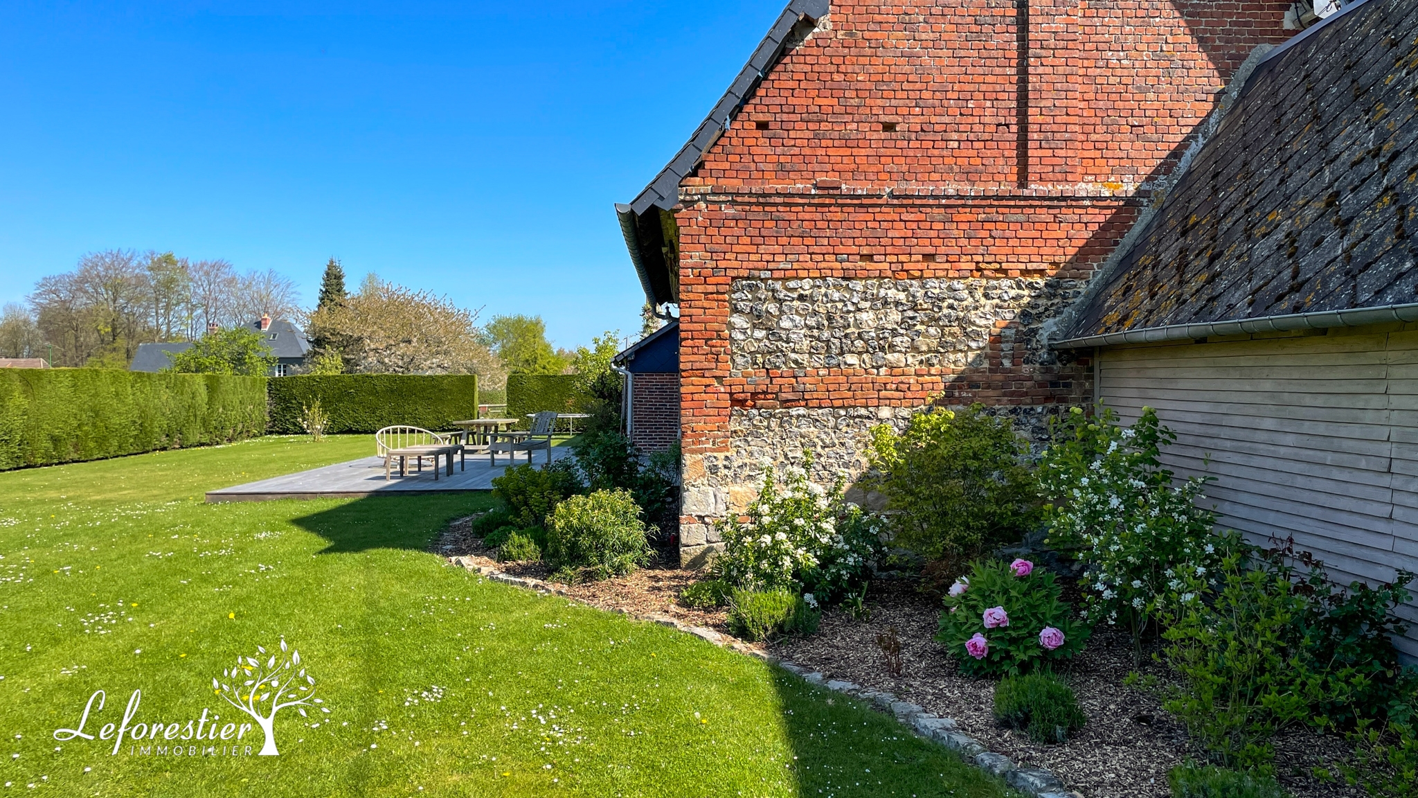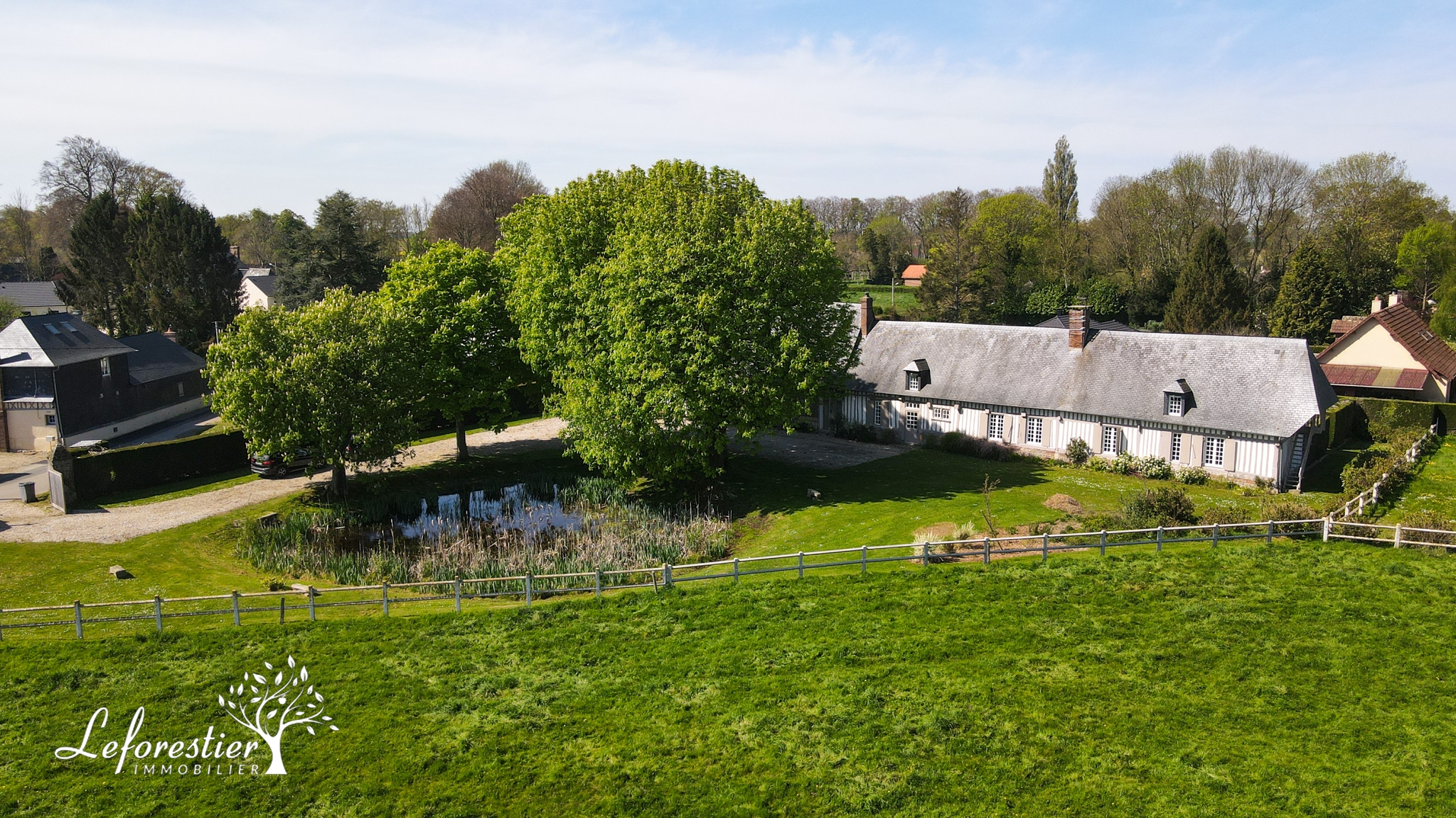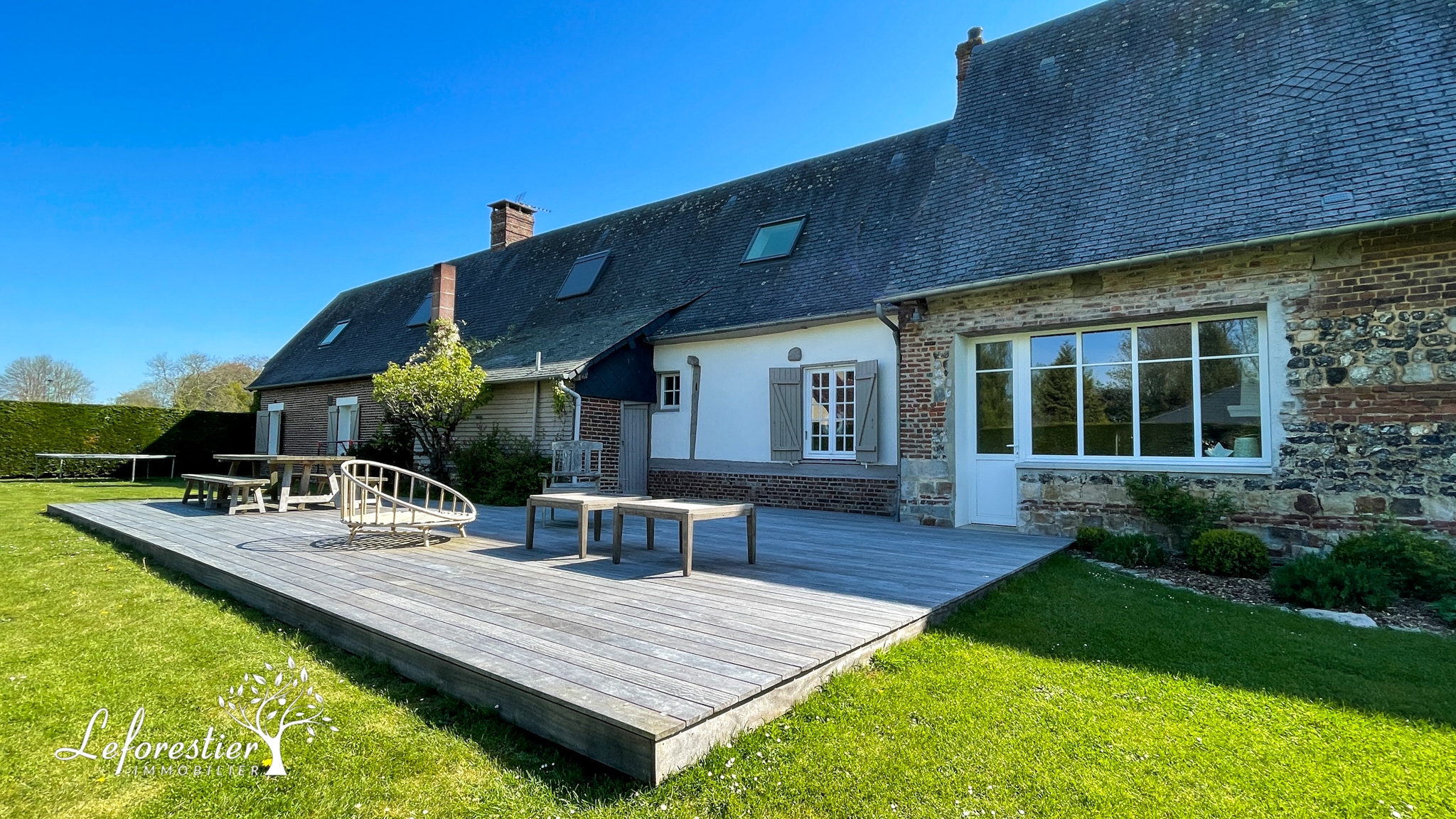 On passe le portail en bois massif de cette propriété et immédiatement les grands arbres, la marre et les vaches de la pâture voisine nous transportent dans un cadre des plus ravissants. La maison à colombages s’inscrit parfaitement dans ce décor typique de la Normandie. Du côté ouest de la maison on trouve un jardin plus intimiste, protégé par ses haies. La cuisine offre un accès direct sur la terrasse en bois.