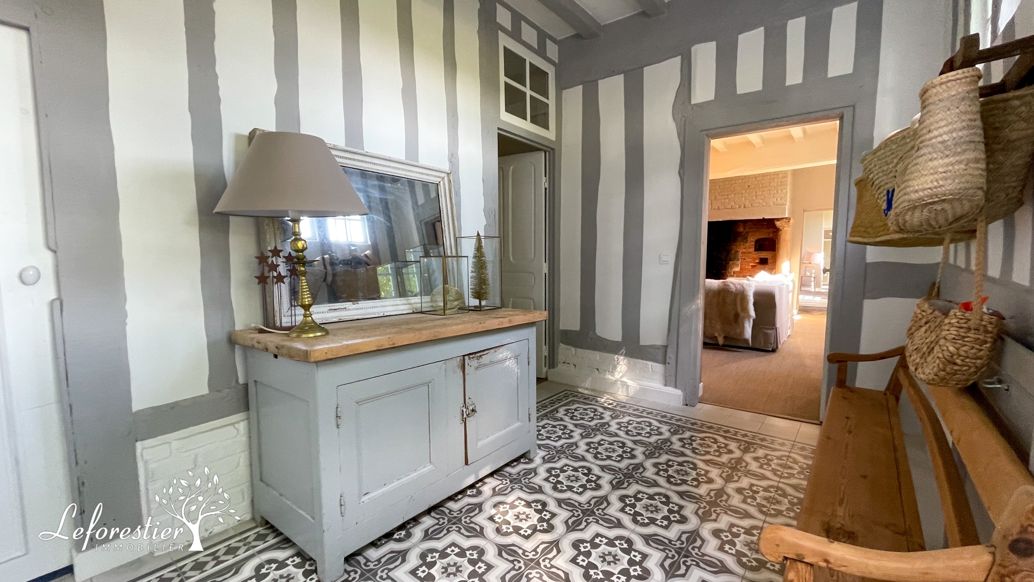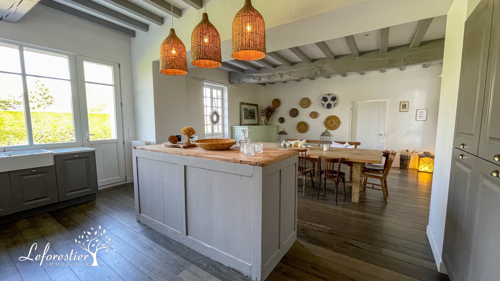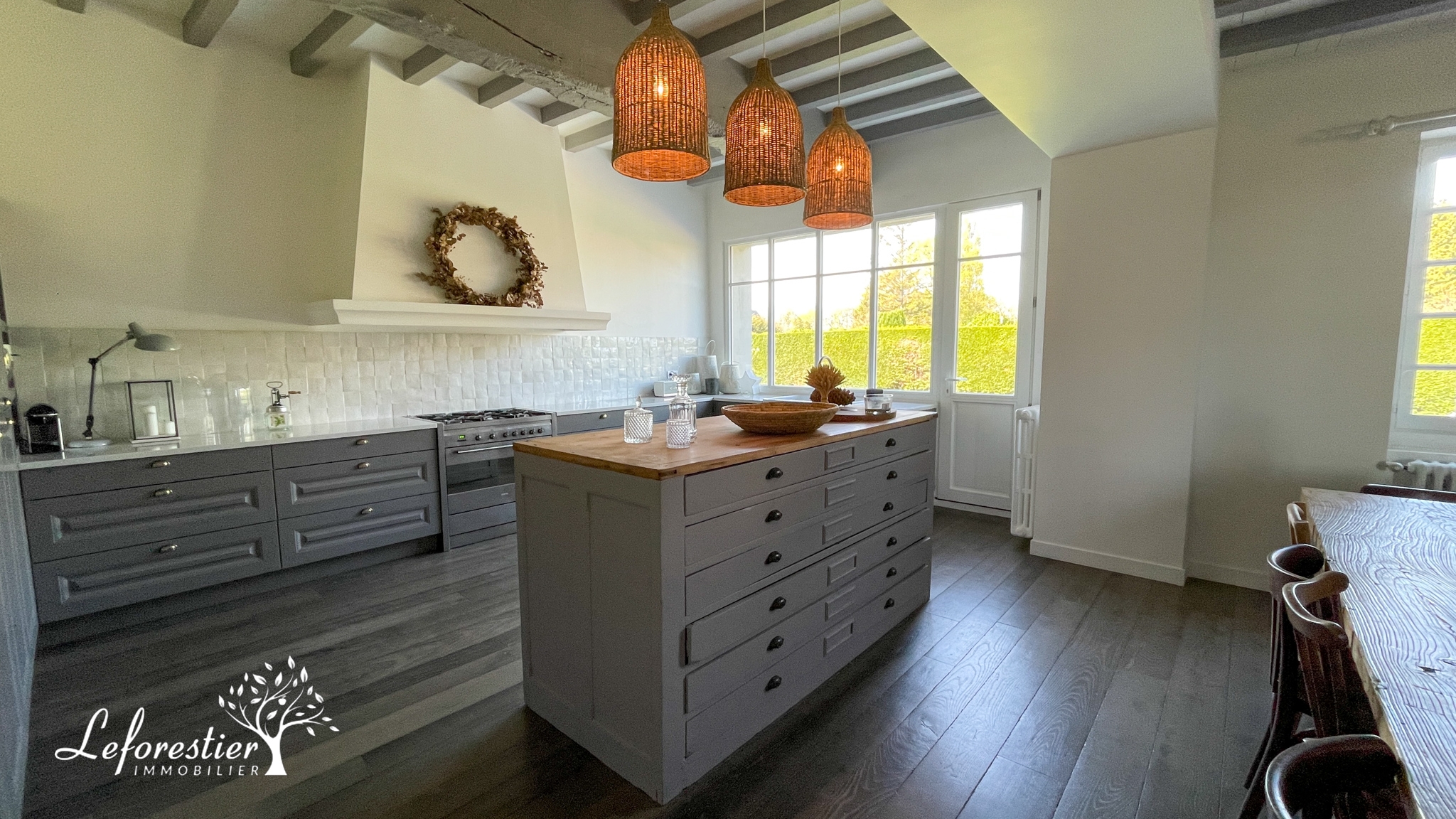 Dès l’entrée, la restauration réalisée conserve le style ancien de la maison avec des colombages apparents en excellent état. La grande cuisine ouverte est la pièce maitresse de cette demeure. La circulation autour du grand ilot central est parfaite. Les matériaux utilisés sont de qualité avec notamment une crédence en zellige et une grande ouverture donnant sur la terrasse.