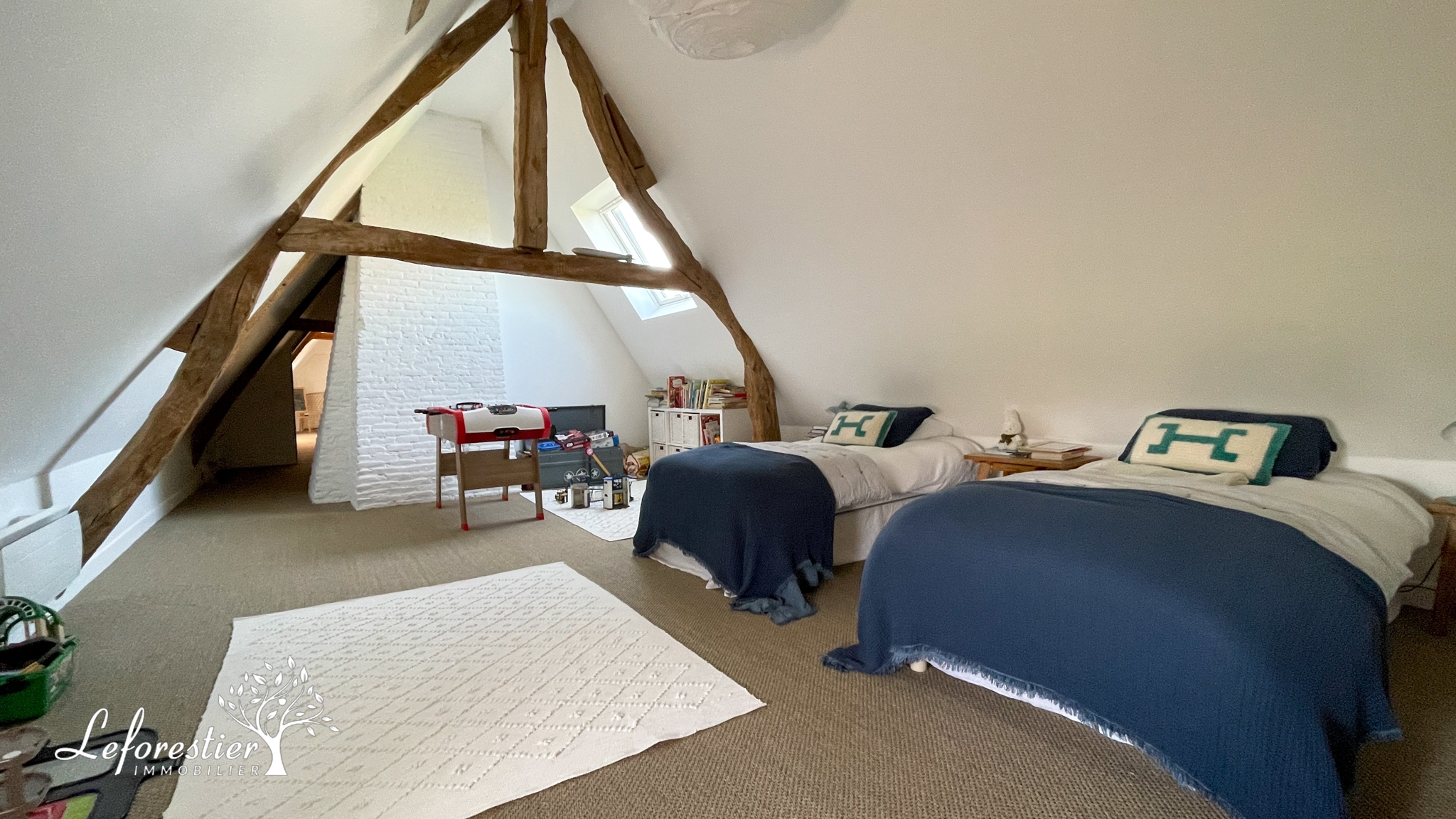 À l’étage, on trouve une chambre pour les invités, une grande chambre servant de dortoir pour les enfants et une salle de bain et douche. Il reste un grand potentiel d’aménagement avec des combles au-dessus de la cuisine.