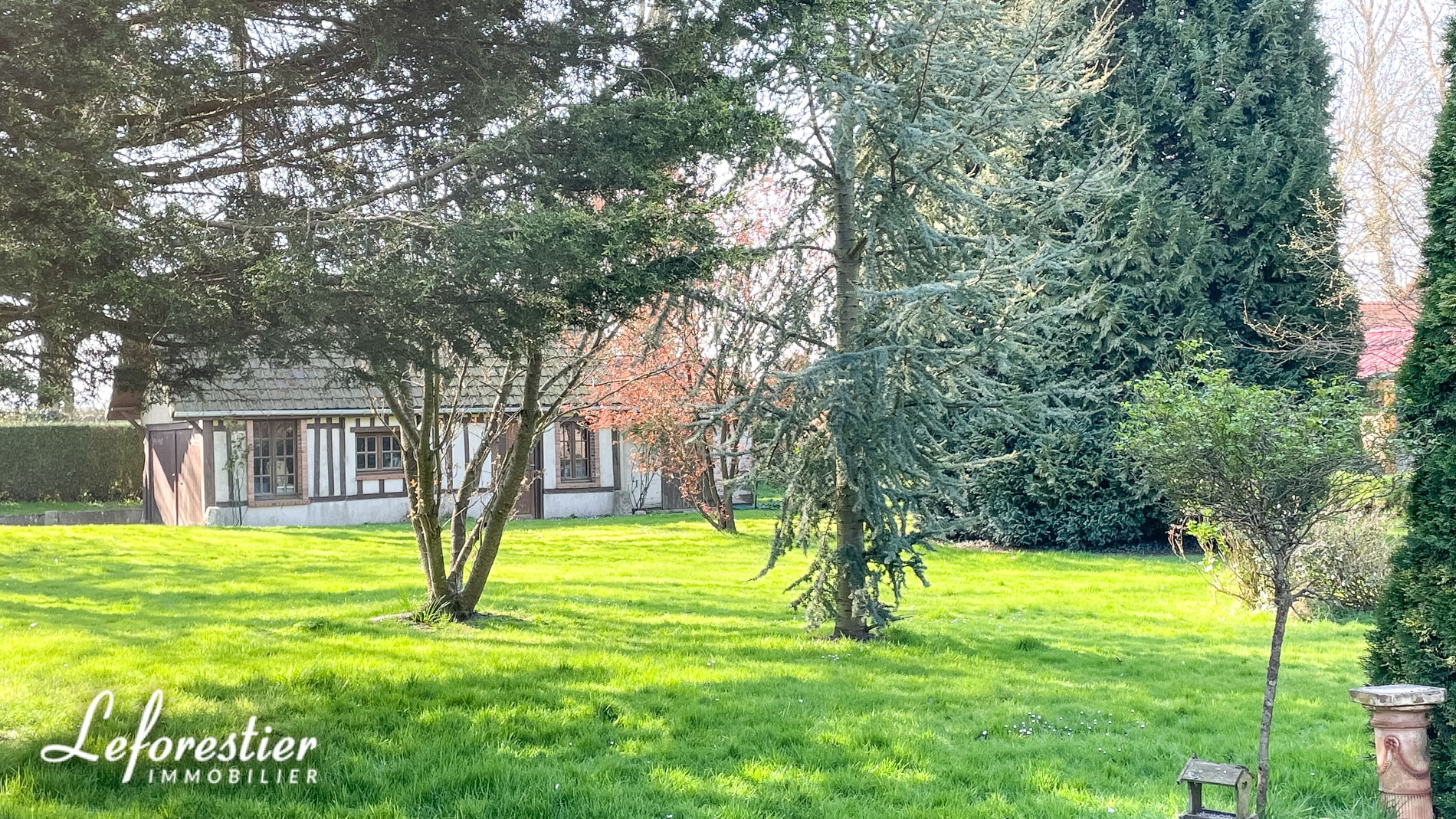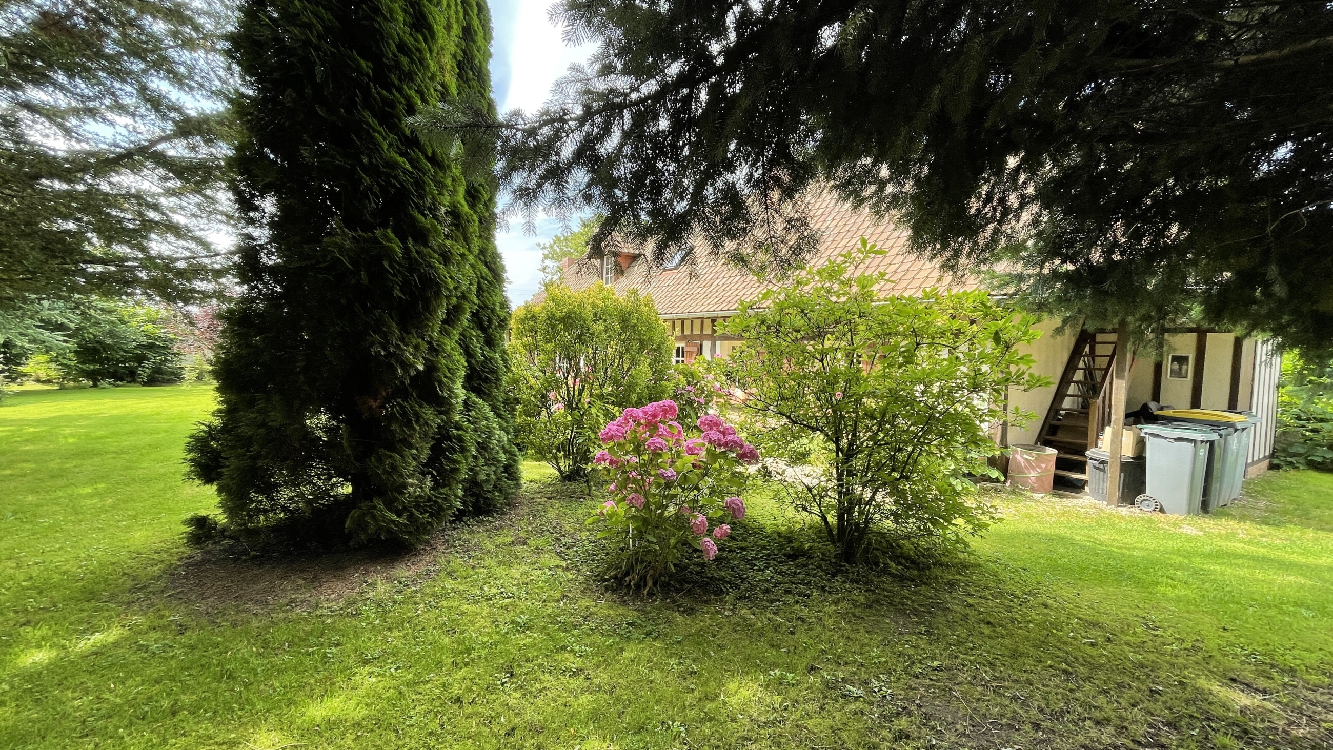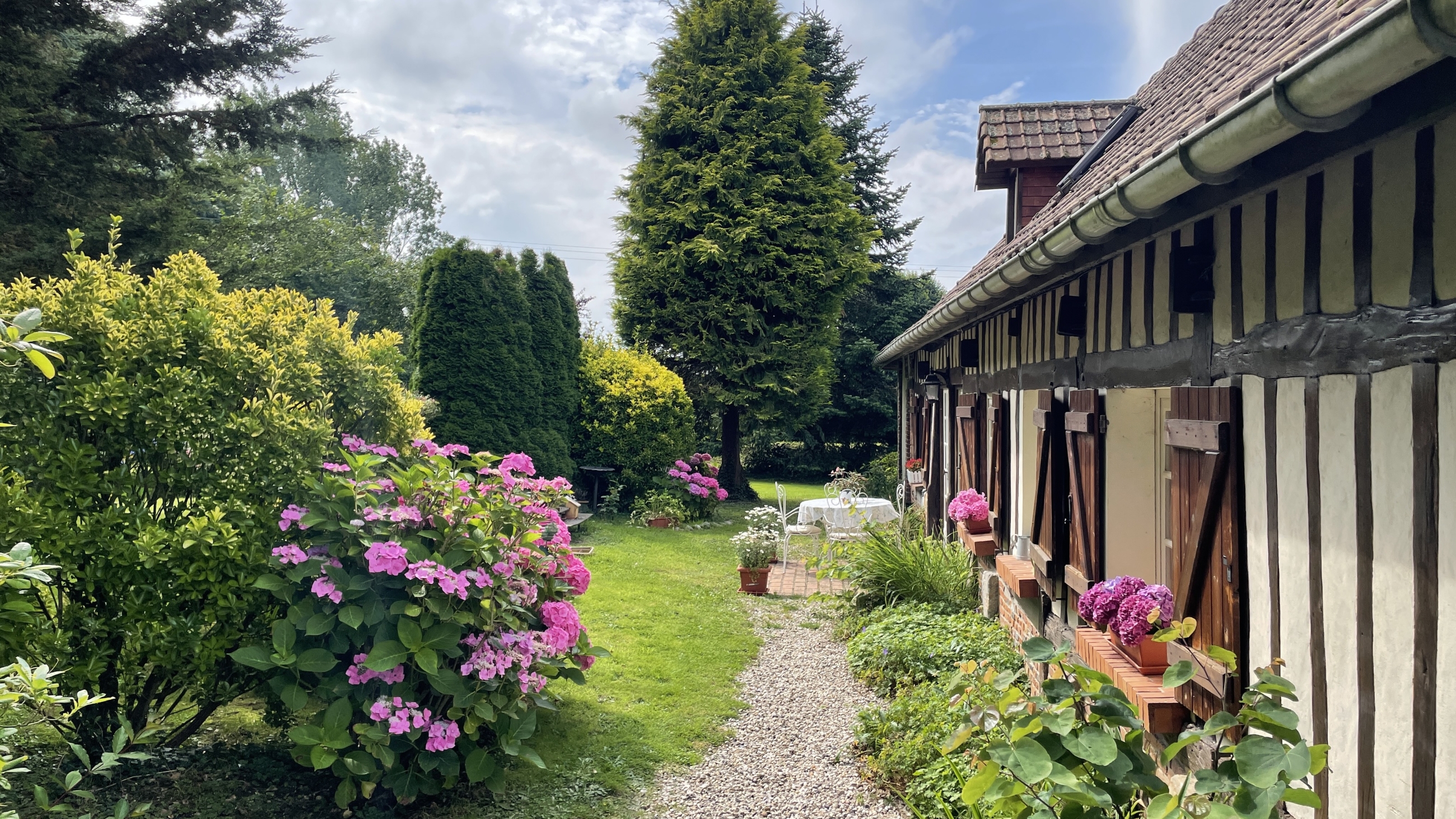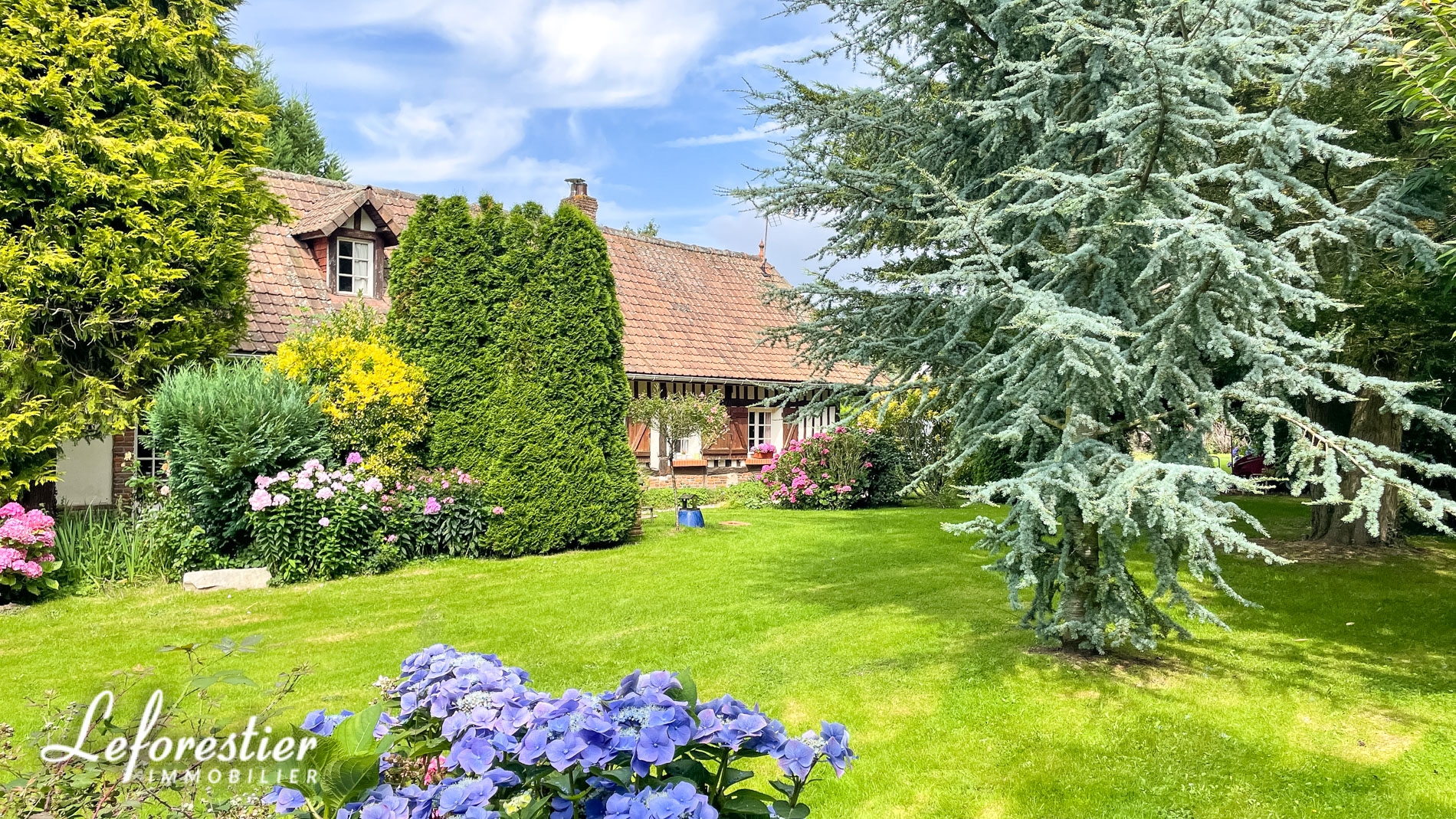 On passe le joli portail de cette propriété et tout de suite on peut apprécier la végétation luxuriante. On découvre au bout d’une allée une charme maison Normande ornée de fleurs. Autour, un parc de presque 6000 m2 offre un cadre idyllique.