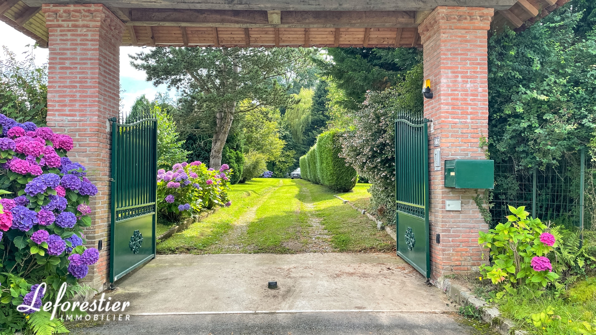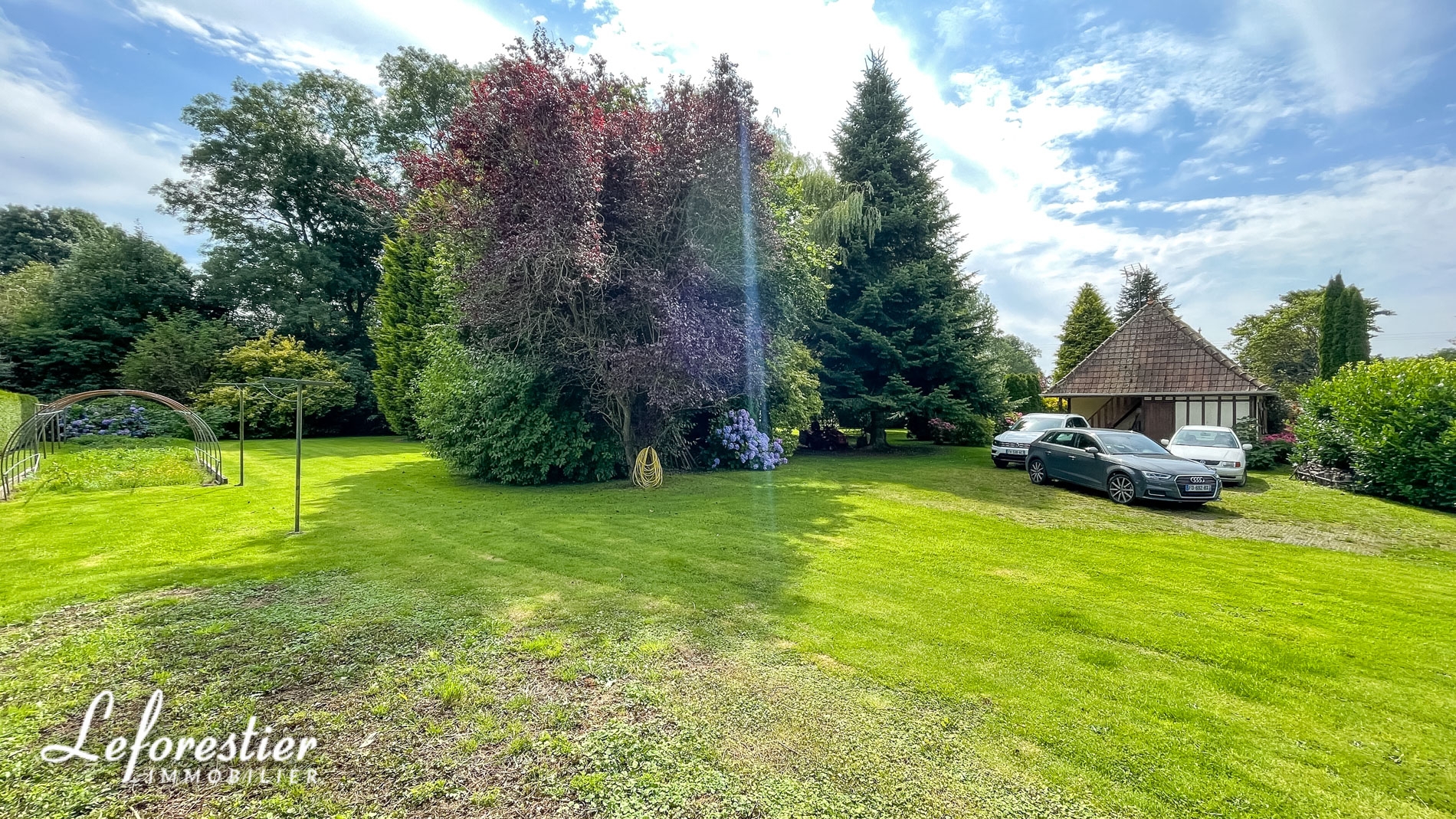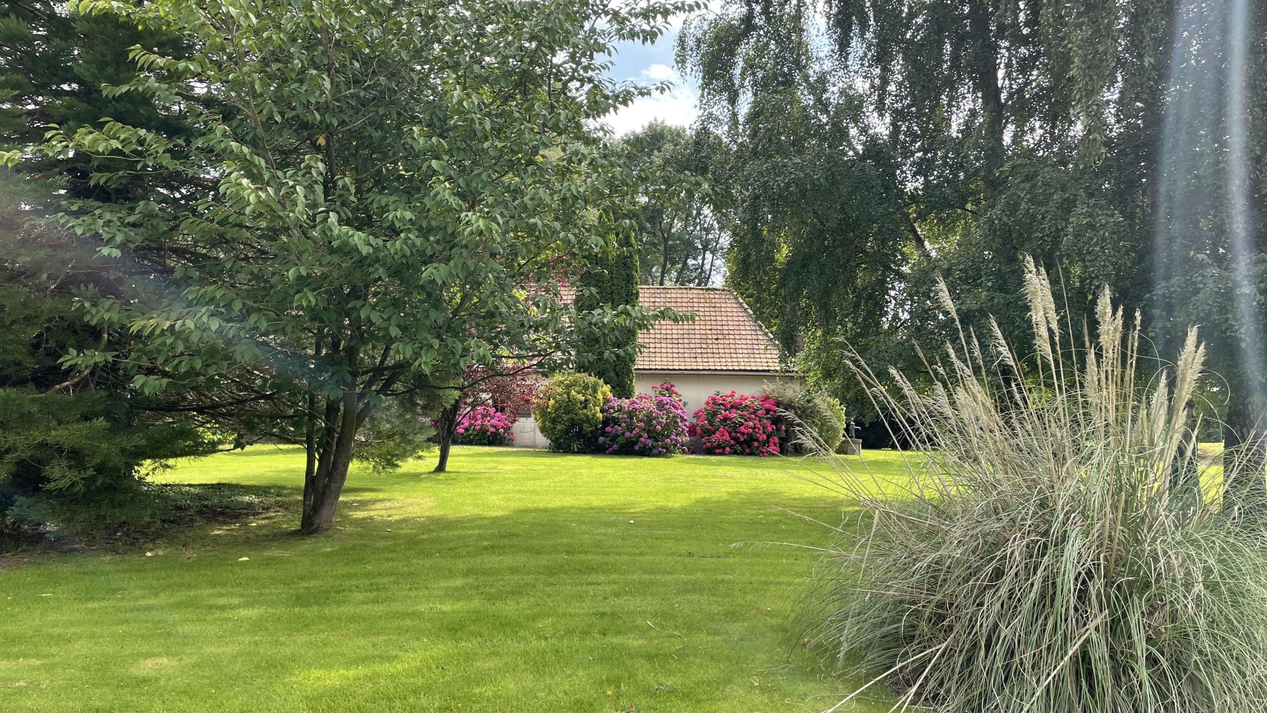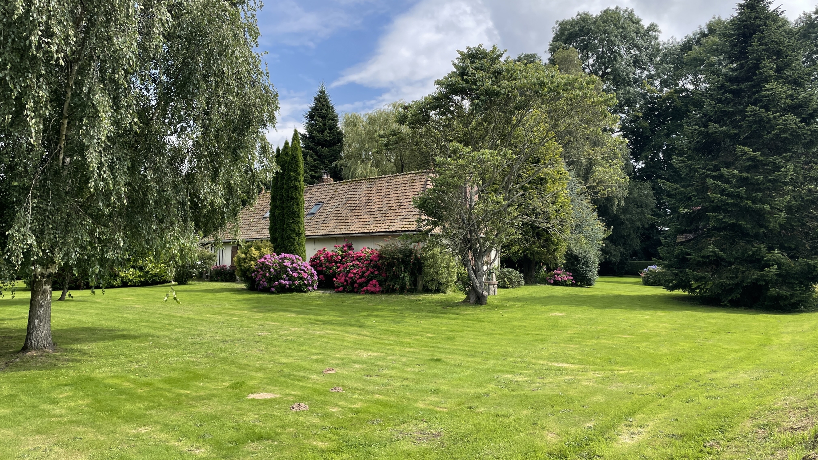 On passe le joli portail de cette propriété et tout de suite on peut apprécier la végétation luxuriante. On découvre au bout d’une allée une charme maison Normande ornée de fleurs. Autour, un parc de presque 6000 m2 offre un cadre idyllique.