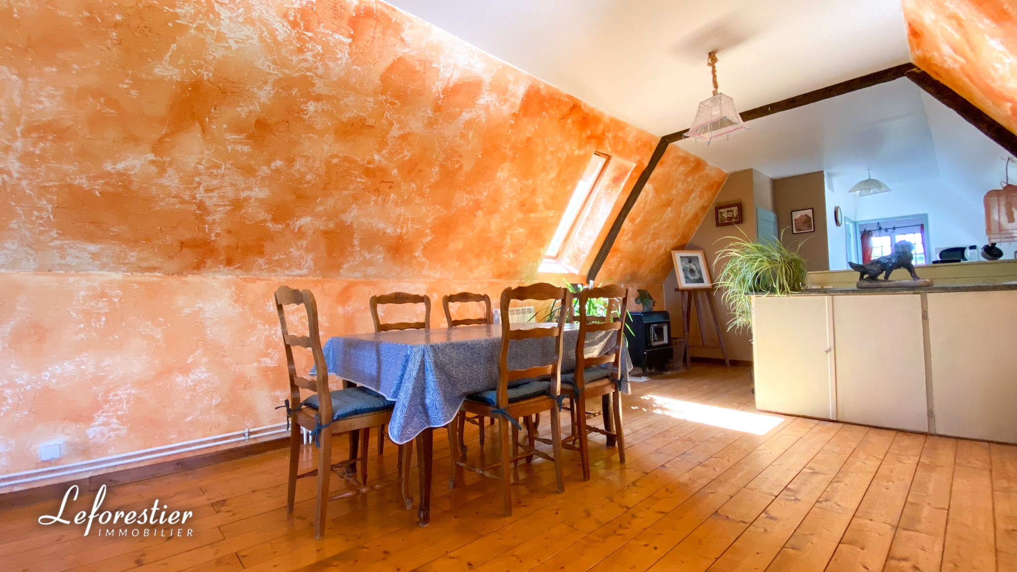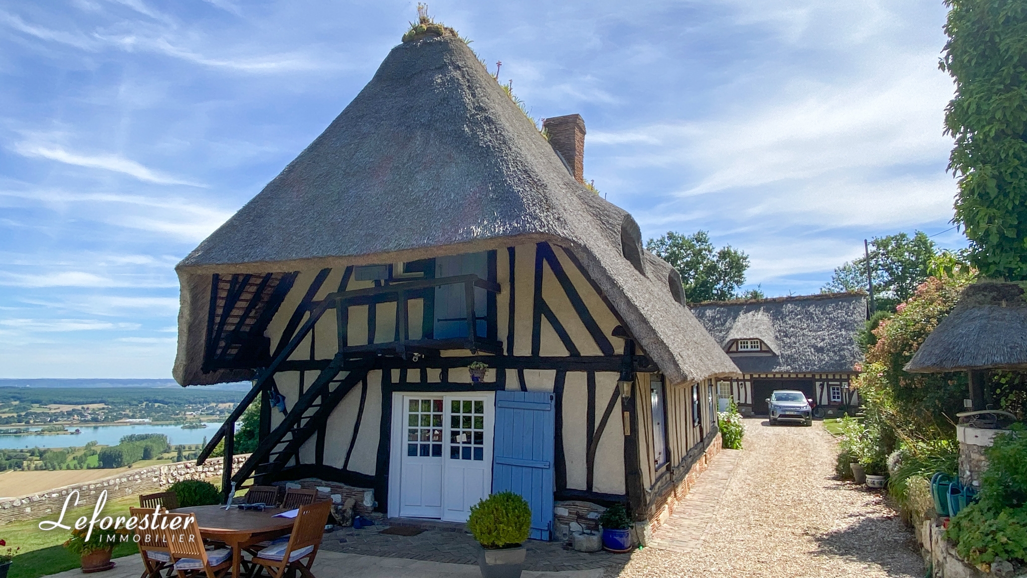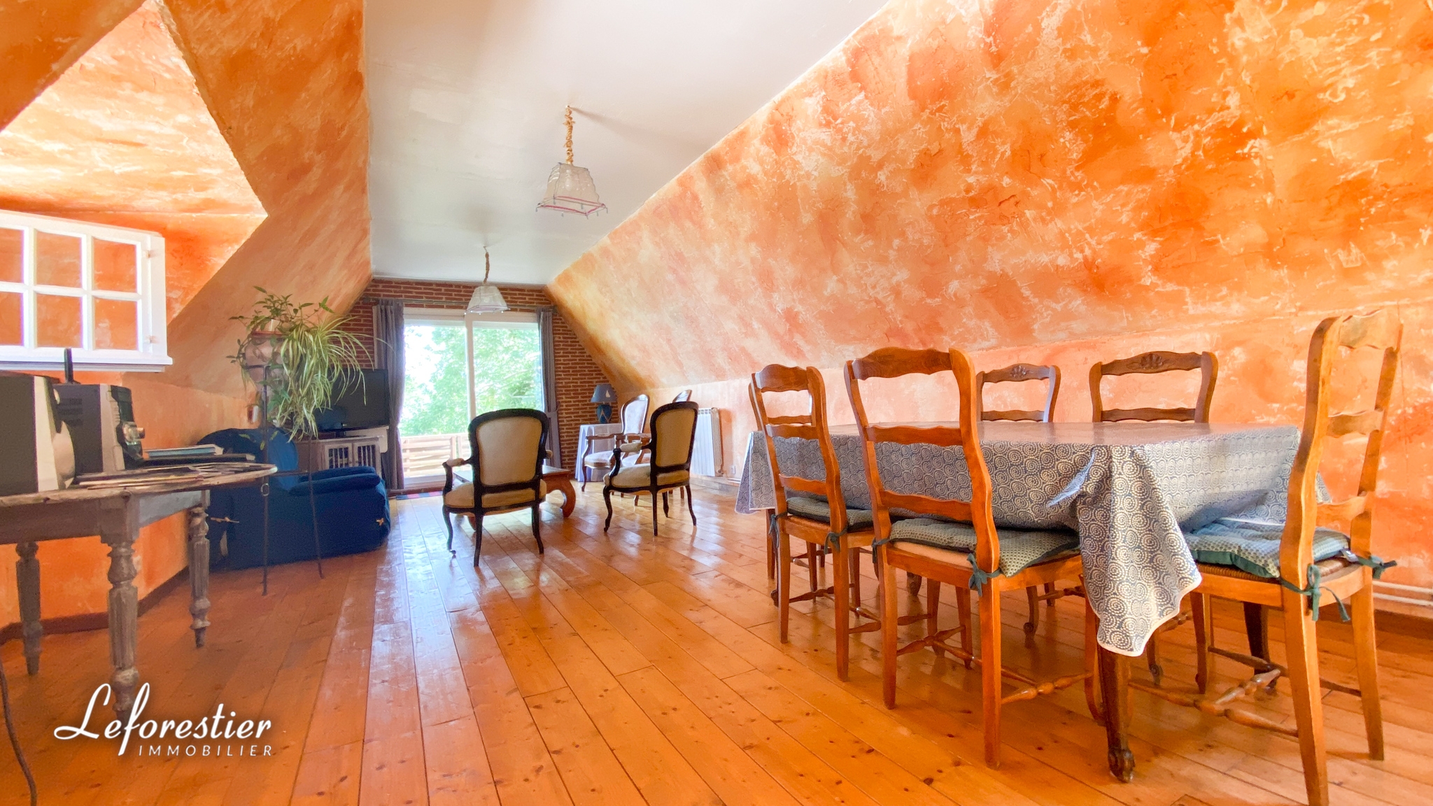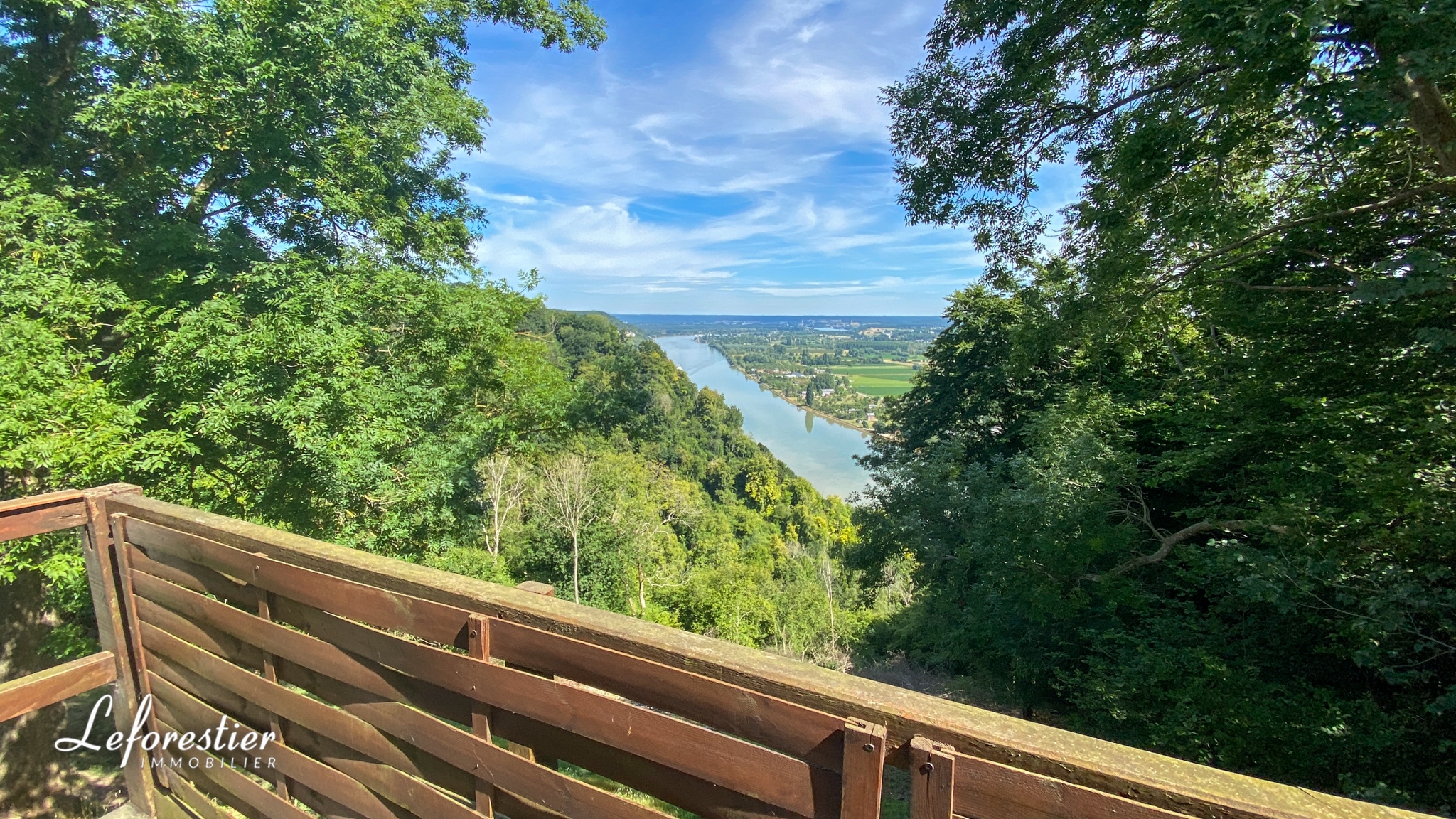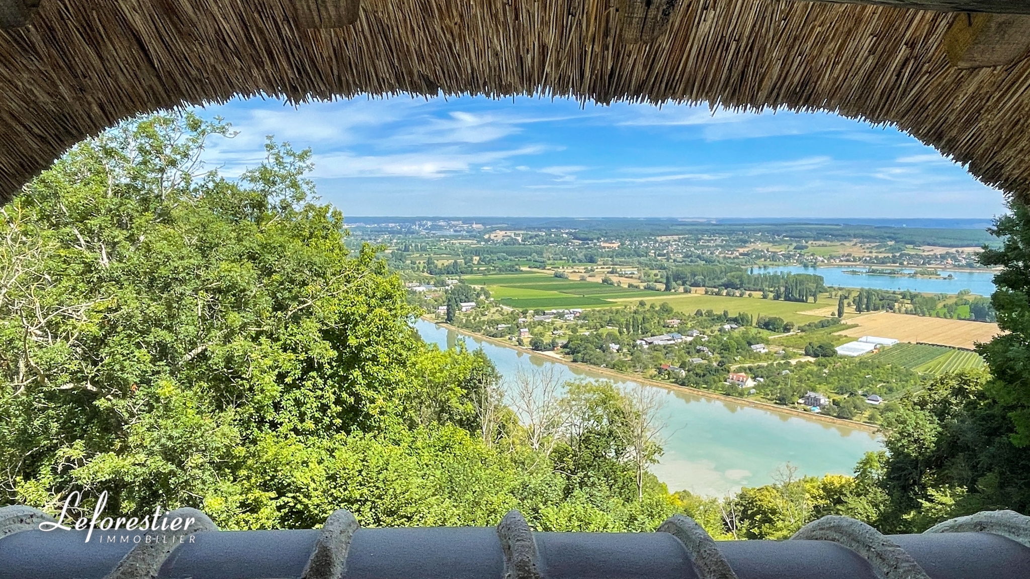 A l’étage, se trouvent une chambre, une salle de bain, une cuisine et un grand salon séjour avec balcon offrant une vue superbe sur les boucles de la seine. Idéal pour recevoir des convives ou faire une activité de gîte.