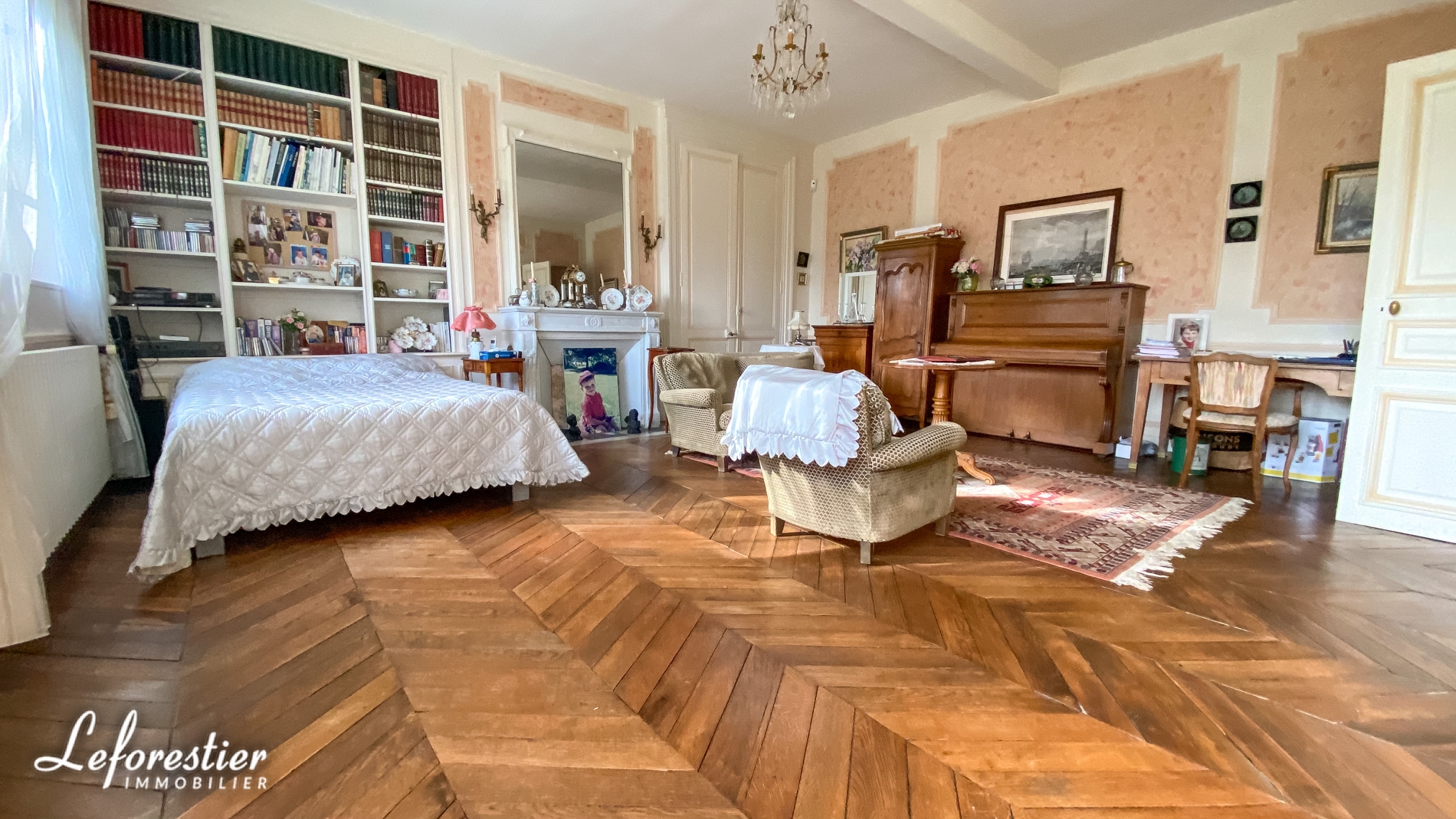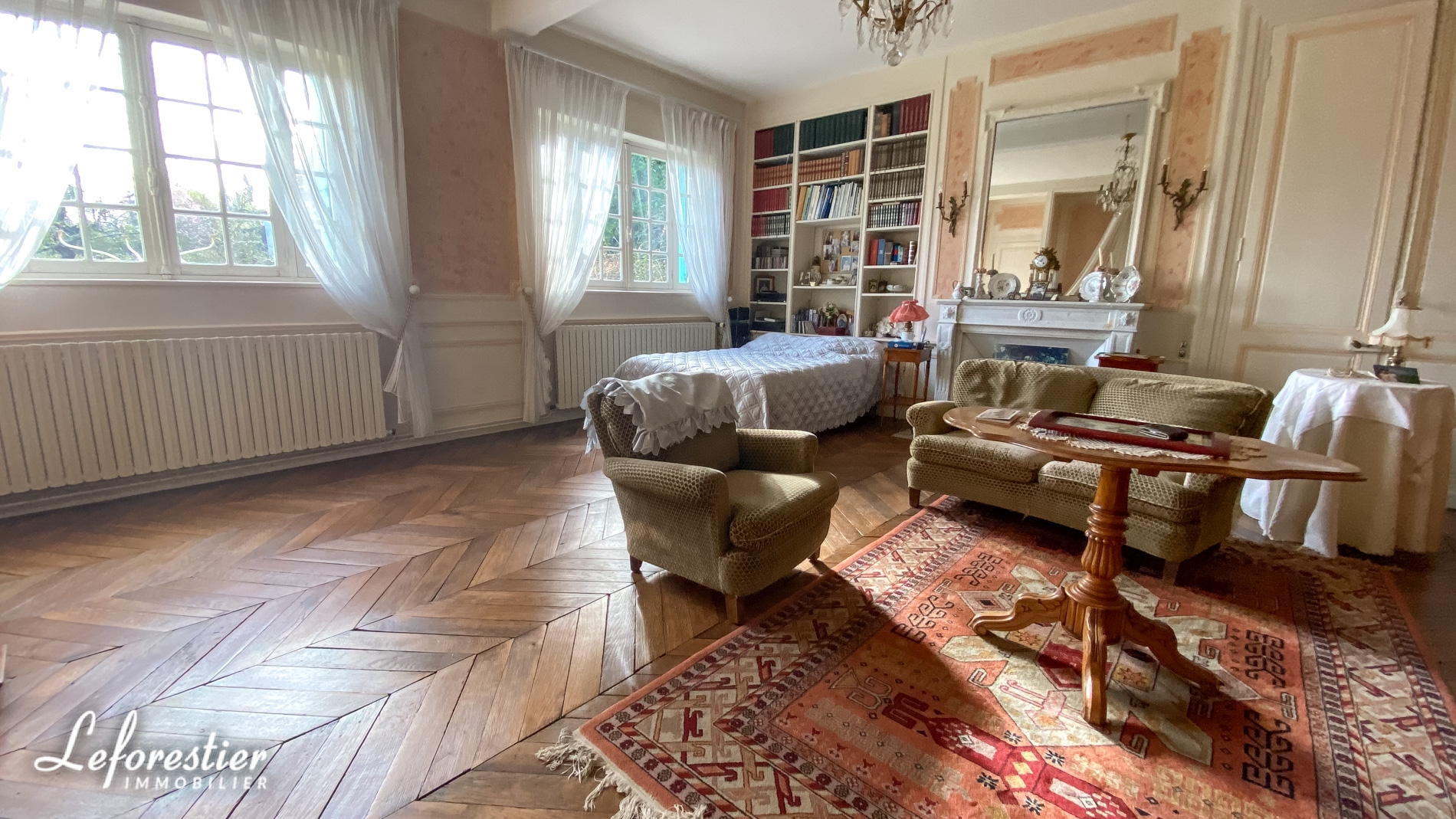 Dans le grand salon, vous trouverez un joli parquet en point de Hongrie et un insert d’époque donnant beaucoup de charme et de caractère à cette pièce et plus généralement à la maison.