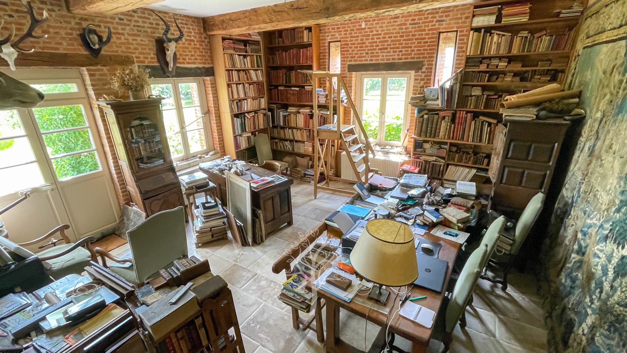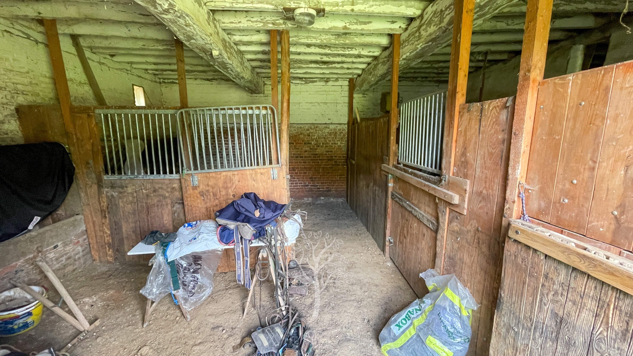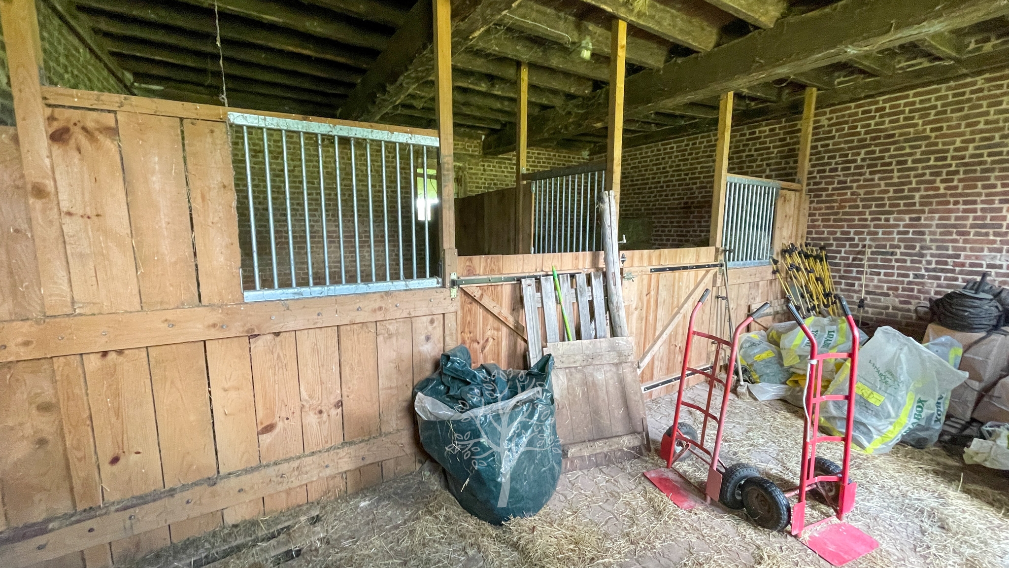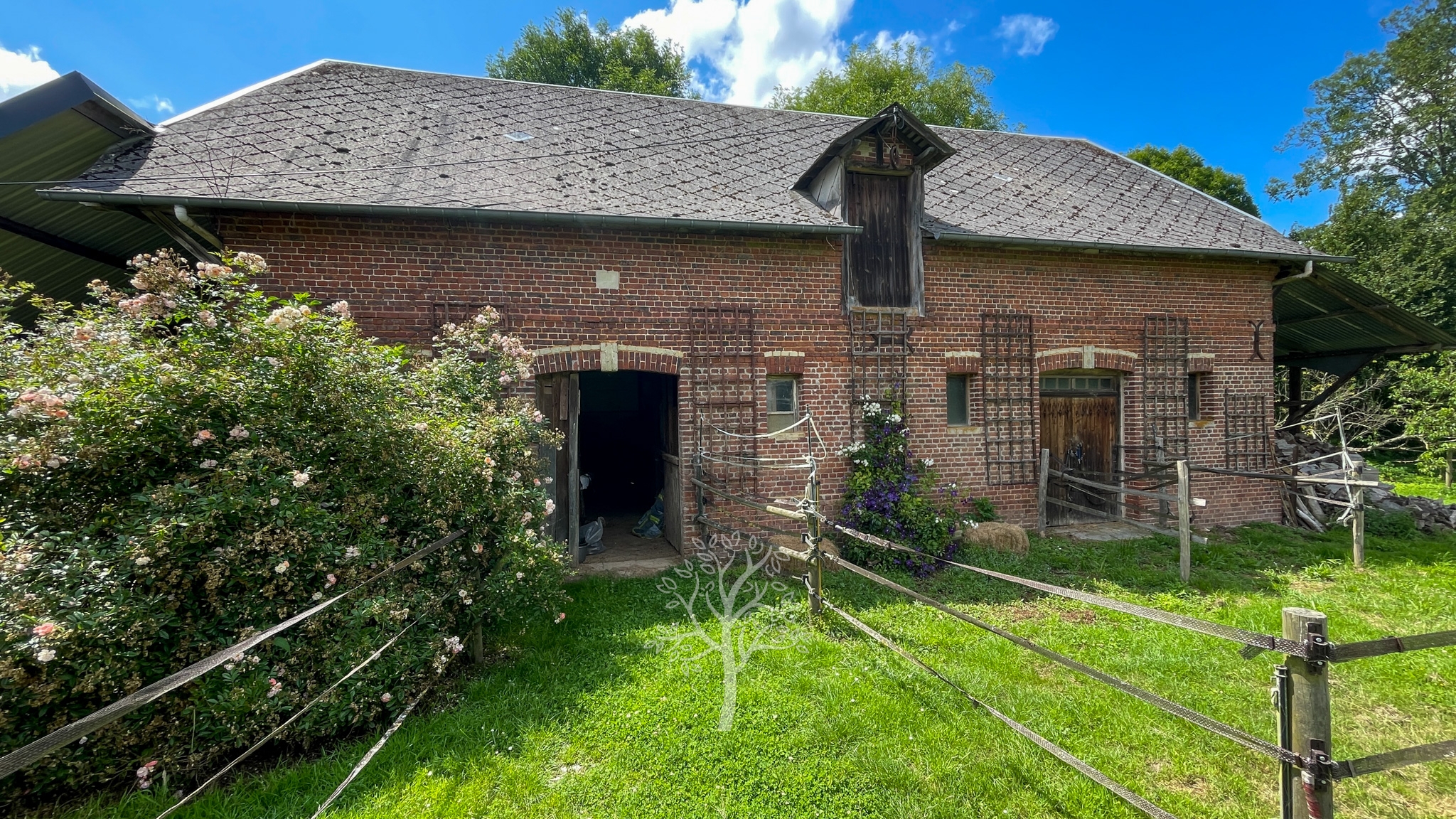 Au-delà des 4000 mètres carrés du jardin, les presque 4 ha de prairies sont parfaitement clôturés pour accueillir de nombreux chevaux. Les écuries anciennes sont fonctionnelles et divisées en une sellerie et quatre box. L’activité équestre peut être aisément poursuivie. Une ancienne étable en brique de Saint Jean a été rejointoyée en attendant de lui trouver une reconversion : gite, maison d’amis, atelier d’artiste, salle de réception…