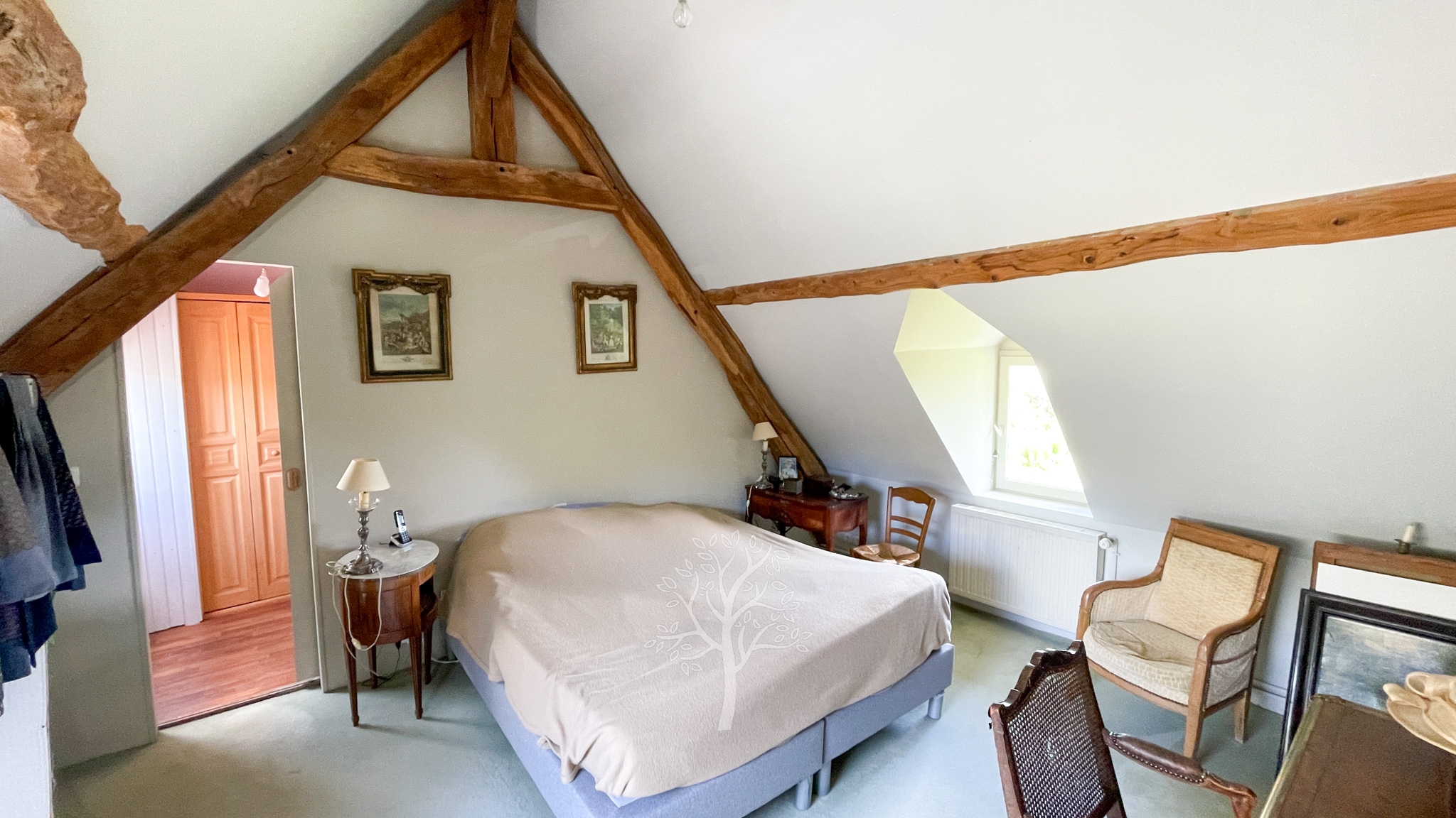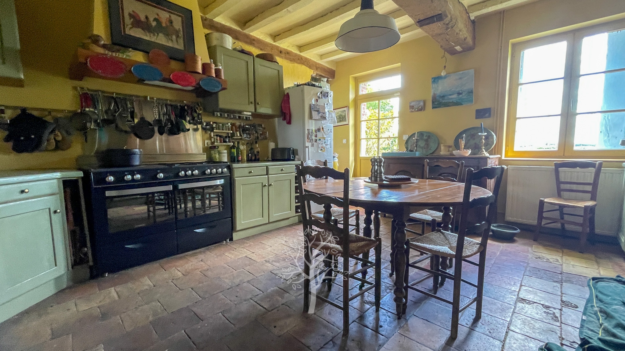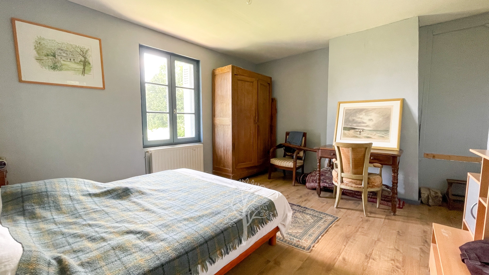 Sur les fondations d’une demeure de l’époque Henri IV, cette demeure a conservé son sous-sol, la poutraison intérieure et la cheminée en Pierre de Caumont de l’époque. Le perron orienté plein sud s’ouvre sur la pièce principale dans laquelle crépite un feu à l’âtre. Les invités apprécient cette ambiance chaleureuse et accueillante de la pièce principale. Un immense bureau avec une cheminée bourgeoise est le domaine actuel et réservé du propriétaire. Une reconversion en chambre de plain-pied peut s’envisager. La cuisine avec sa partie repas correspond aux traditions et aux usages des pièces où la famille et le personnel de ferme se réunissaient. A notre époque, le brunch du dimanche matin se partage dans ce type de cuisine. A l’étage, un couloir distribue trois chambres et deux salles de bain. L’entrée de service et la chaufferie complètent le caractère fonctionnel de cette ancienne maison de ferme.