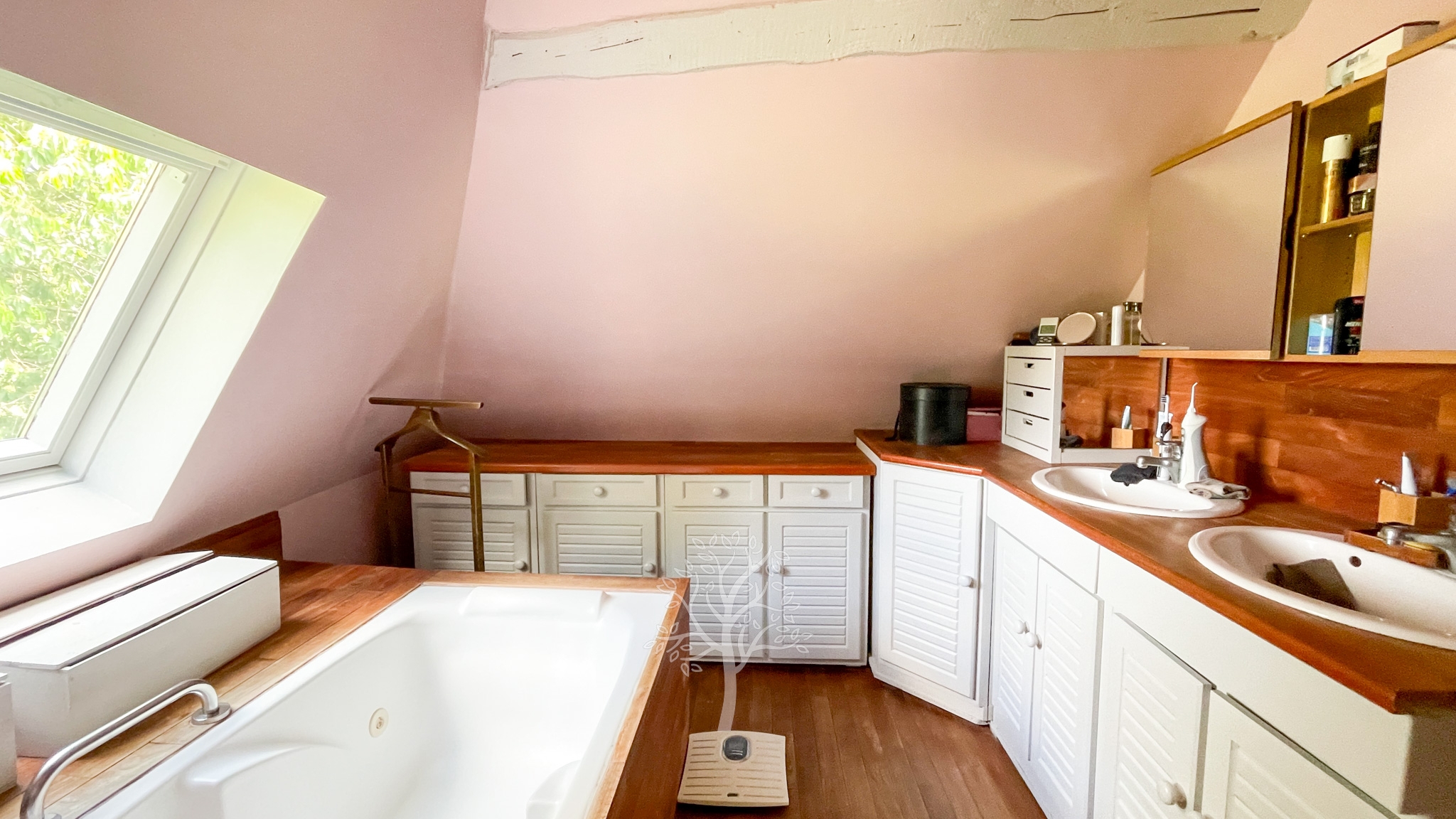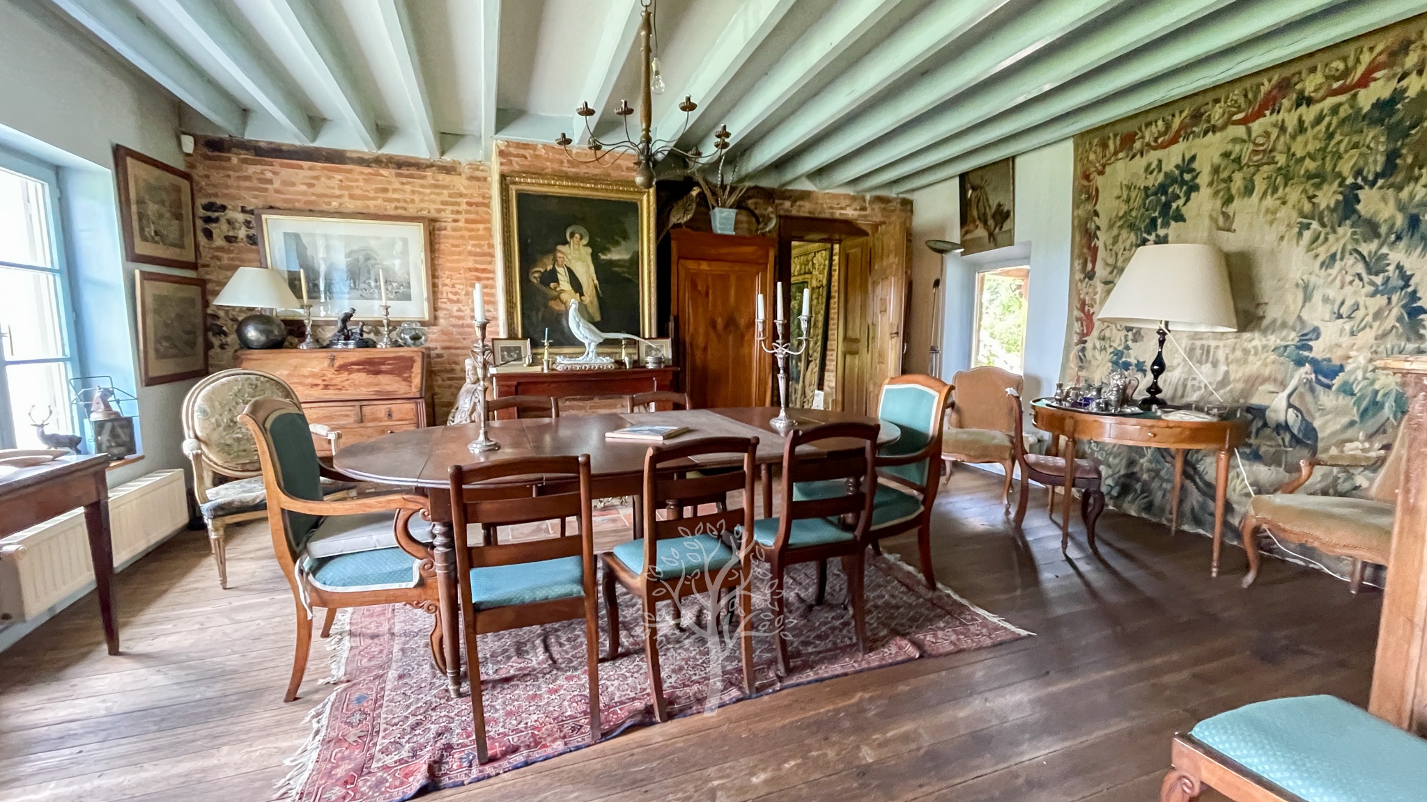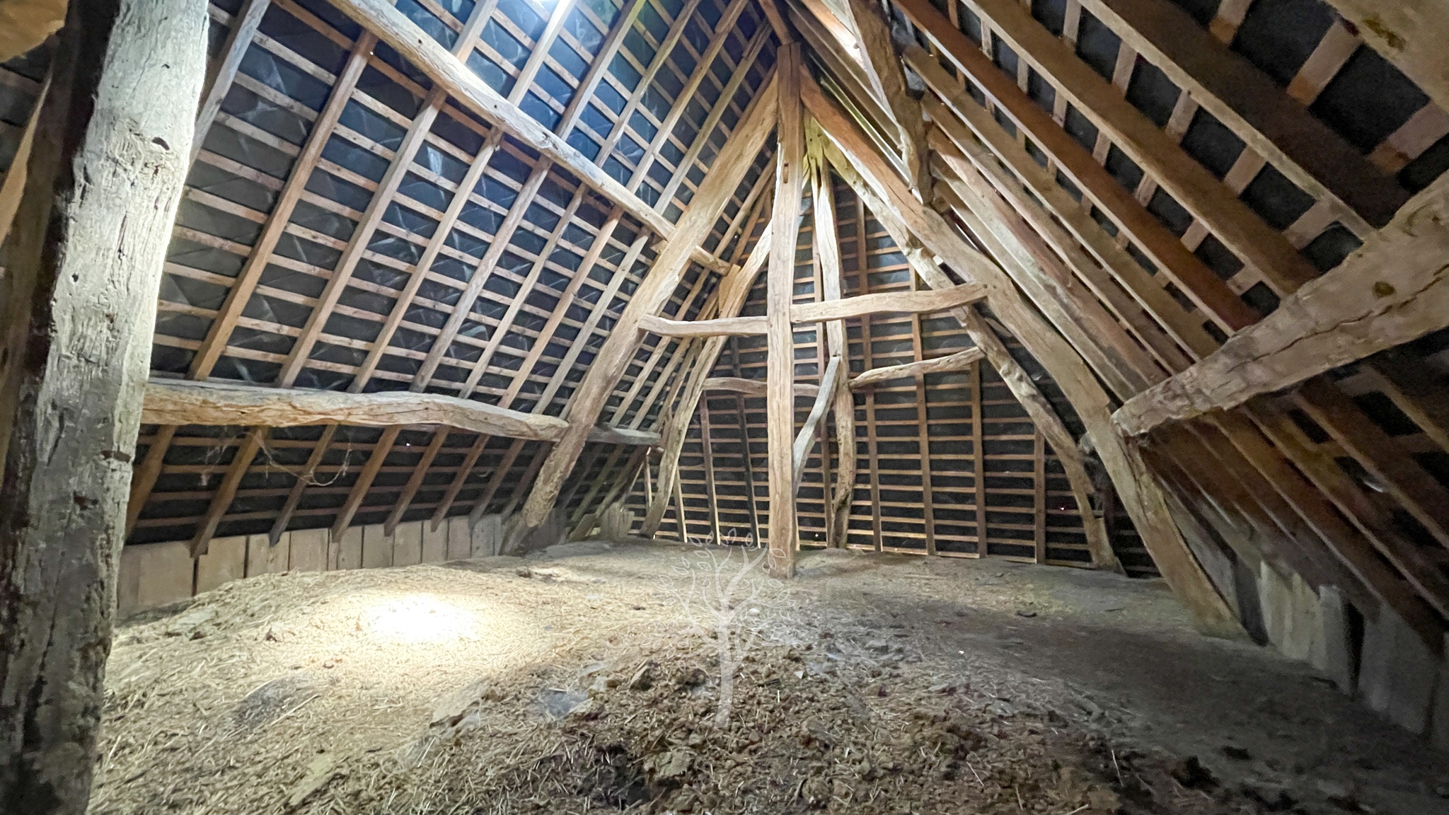 Sur les fondations d’une demeure de l’époque Henri IV, cette demeure a conservé son sous-sol, la poutraison intérieure et la cheminée en Pierre de Caumont de l’époque. Le perron orienté plein sud s’ouvre sur la pièce principale dans laquelle crépite un feu à l’âtre. Les invités apprécient cette ambiance chaleureuse et accueillante de la pièce principale. Un immense bureau avec une cheminée bourgeoise est le domaine actuel et réservé du propriétaire. Une reconversion en chambre de plain-pied peut s’envisager. La cuisine avec sa partie repas correspond aux traditions et aux usages des pièces où la famille et le personnel de ferme se réunissaient. A notre époque, le brunch du dimanche matin se partage dans ce type de cuisine. A l’étage, un couloir distribue trois chambres et deux salles de bain. L’entrée de service et la chaufferie complètent le caractère fonctionnel de cette ancienne maison de ferme.