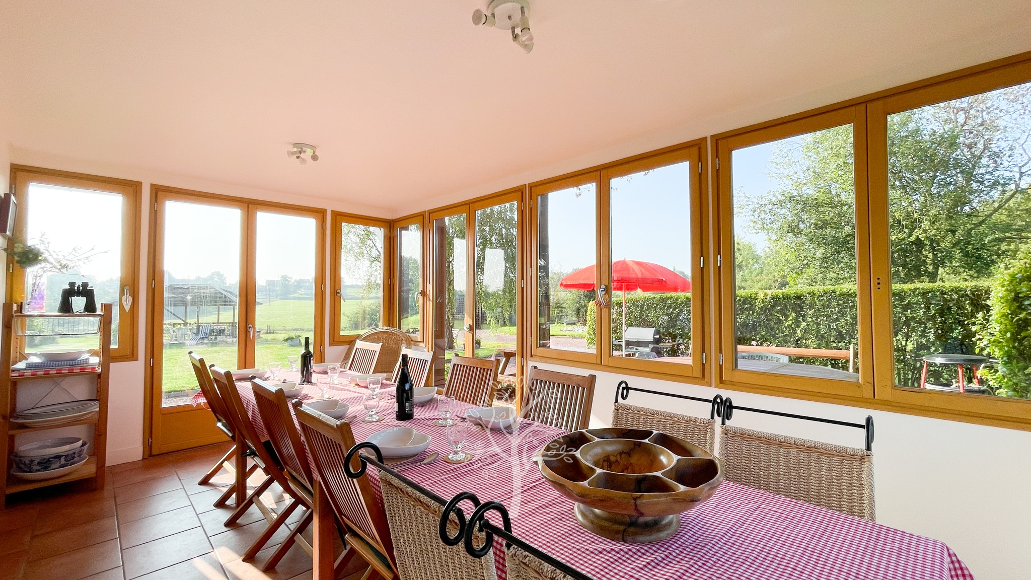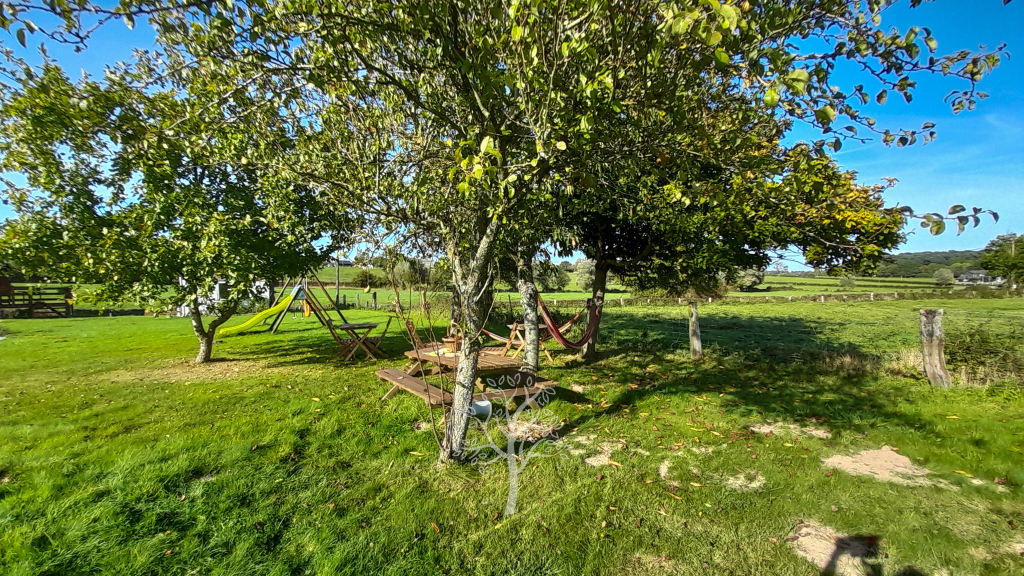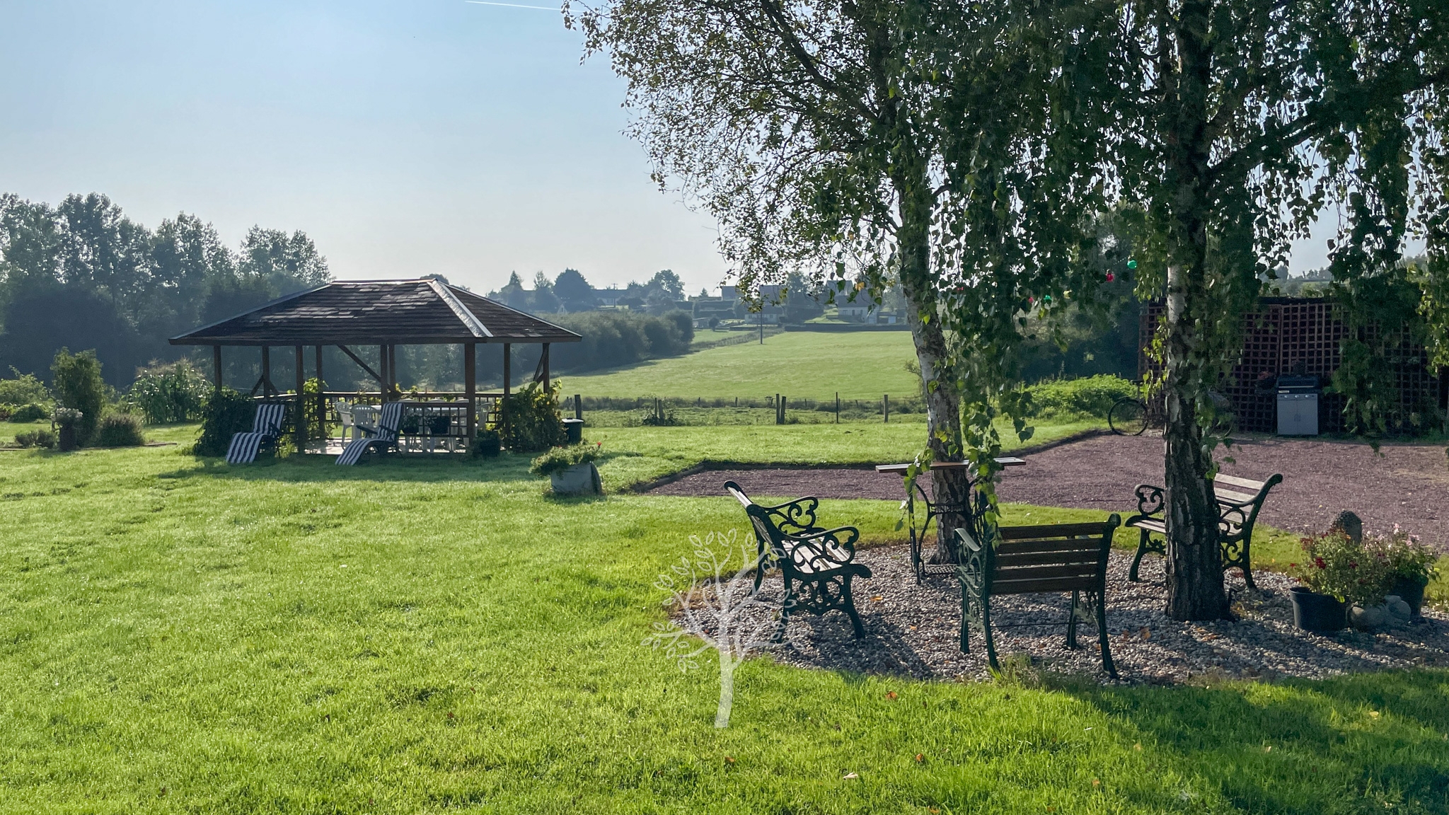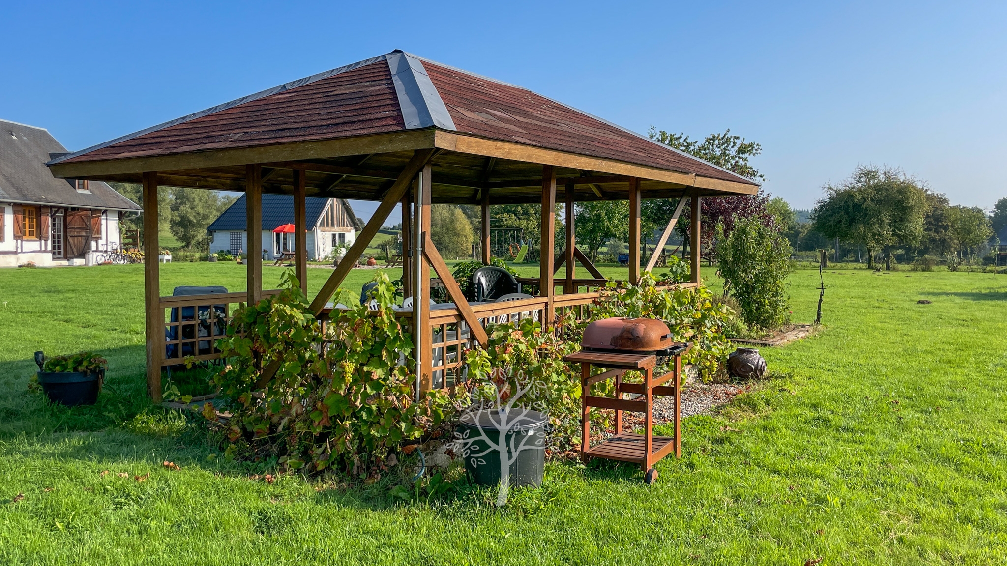 Une jolie gloriette en bois au milieu du jardin abrite, du soleil ou de la pluie, les heureux propriétaires qui souhaitent se relaxer au chant des oiseaux. La vue est dominante sur la campagne alentours.